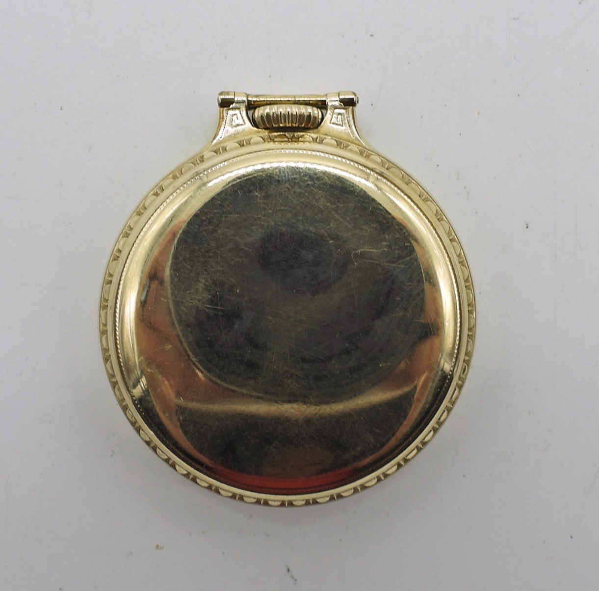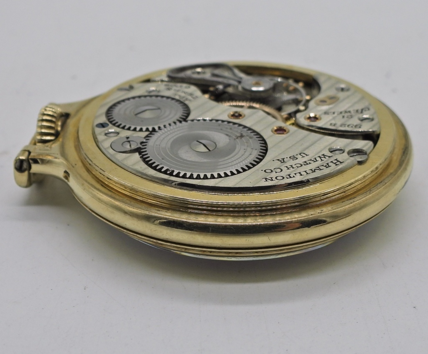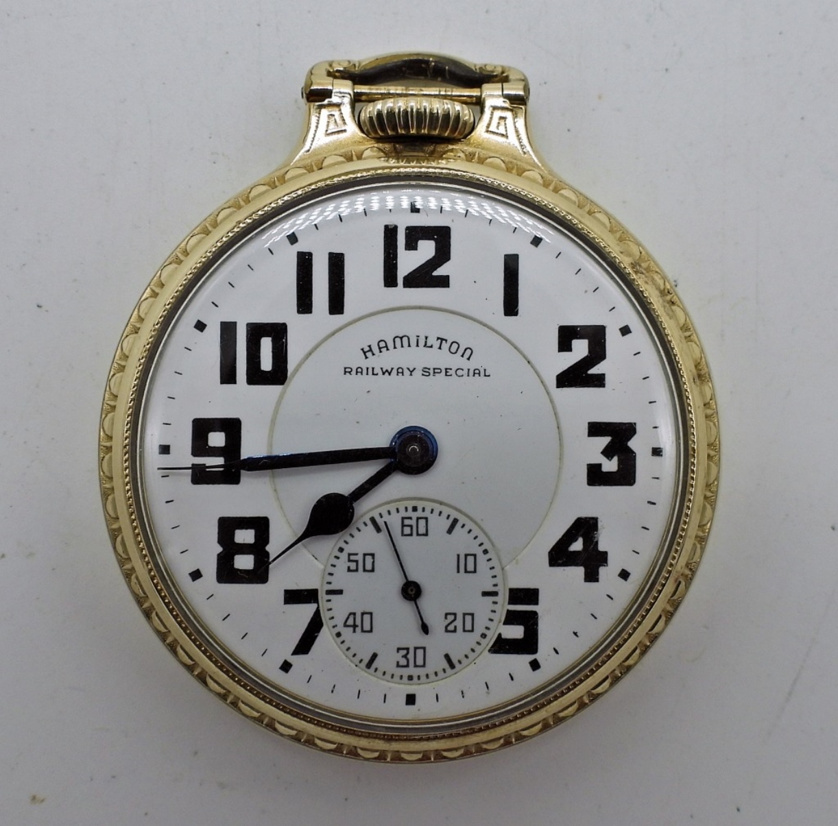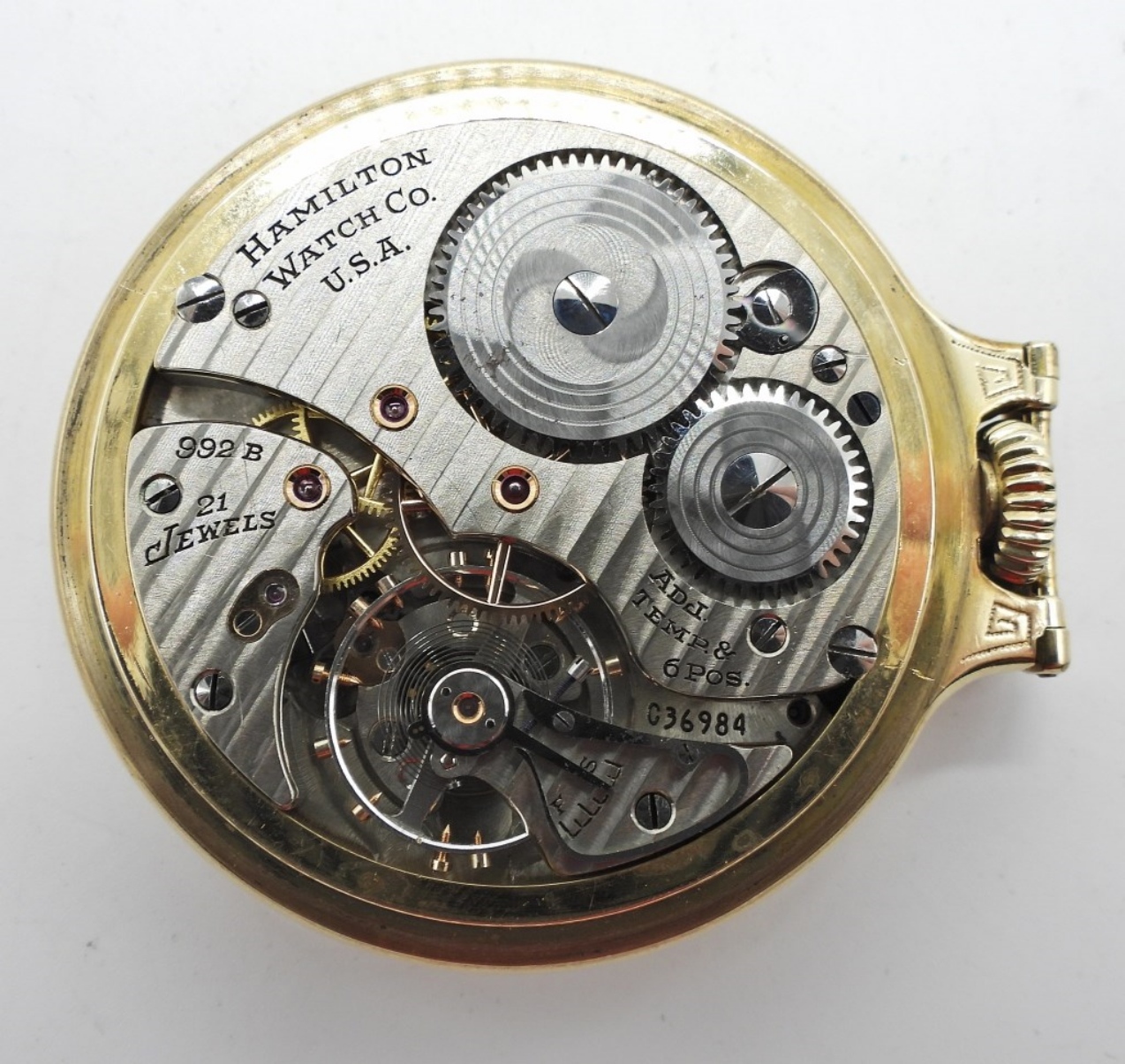 PERFECT DOUBLE SUNK PORCELAIN DIAL. 21 JEWEL, LEVER SET, GRADE 992B. YELLOW GOLD FILLED SCREWBACK “BAR OVER CROWN” HAMILTON CASE *All Pocket Watches tested to be in working order at the time of listing.
