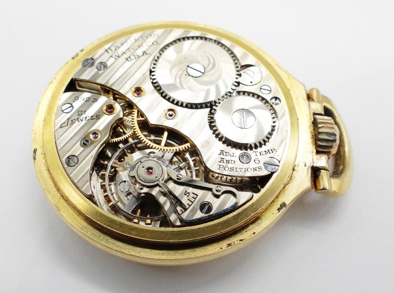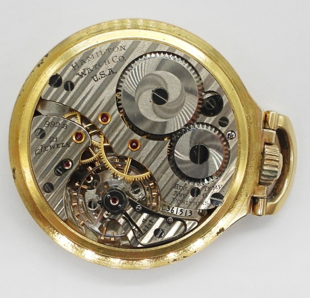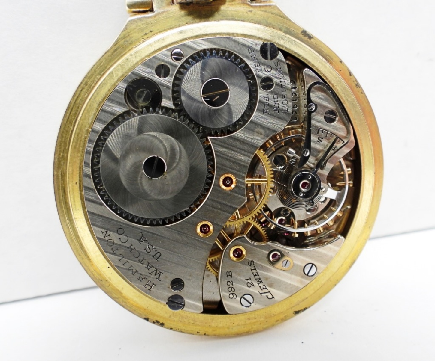 NICE ORIGINAL MONTGOMERY MELAMINE DIAL. 21 JEWEL LEVER SET GRADE 992B. YELLOW ROLLED GOLD PLATE SCREWBACK CASE SIGNED HAMILTON *All Pocket Watches tested to be in working order at the time of listing.