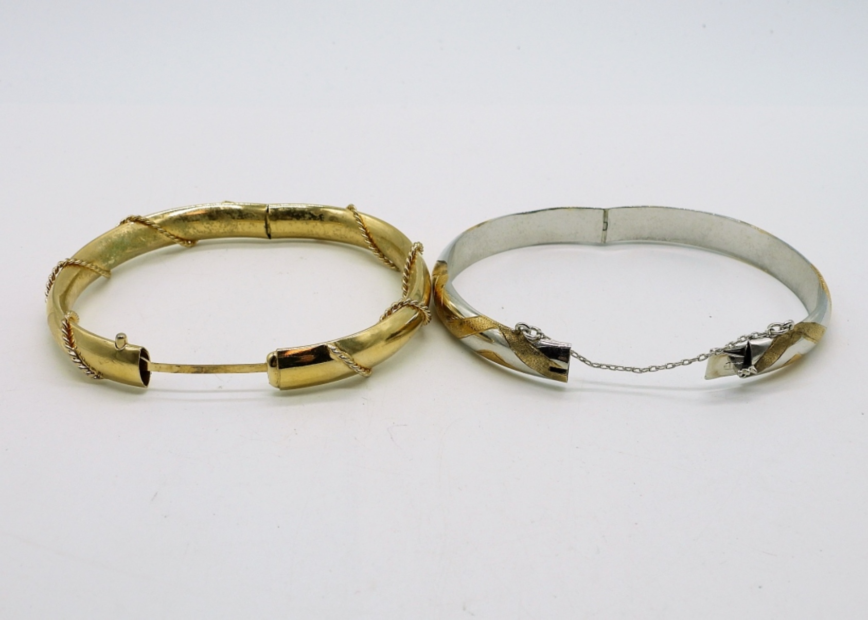 TWO VINTAGE GOLD AND SILVER FASHION BANGLE BRACELETS. 7″