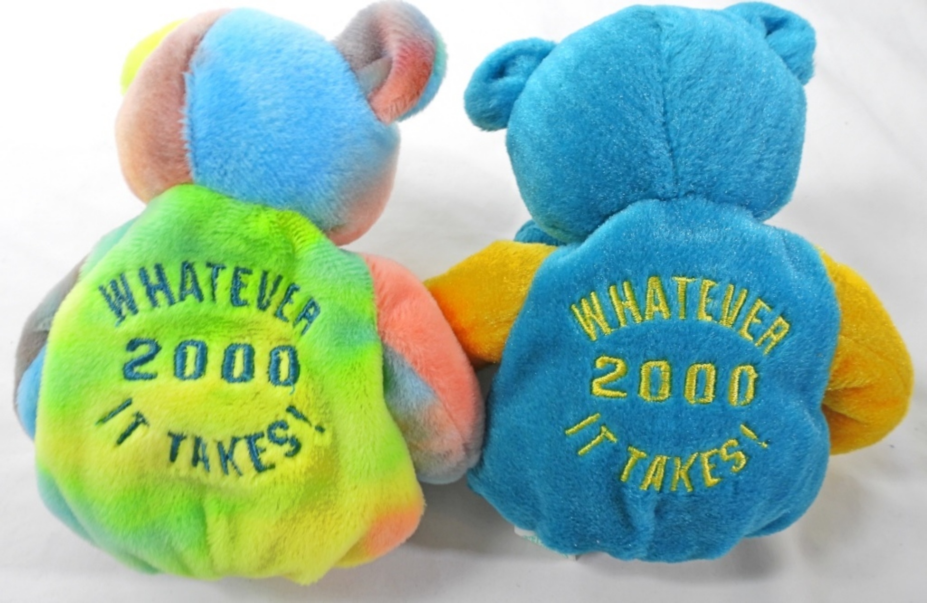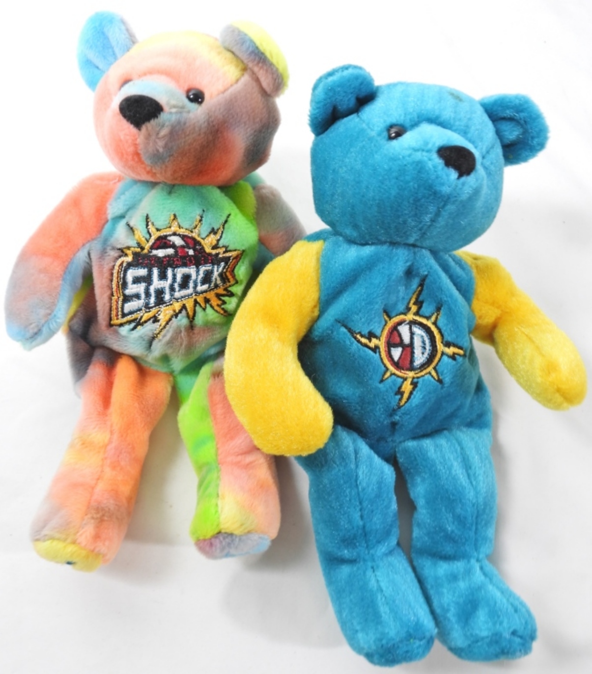 1 TIE-DYE BEAR WITH SHOCK LOGO ON FRONT #44 ON FEET, 1 BLUE AND YELLOW WITH DESIGN #24 ON FEET, WHATEVER 2000 IT TAKES ON BACK OF BOTH
