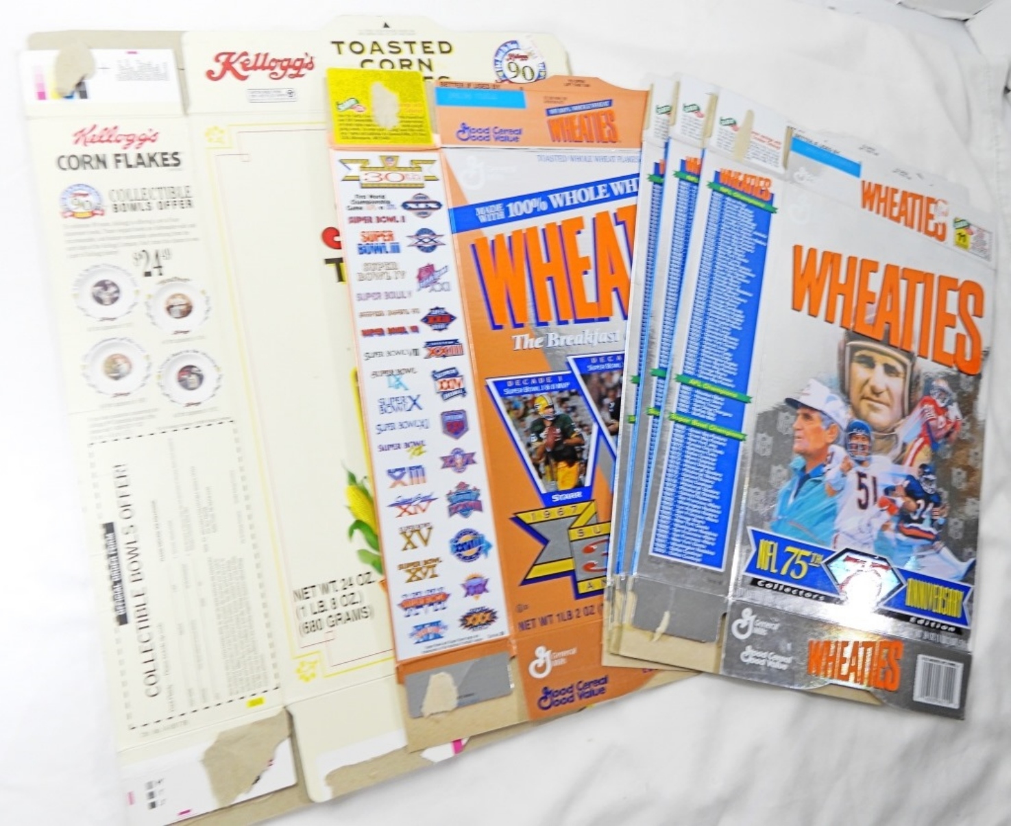 (3) WHEATIES NFL 75th ANNIV (1) WHEATIES 30th ANNIV SUPER BOWL & (1) VINTAGE KELLOGGS 1995