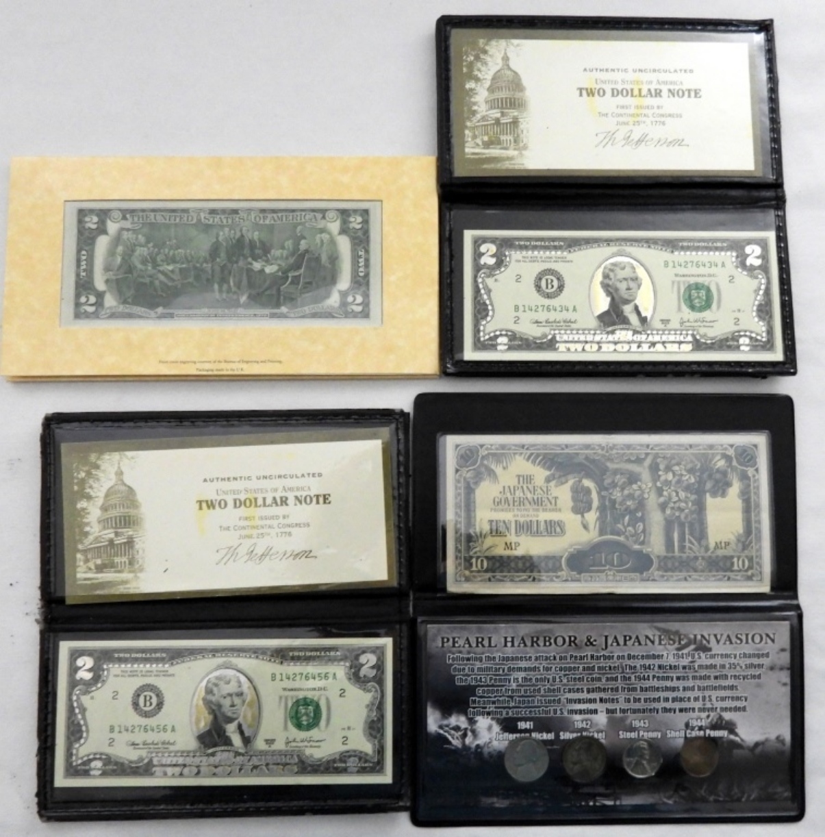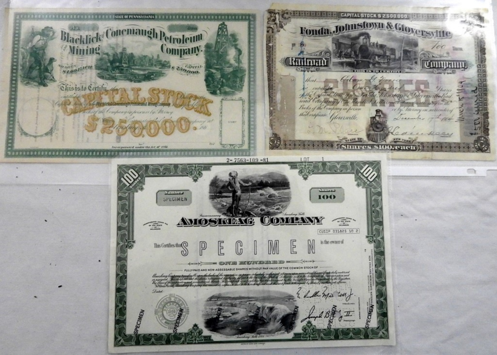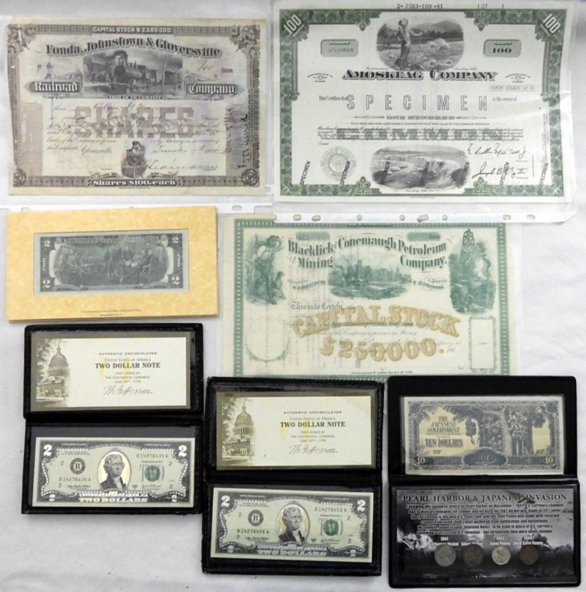3-$2 NOTES-UNC, THE THOMAS JEFFERSON COINAGE & CURRENCY SET, AMOSKEAG COMPANY STOCK CERTIFICATE “SPECIMEN”, 1904 FONDA, JOHNSTOWN, & GLOVERSVILLE RAILROAD CO. STOCK CERTIFICATE- 100 SHARES, AND BLACKLICK AND