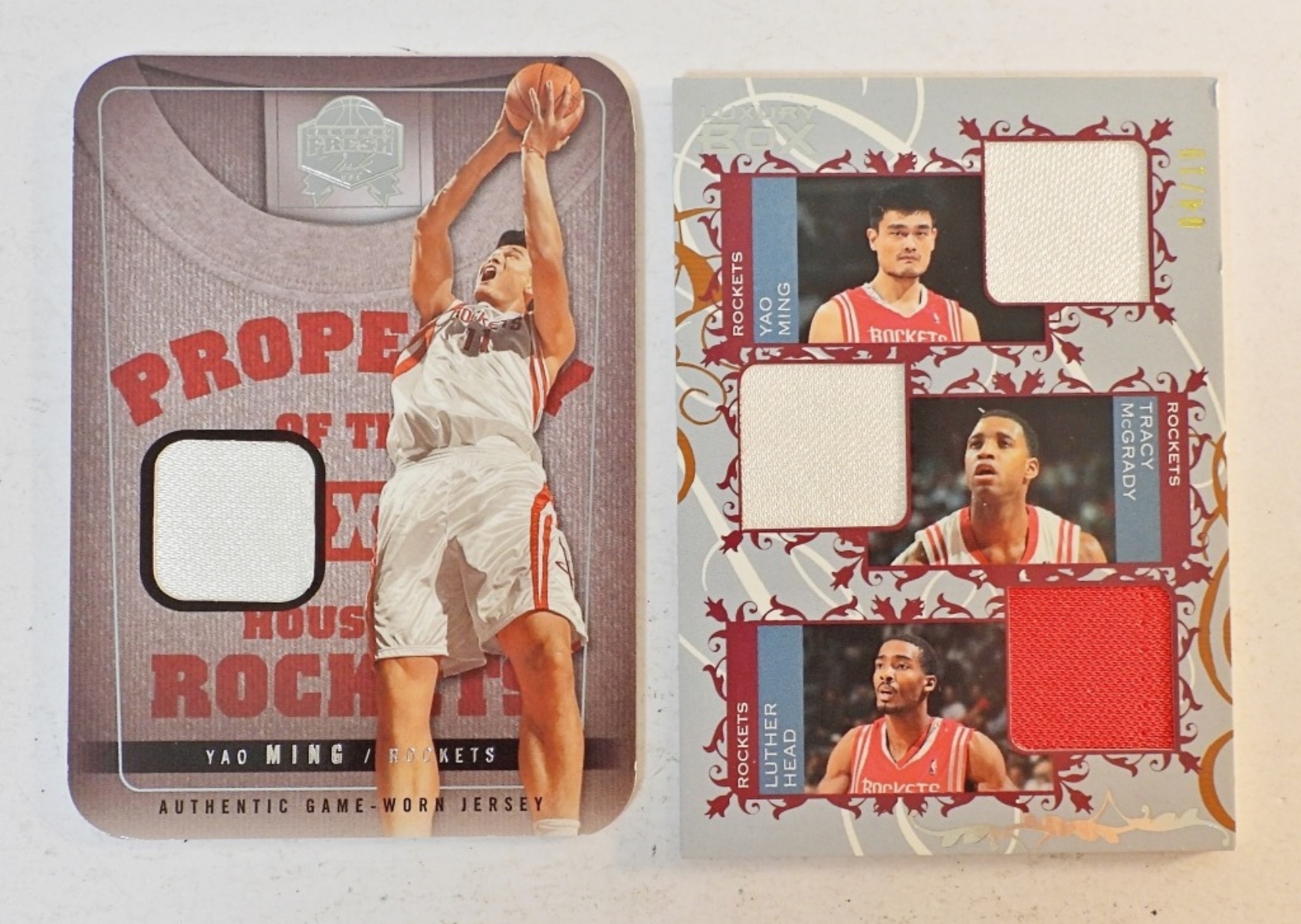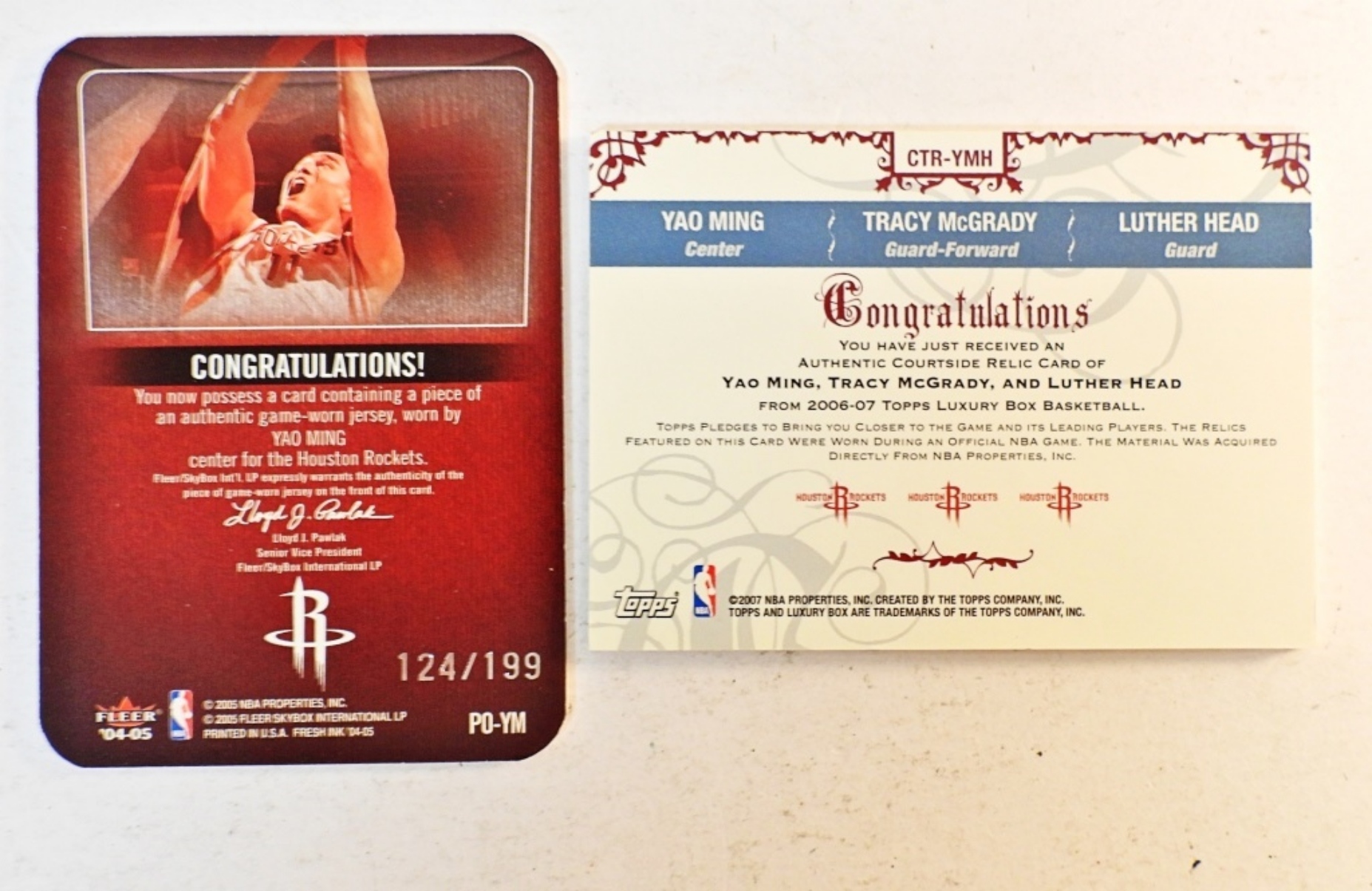 YAO MING, TRACEY MCGRADY, LUTHER HEAD 2006-07 TOPPS LUXURY BOX TRIPLE GAME-USED PATCH CARD. NUMBERED 04/19. FLEER ’04-05 YAO MING JERSEY PATCH CARD, NUMBERED 124/199.