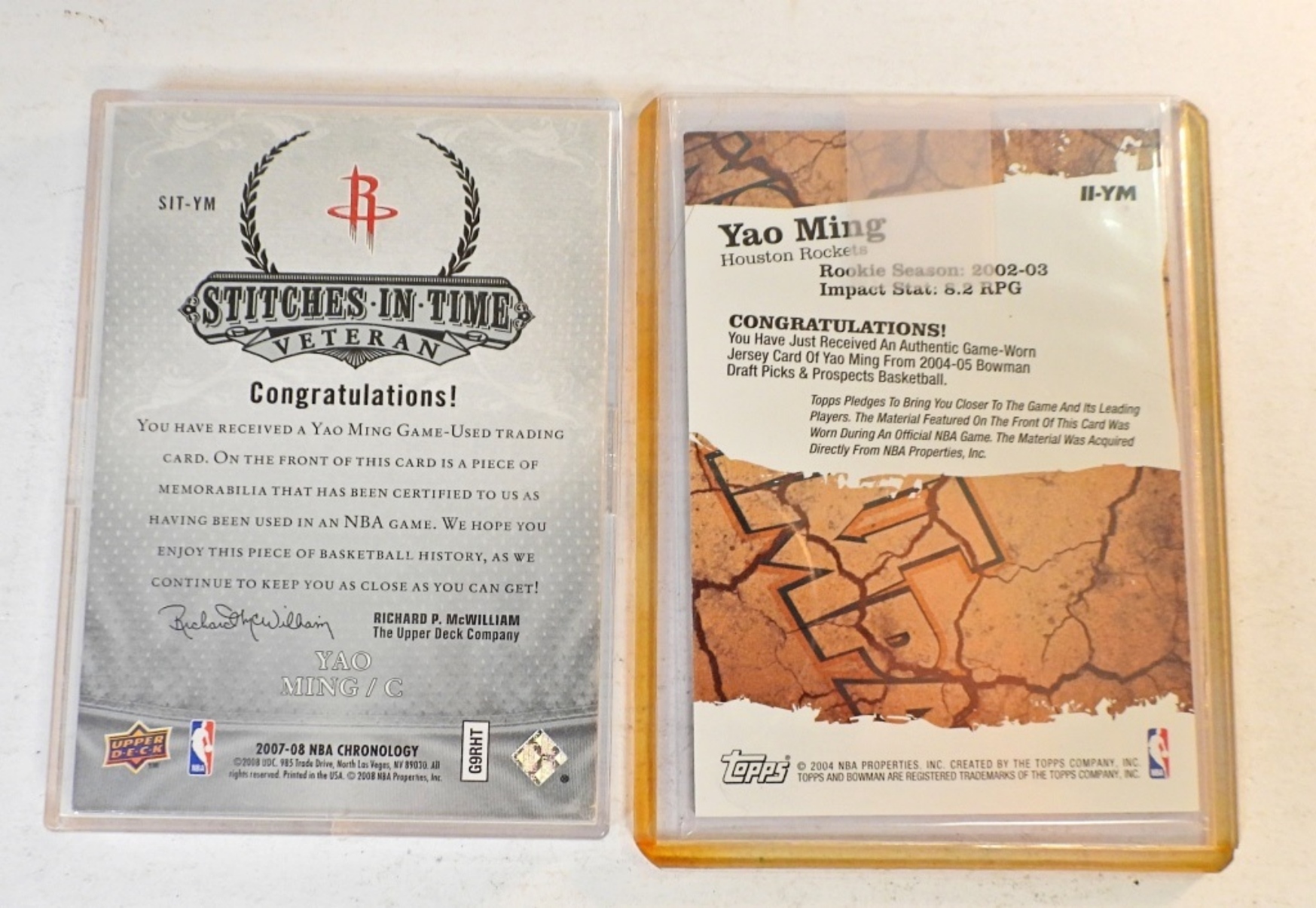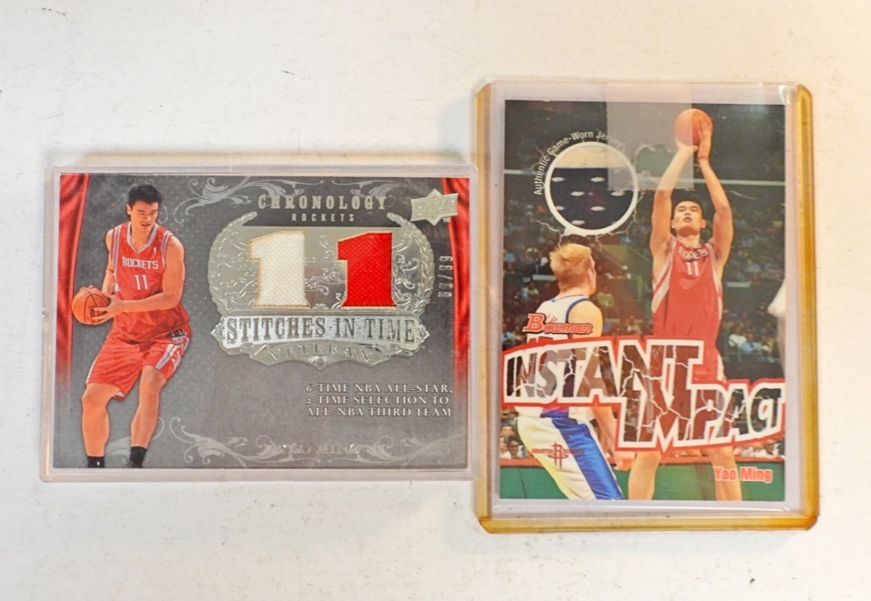 UPPER DECK CHRONOLOGY STITCHES IN TIME VETERAN JERSEY CARD 89/99. BOWMAN INSTANT IMPACT YAO MING JERSEY PATCH CARD 2002-03 NOT NUMBERED.