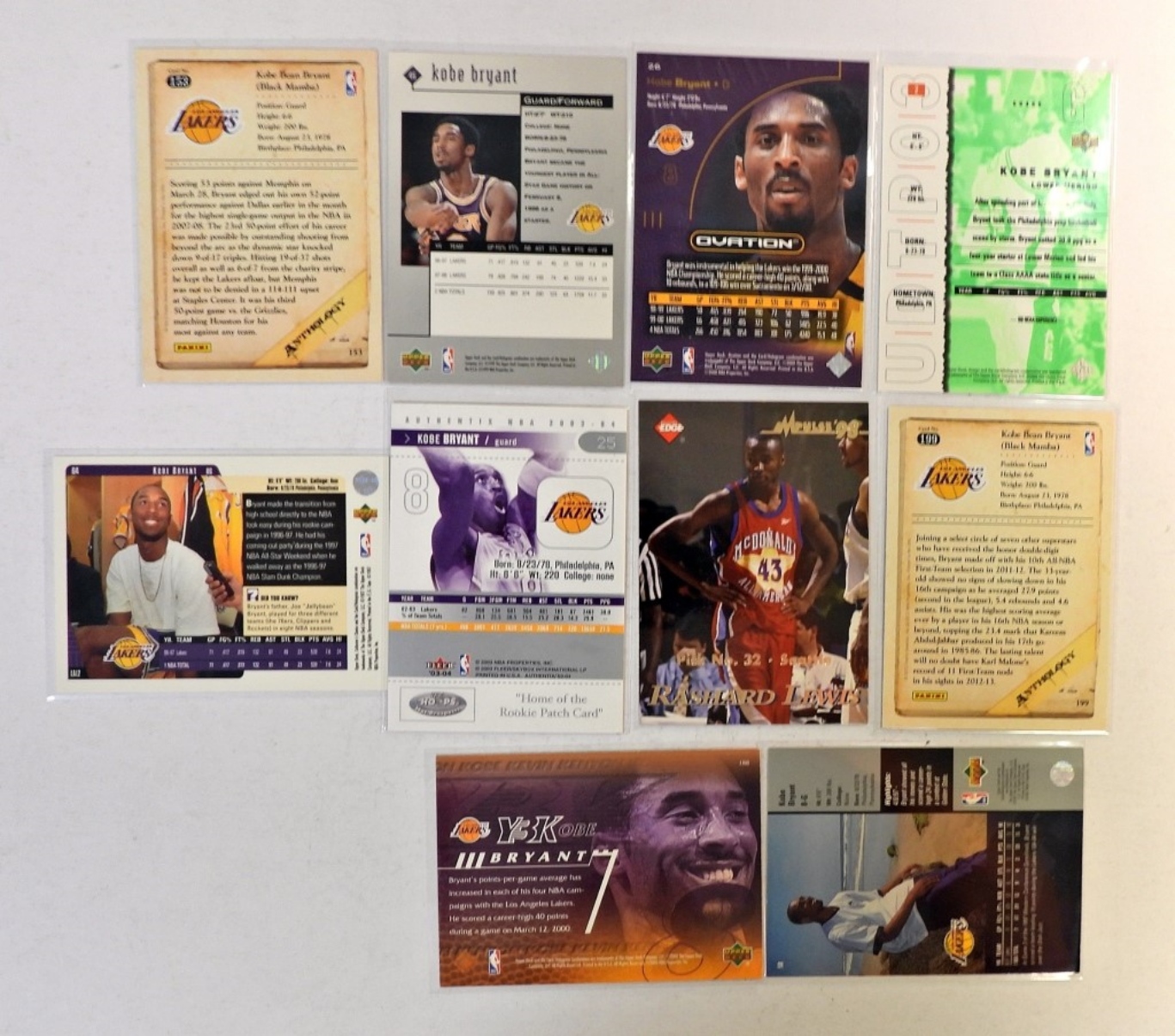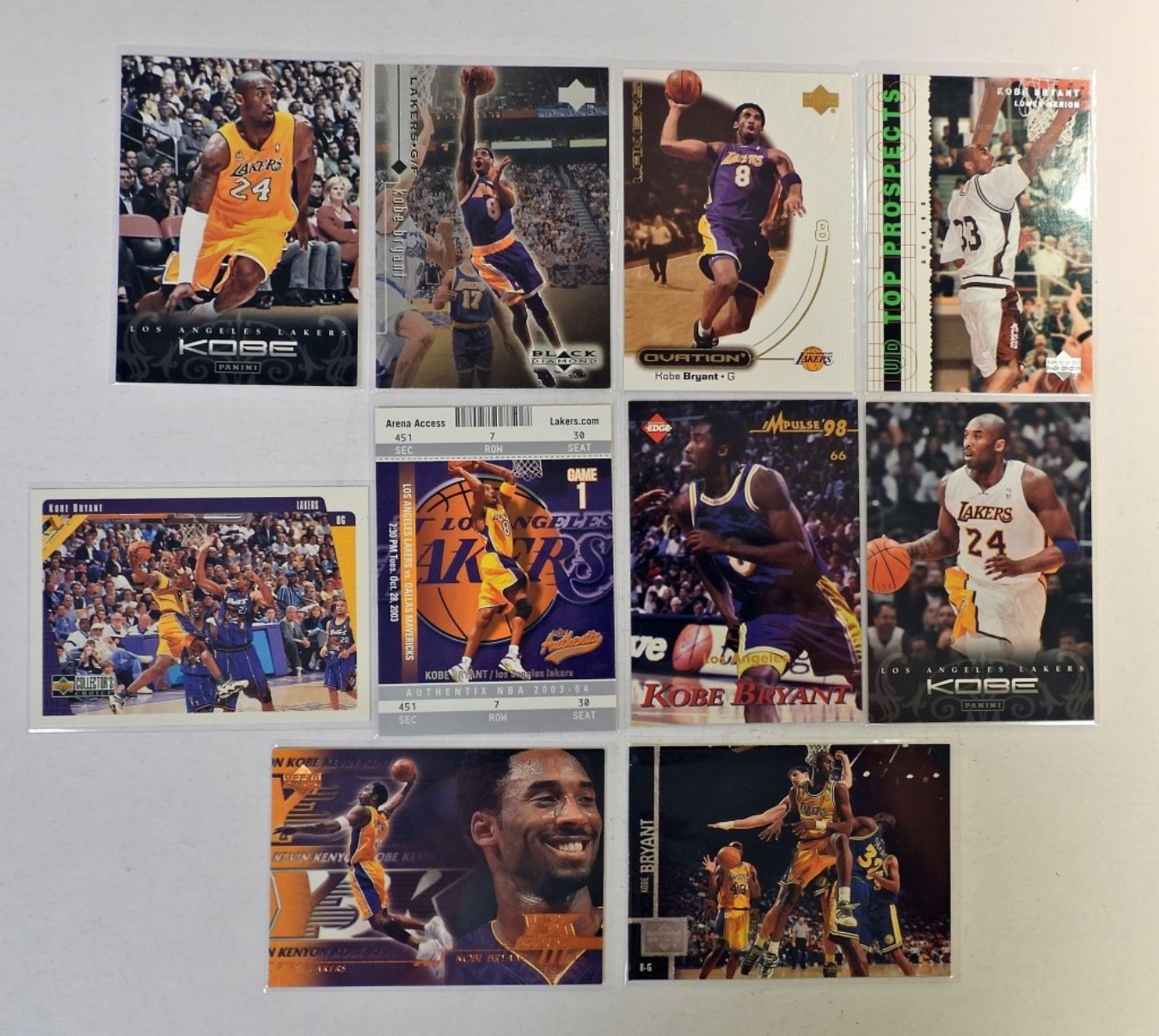 TEN KOBE BRYANT PREMIUM BASKETBALL CARDS, ALL DIFFERENT AND IN NICE CONDITION.