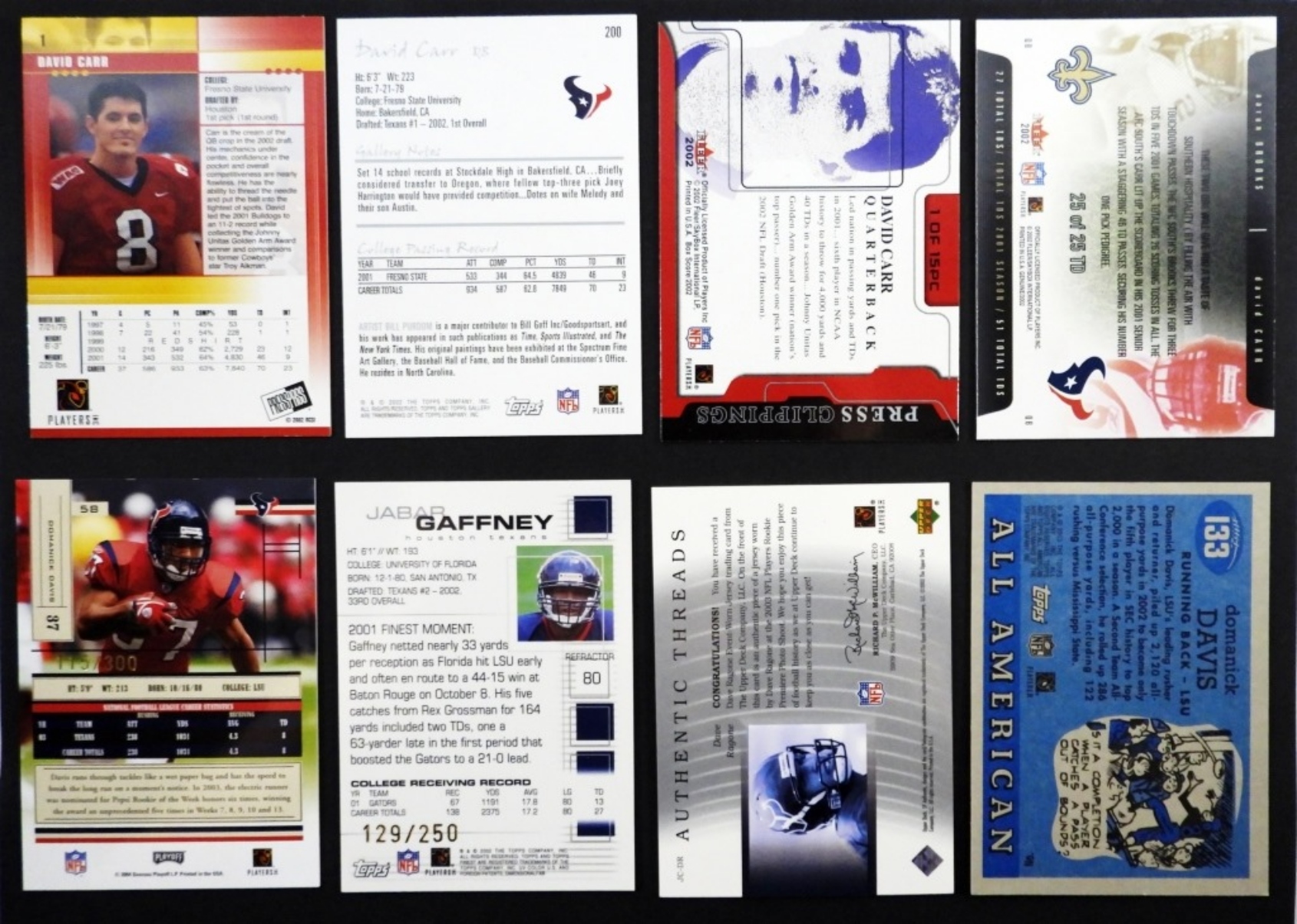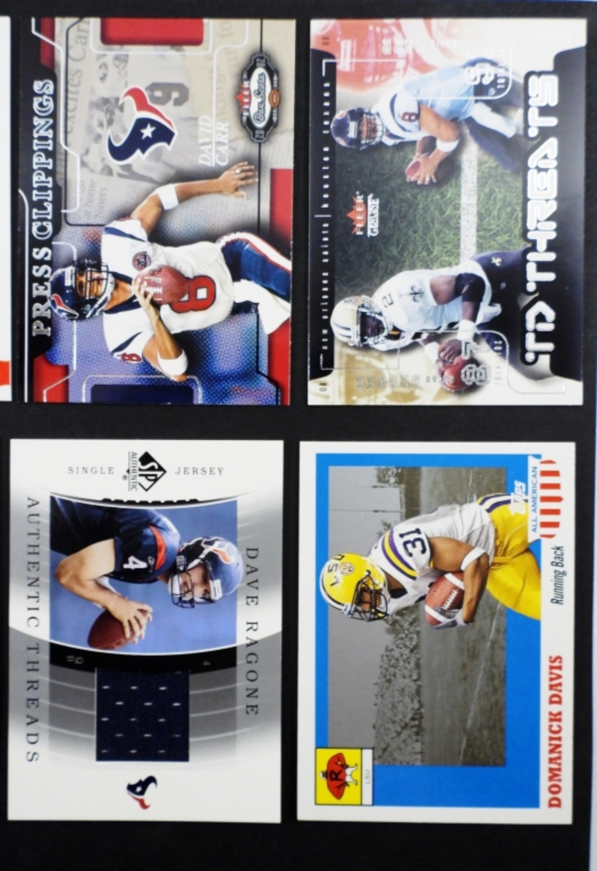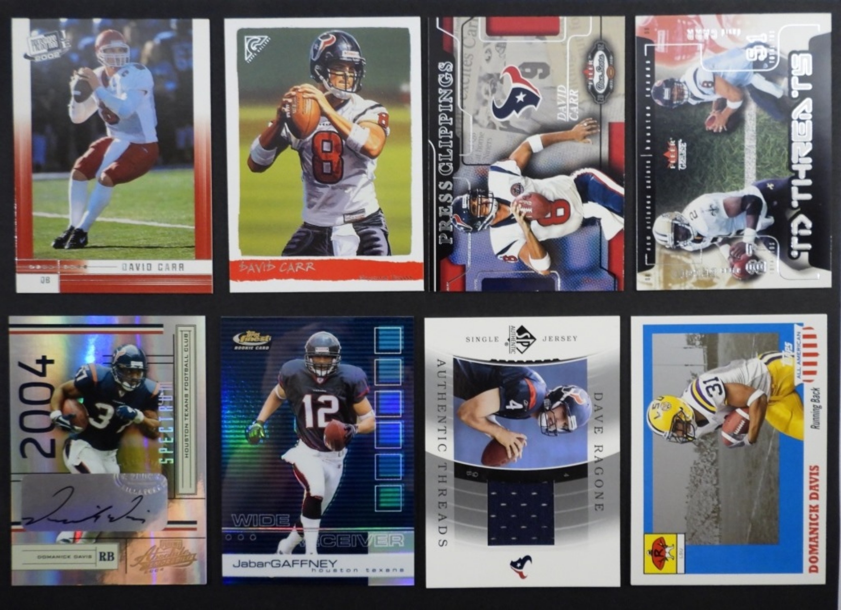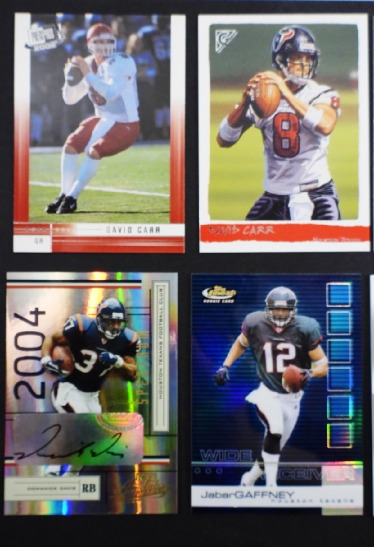 3- DAVID CARR-2002 PRESS PASS JE #1 ROOKIE, 2002 TOPPS GALLERY #200 ROOKIE, 2002 FLEER BOX SCORE ROOKIE PRESS CLIPPINGS 1 OF 15, 1- AARON BROKS- 2002 FLEER GENUINE ROOKIE TD THREATS 25 OF 25, 2- DOMANICK DAVIS- 2004