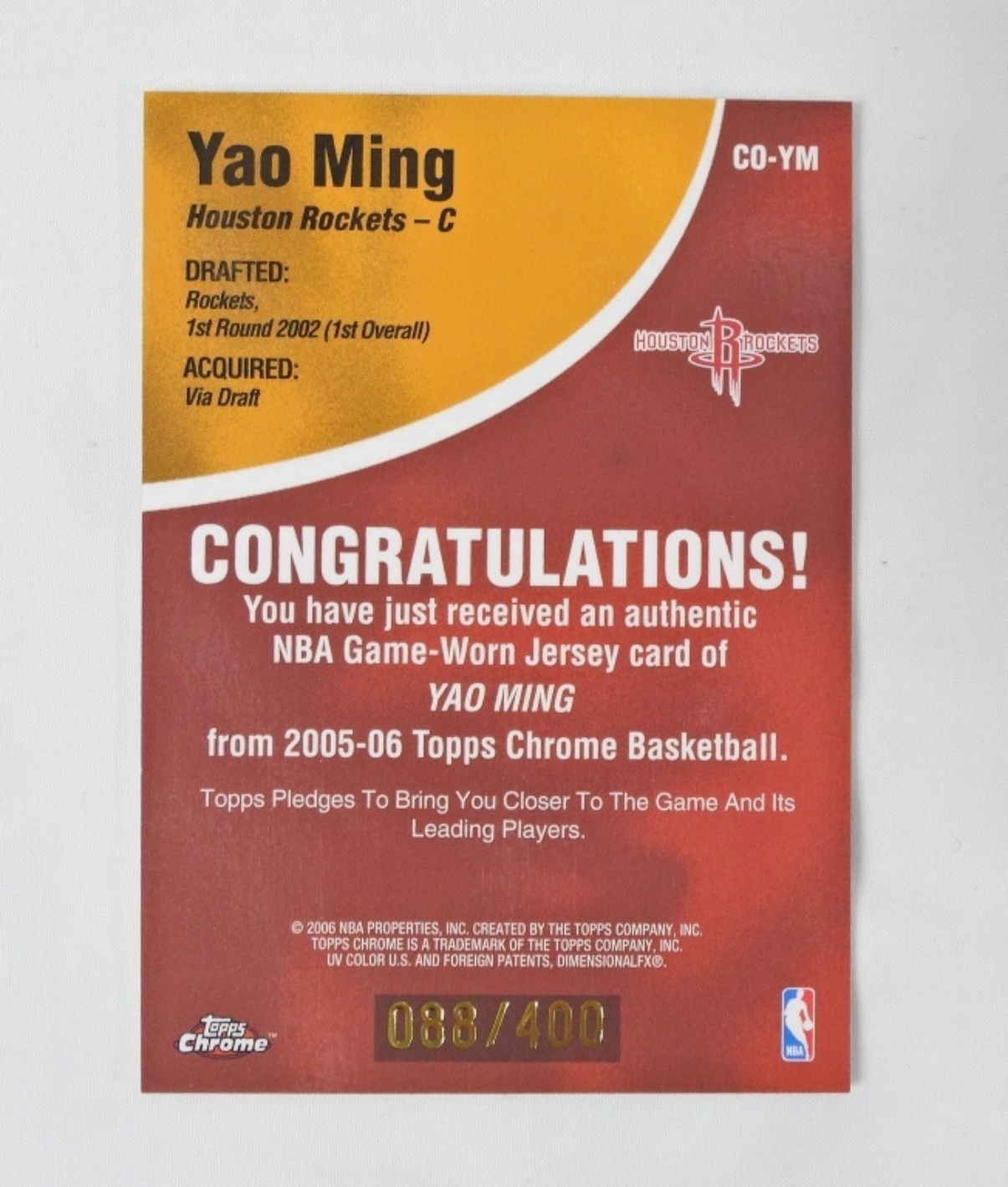 TOPPS CHOSEN ONE YAO MING 2005-06 JERSEY PATCH CARD, LIMITED # 88/400-RED JERSEY.