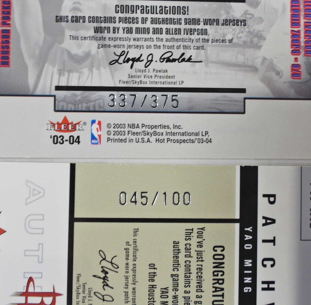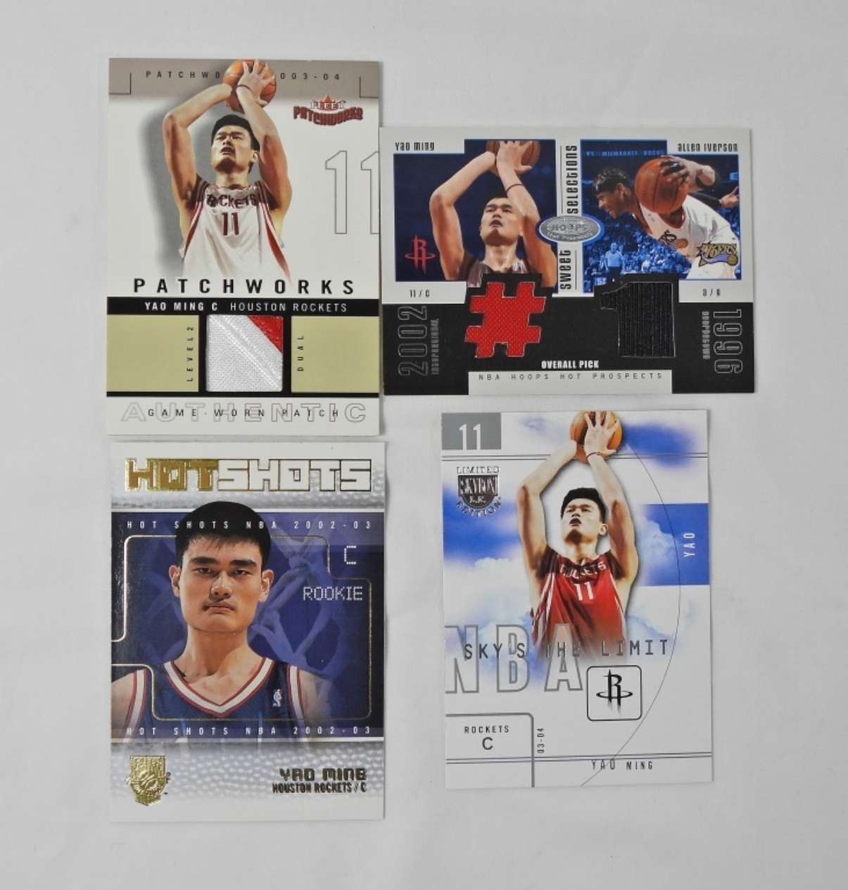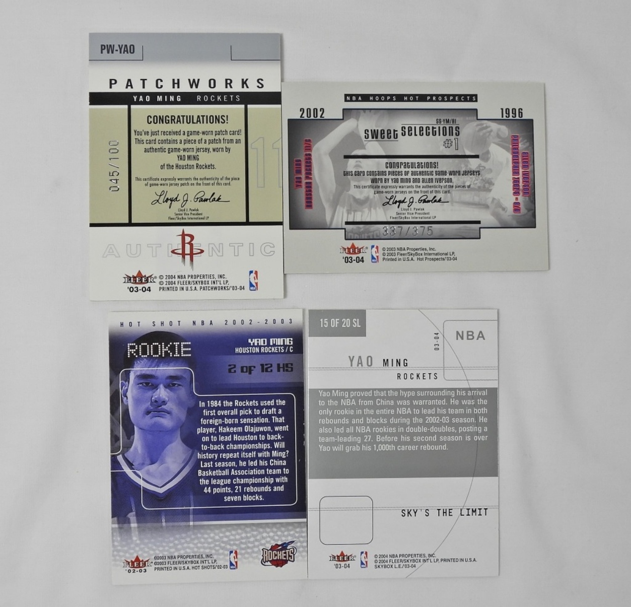 (2) YAO MING JERSEY PATCH CARDS. LTD# 45/100 & 337/375. FLEER YAO MING ROOKIE CARD & SKY’S THE LIMITED YAO MING CARD.