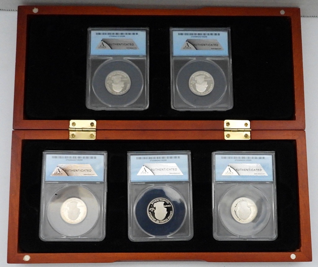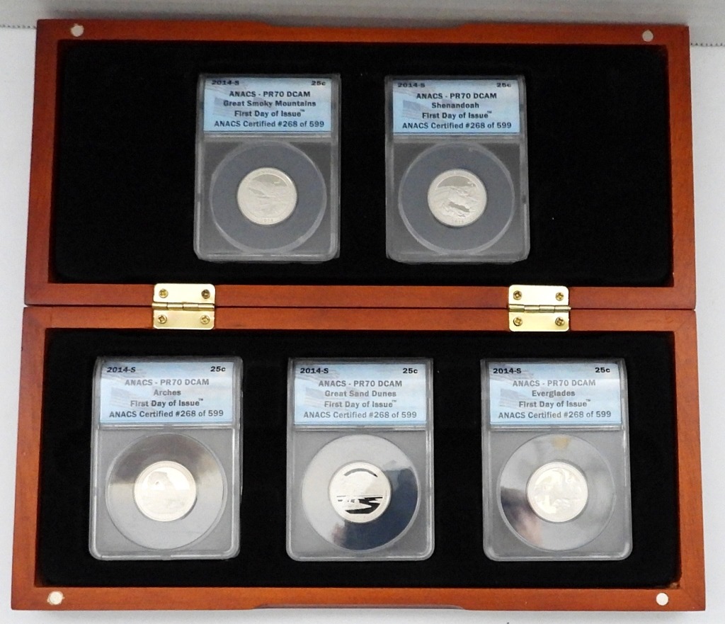 (5) FIRST DAY OF ISSUE CLAD QUARTERS IN WOODEN DISPLAY CASE W/ COA. GREAT SMOKY MOUNTAINS, SHENANDOAH, ARCHES, GREAT SAND DUNES, & EVERGLADES.