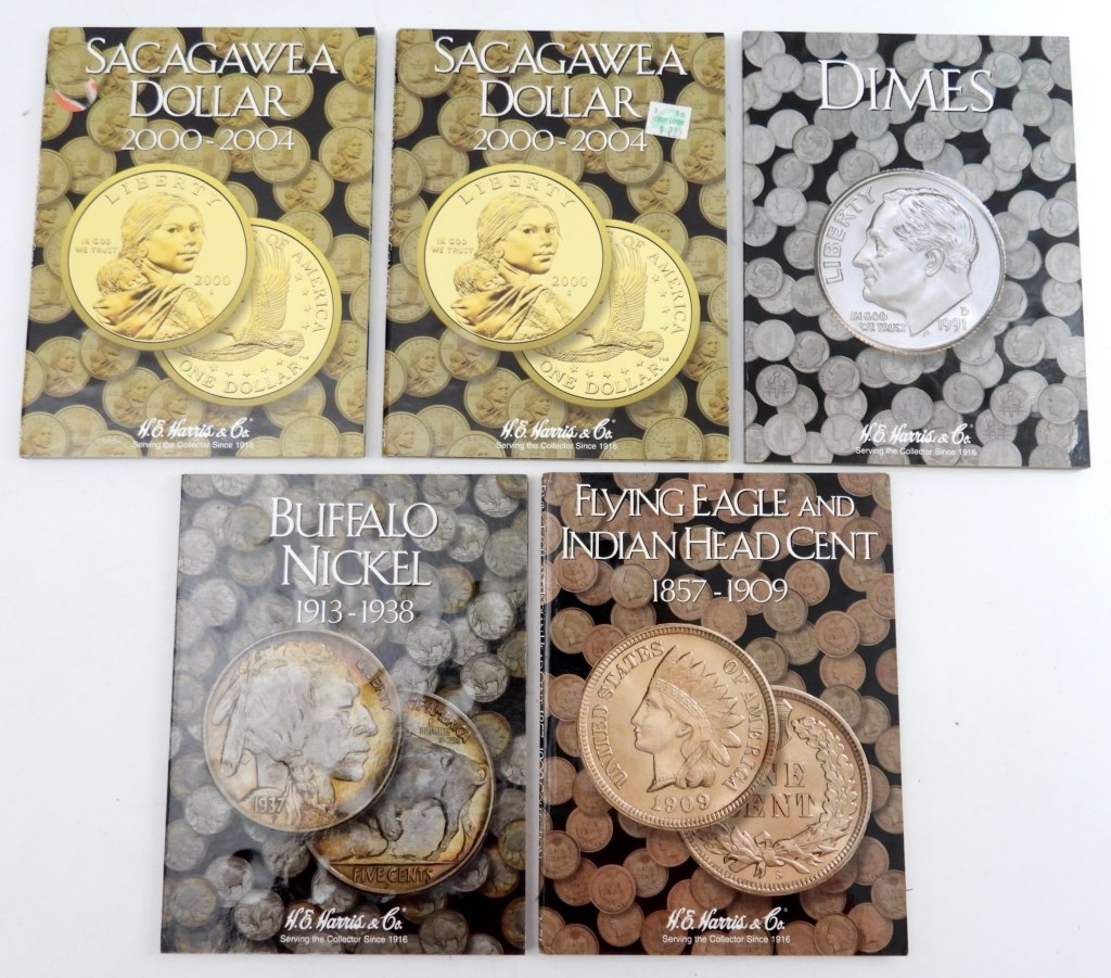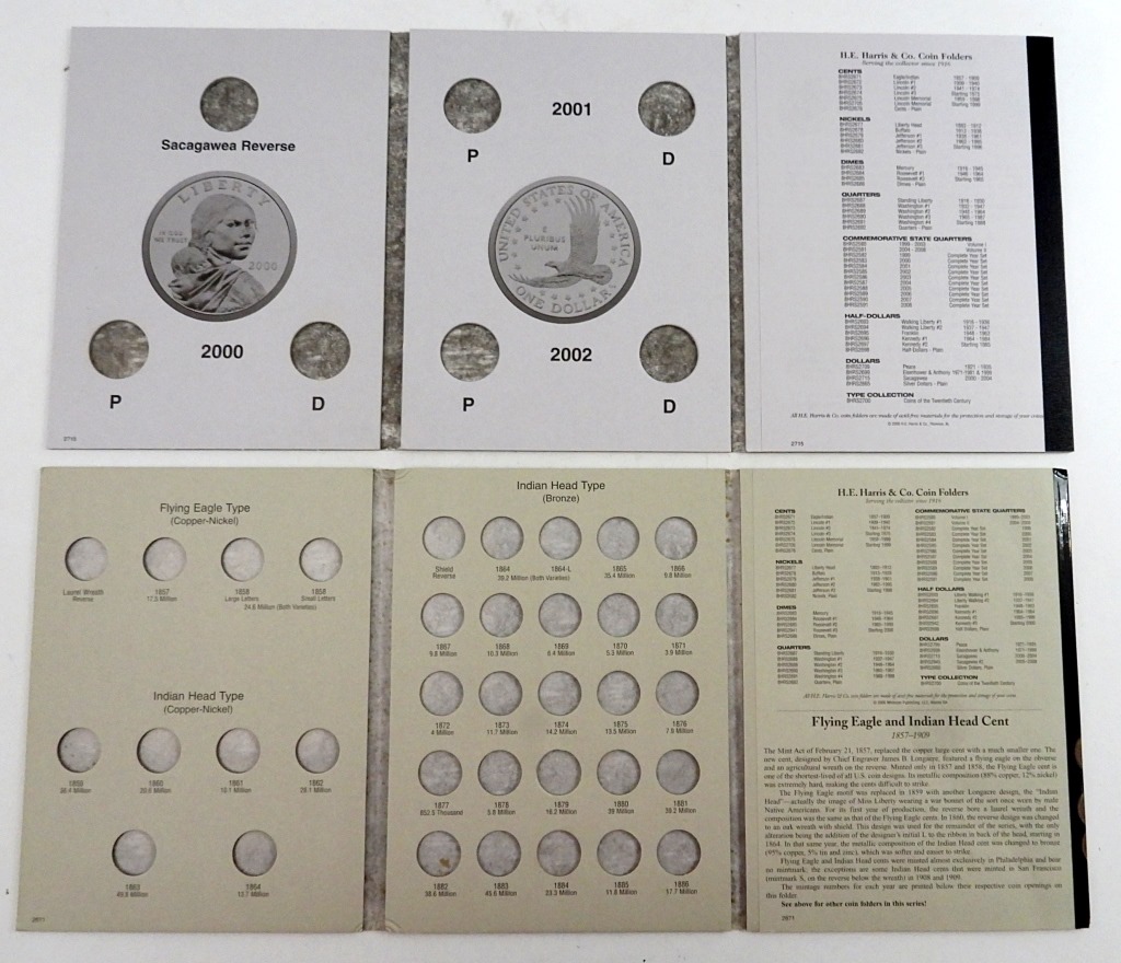 EPMTY. FLYING EAGLE/INDIAN HEAD CENTS 1857-1909, BUFFALO NICKEL 1913-1938, DIMES, & (2) SACAGAWEA DOLLAR 2000-2004.