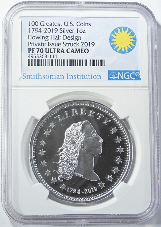 100 GREATEST U.S. COINS FLOWING HAIR DESIGN, PRIVATE ISSUE. SMITHSONIAN LABEL