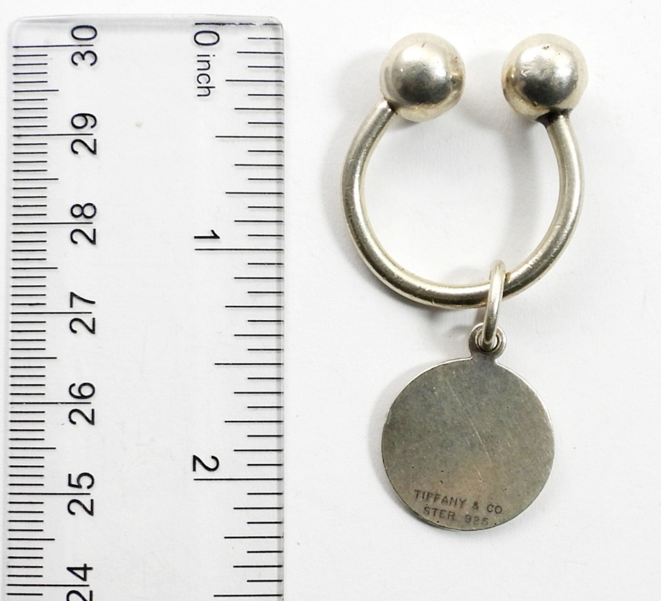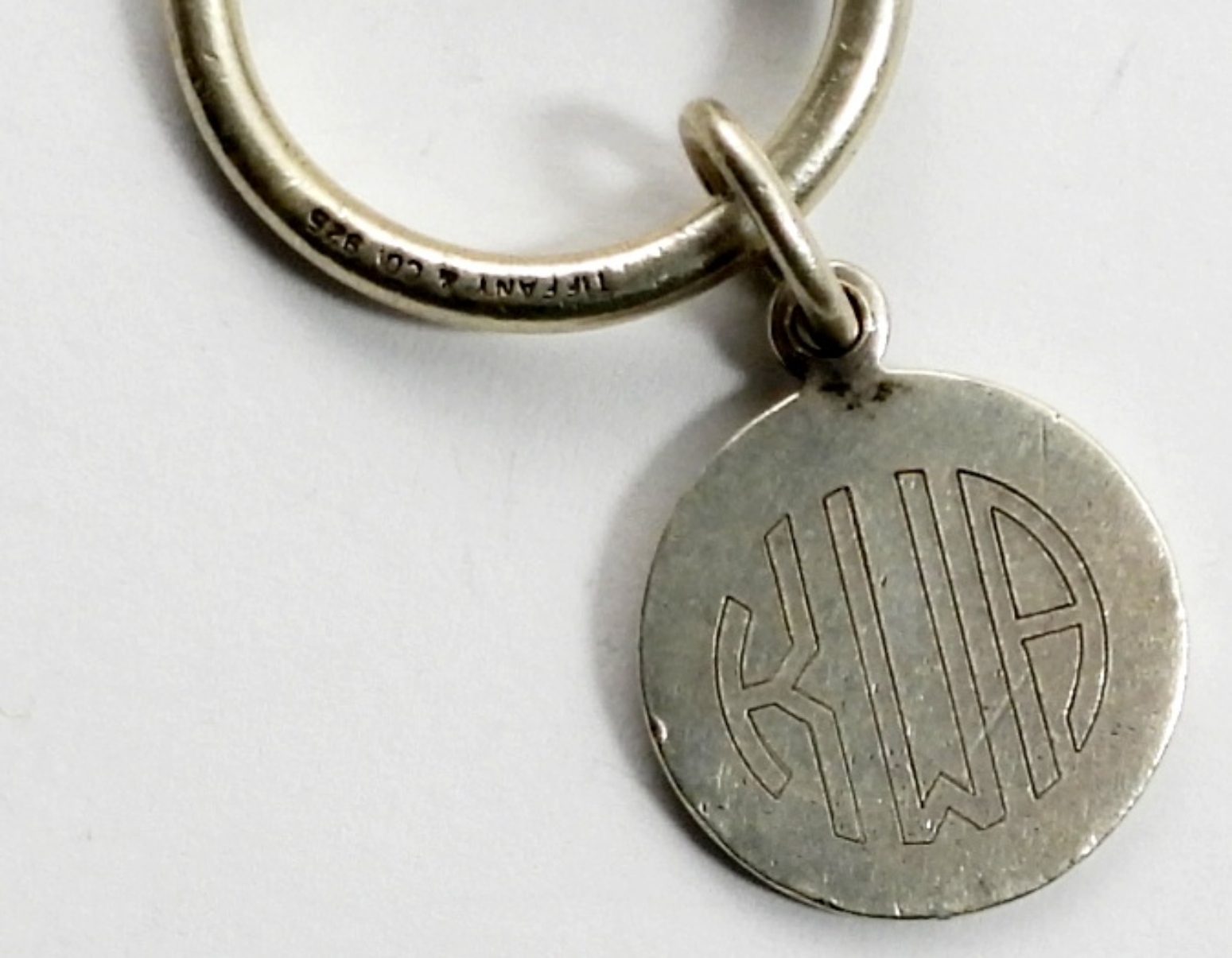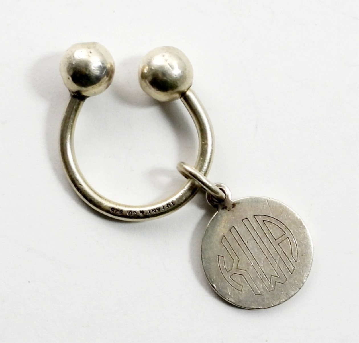CURVED BARBEL STYLE KEYCHAIN (MARKED TIFFANY & CO 925) WITH A CHARM ENGRAVED WITH “KWA” AND MARKED “TIFFANY & CO 925” ON BACK. 6.4 DWT