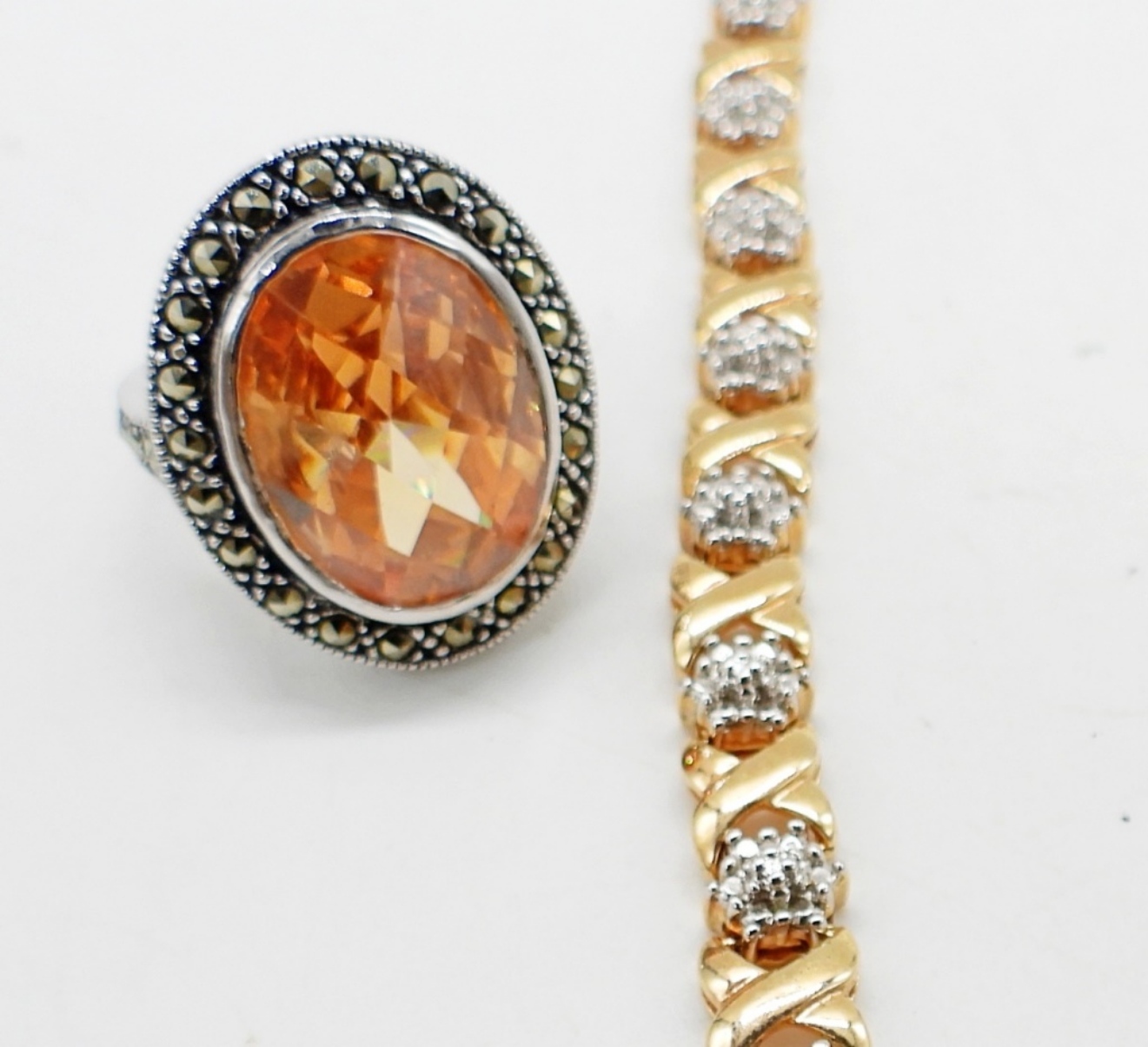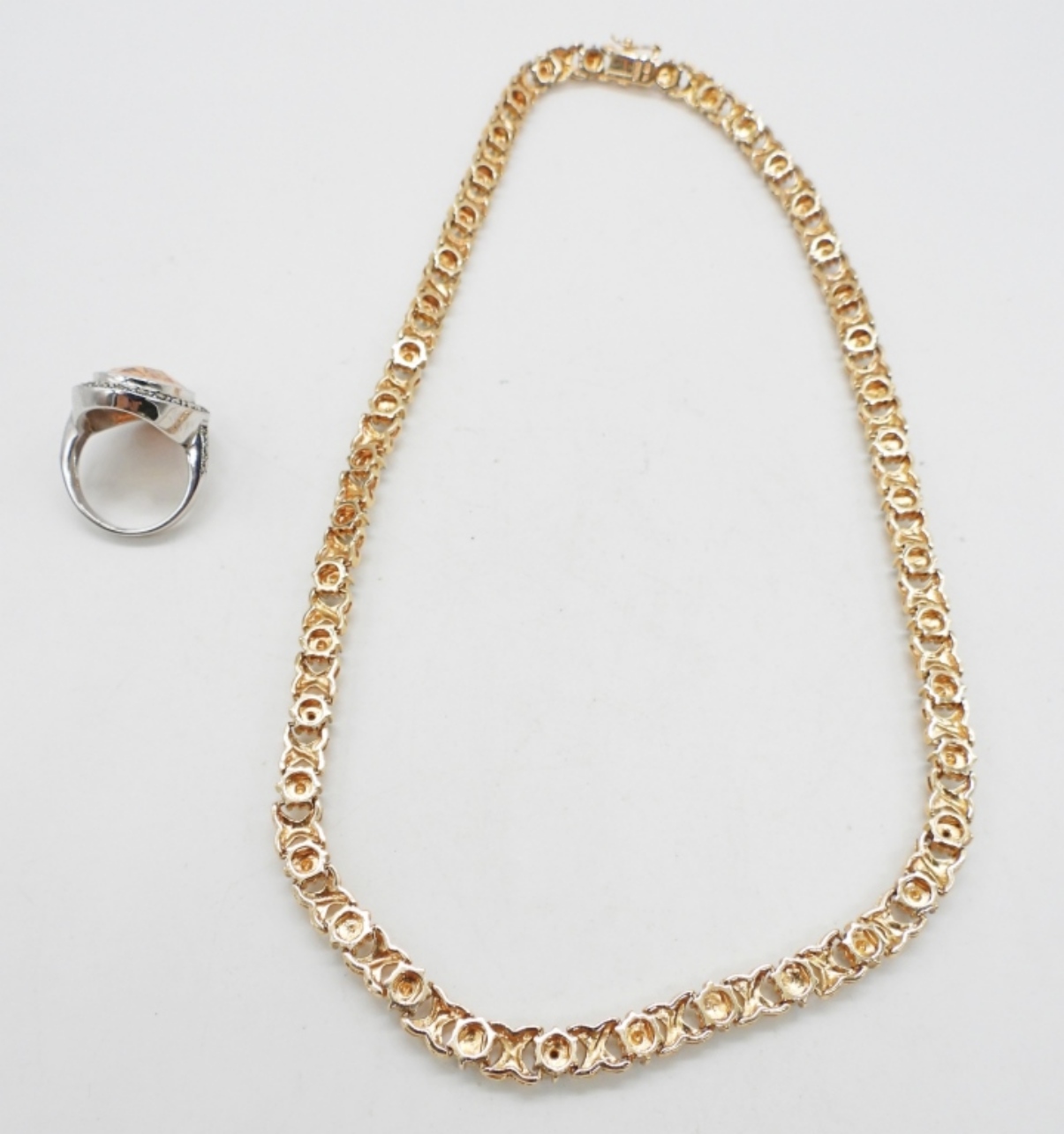 Sterling Gold Tone Necklace with Clear Gemstones, 17″ Marked 925 China. Ring size 6.5, Sterling with large Peach Colored Gemstone. 28.7 DWT