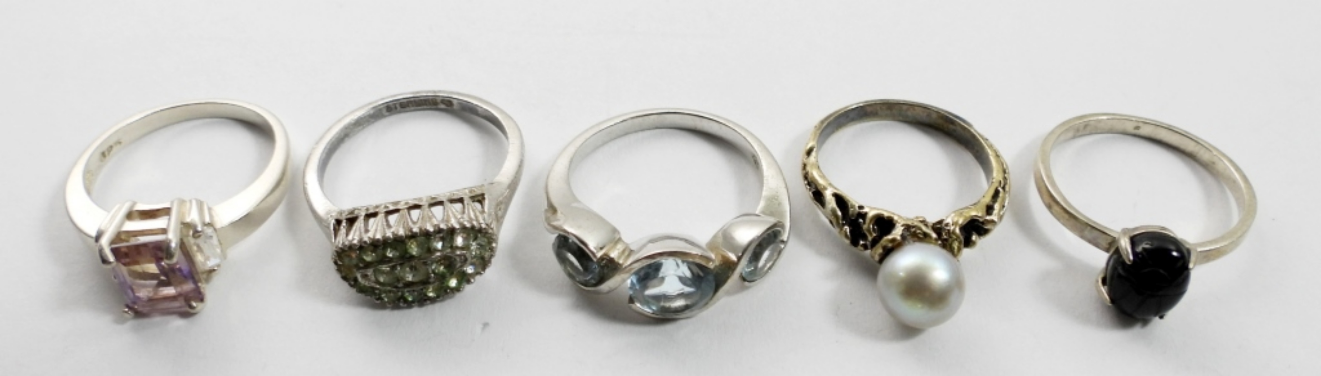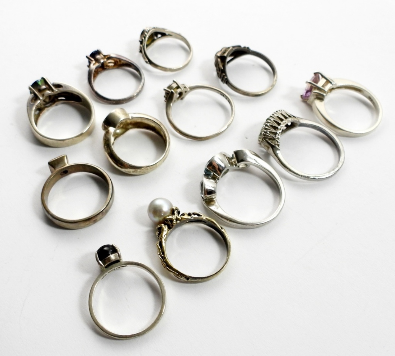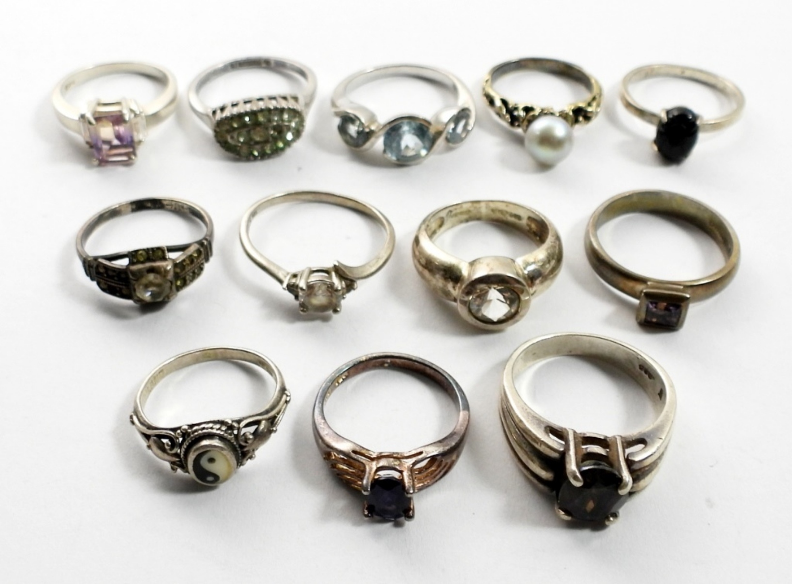 12 STERLING RINGS WITH VARIOUS GEMSTONES IN VARIOUS STYLES. SIZES 4.5-7. 22.6 DWT