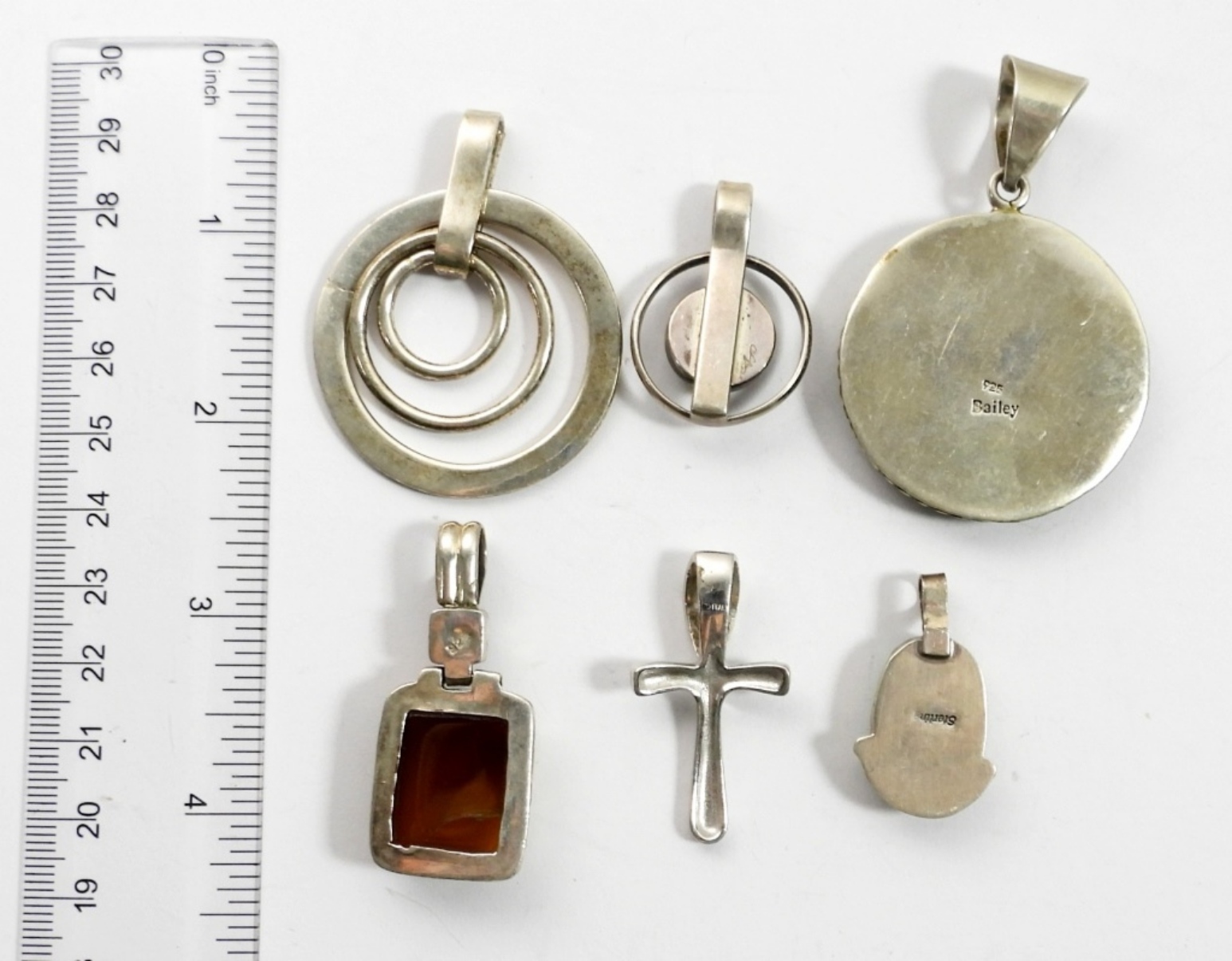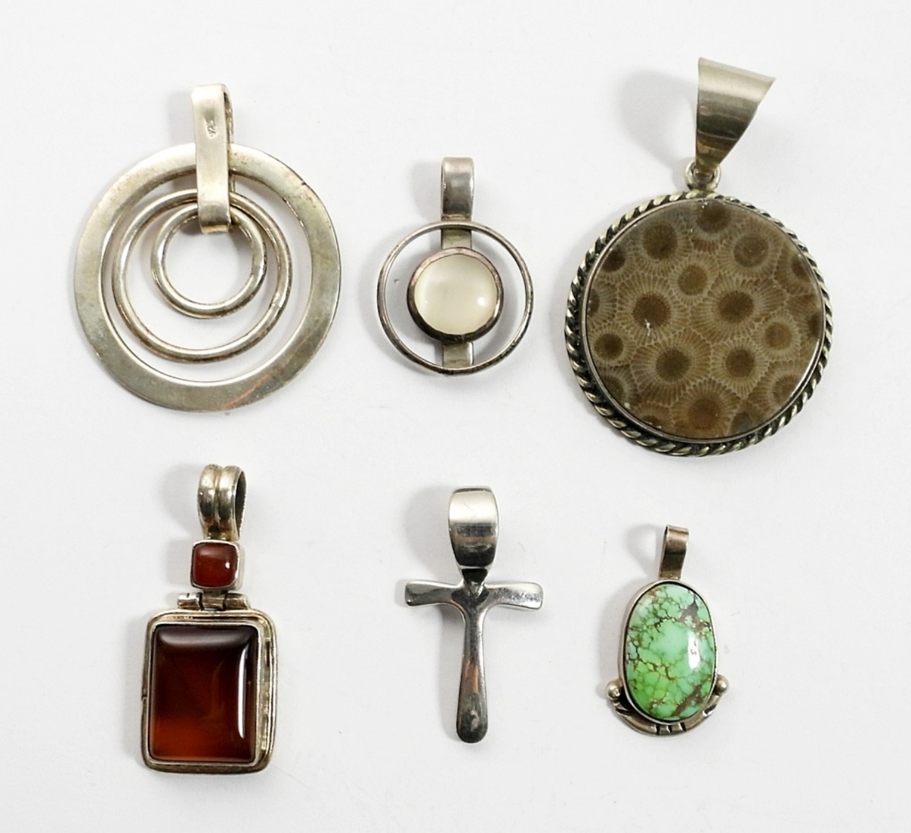 SIX STERLING PENDANTS WITH NATURAL GEMSTONES. CARNELIAN, TURQUOISE & MORE. PENDANTS VARY IN SIZE FROM 1.5″ TO 2.5″ LONG. 48.8 DWT