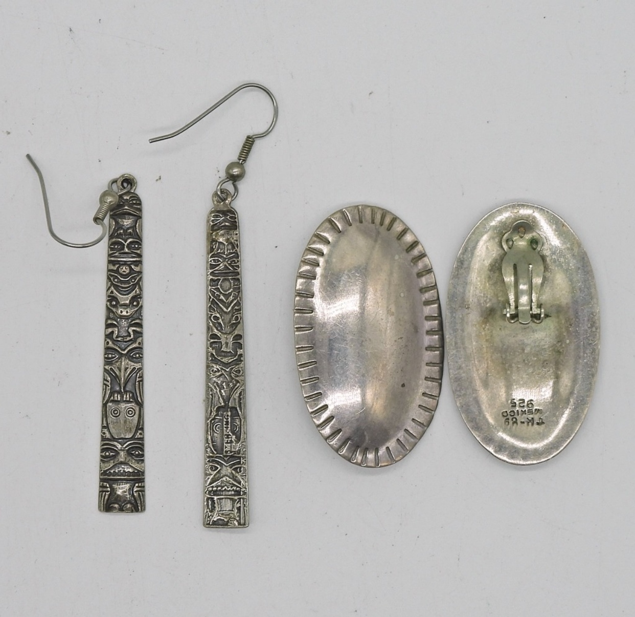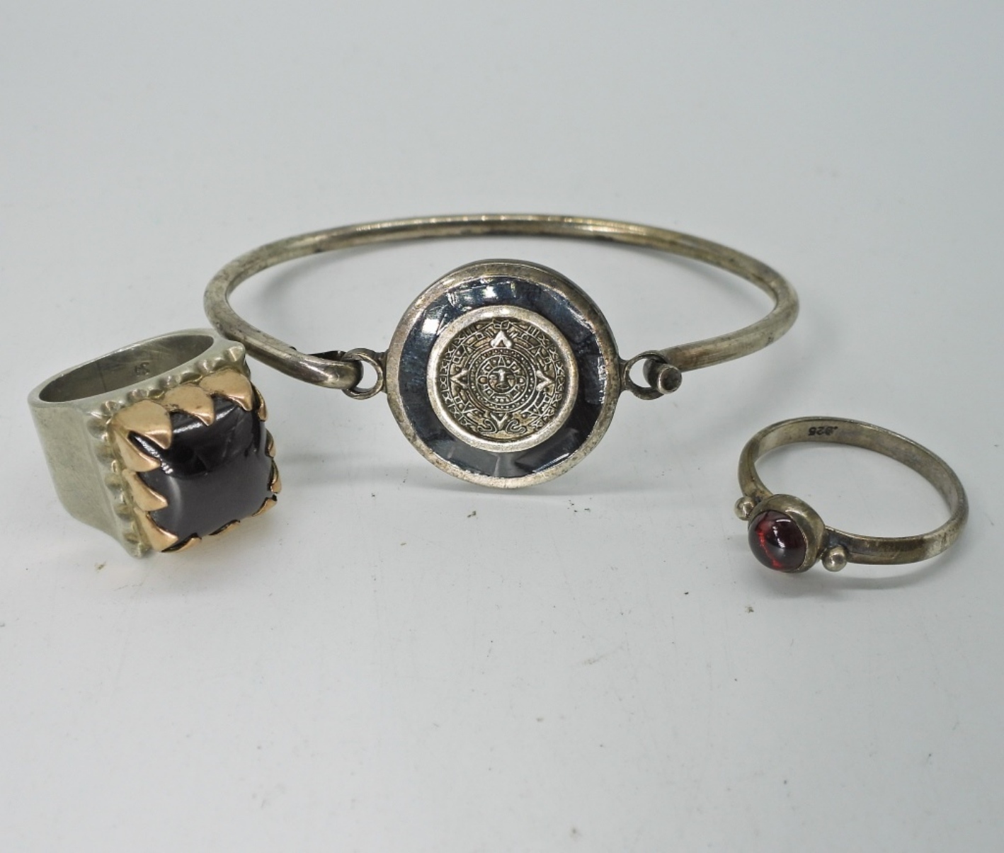 MAYAN CALENDAR BRACELET (MEXICO 925), TWO STERLING RINGS WITH GEMSTONES. TWO PAIR OF TAXCO MEXICO STERLING EARRINGS, PIERCEDC & CLIP ON. 35.1 DWT