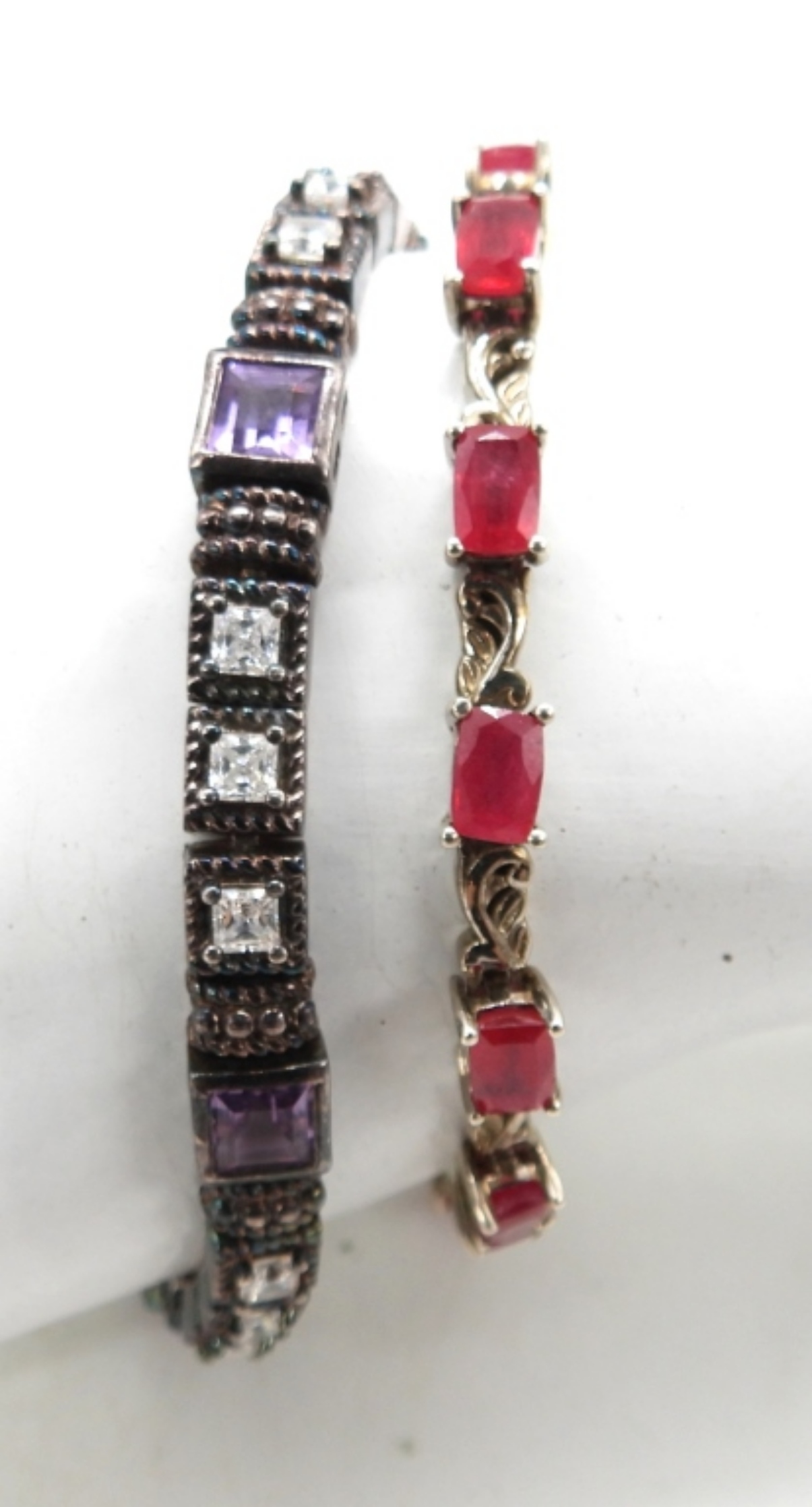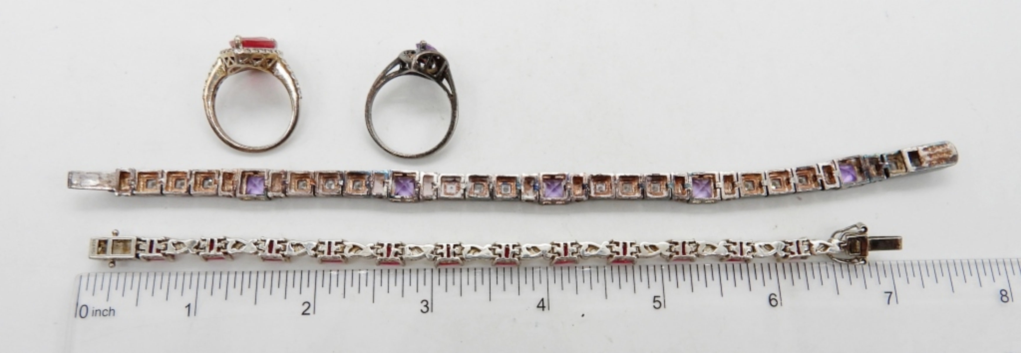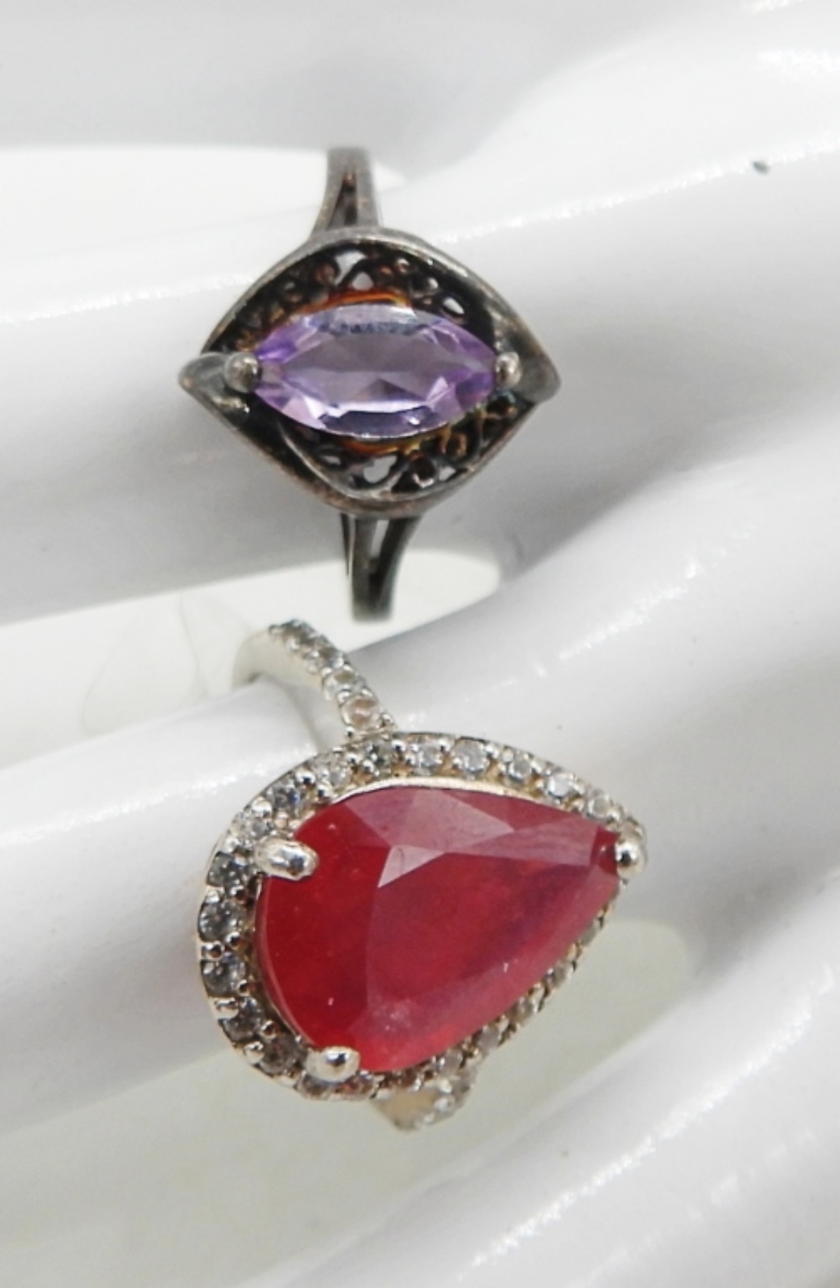 29DWT, 1- PINK GEMSTONE 7″ LONG WITH A SIZE 71/2, 1-PURPLE 8″ LONG, RING SIZE 8, ALL STAMPED 925