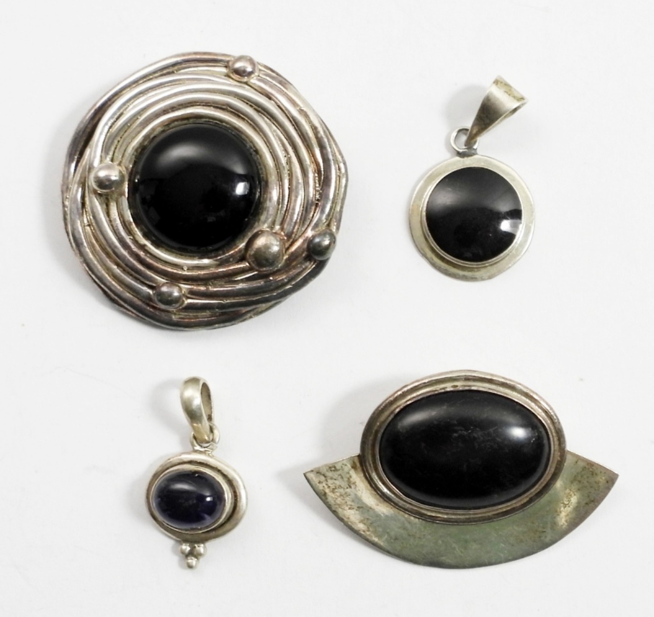 FOUR STERLING PENDANTS. TWO “MEXICO 925” PENDANTS WITH BLACK ONYX GEMSTONES. ONE “ISRAEL 925” BLACK GEMSTONE BROOCH/PENDANT. ONE STERLING AMETHYST PENDANT. 26.3 DWT