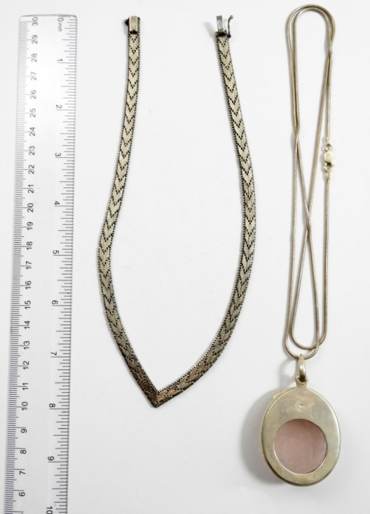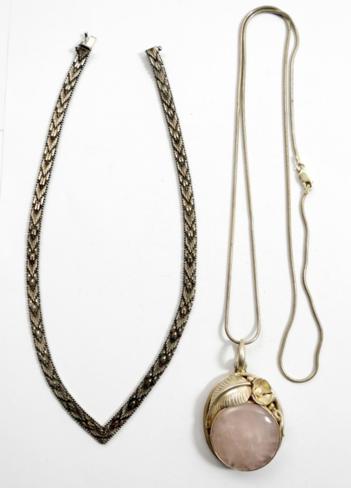 GORGEOUS STERLING ROSE QUARTZ PENDANT ON 30″ STERLING CHAIN. VINTAGE “V” STERLING NECKLACE, 16″. 41 DWT