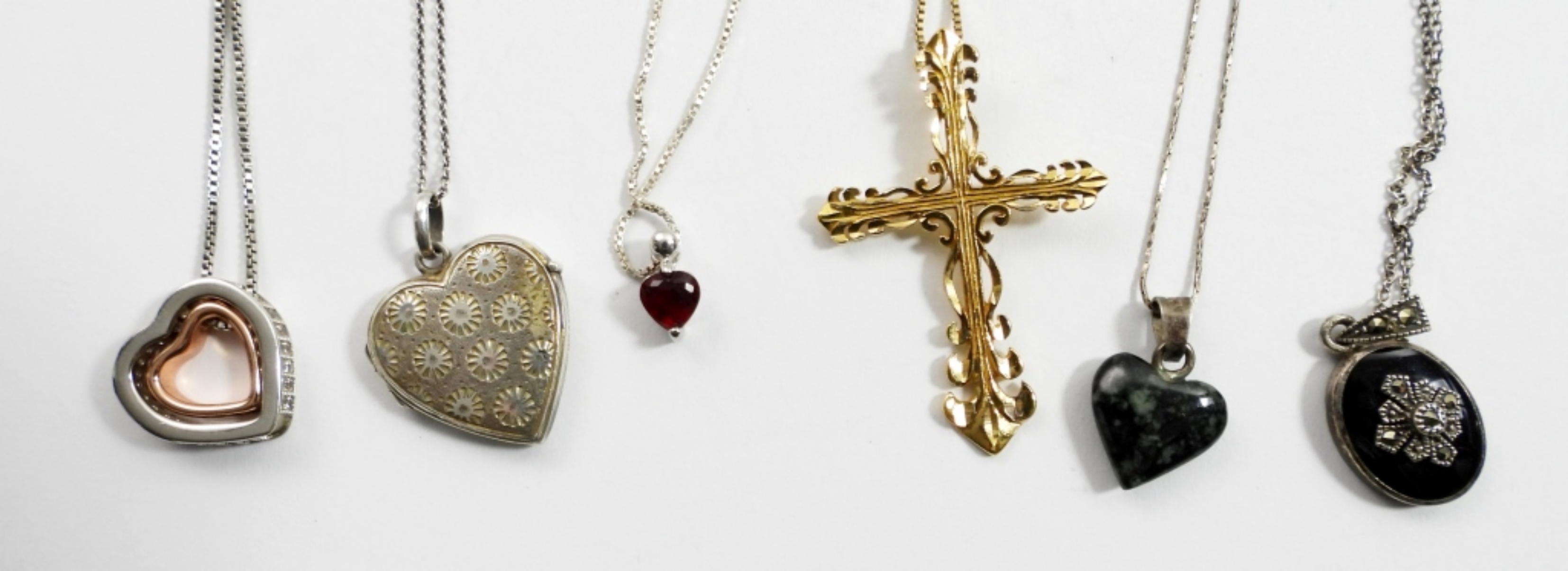 NINE STERLING CHAINS IN GOLD AND SILVER TONE. SIX PENDANTS. CHAINS VARY IN LENGTH 16″-22″. 23.7 DWT