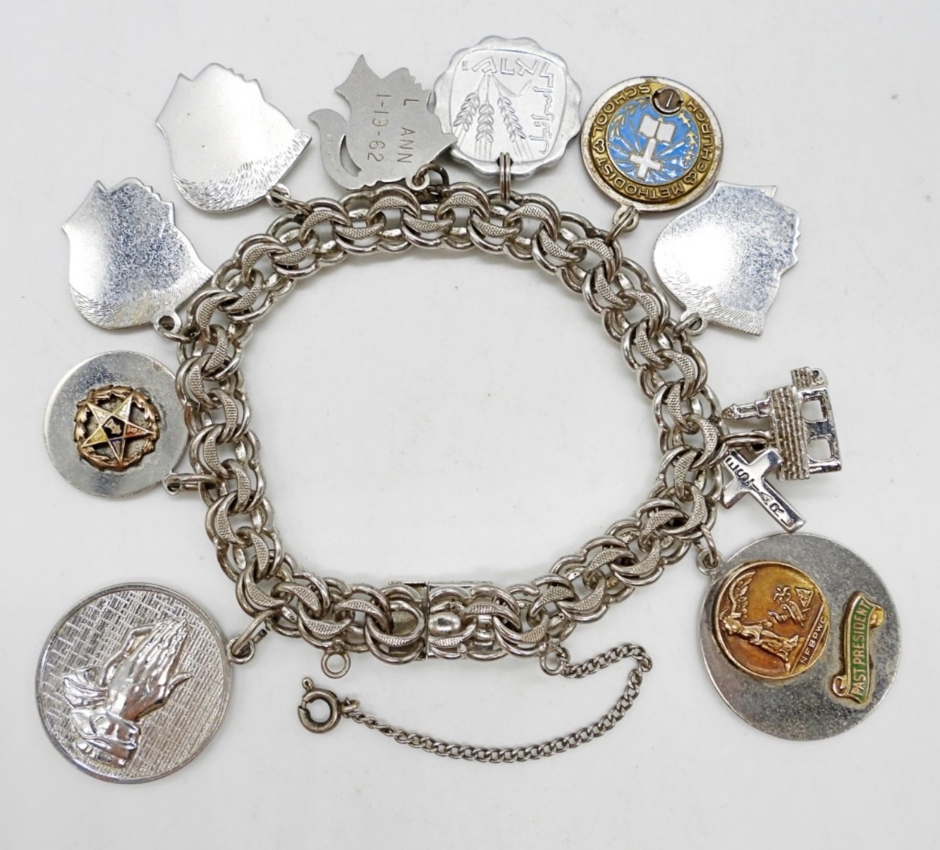 VINTAGE STERLING CHARM BRACELET, 7″ WITH 10 CHARMS. 34 DWT