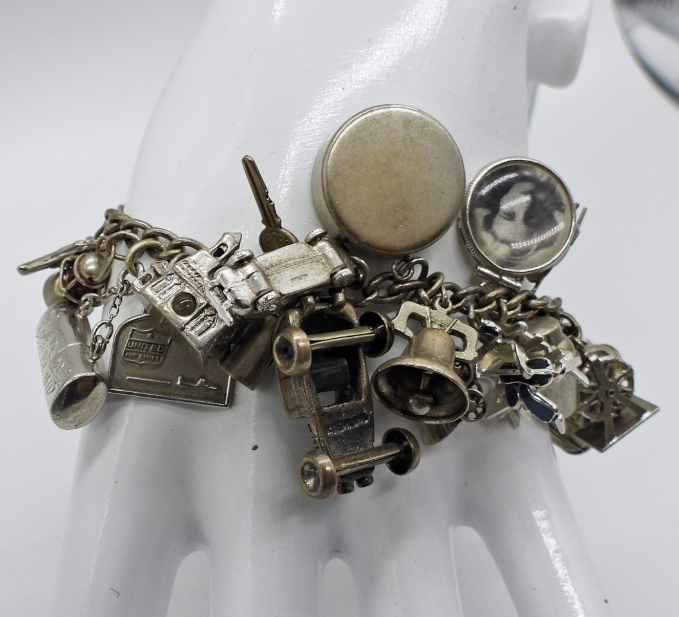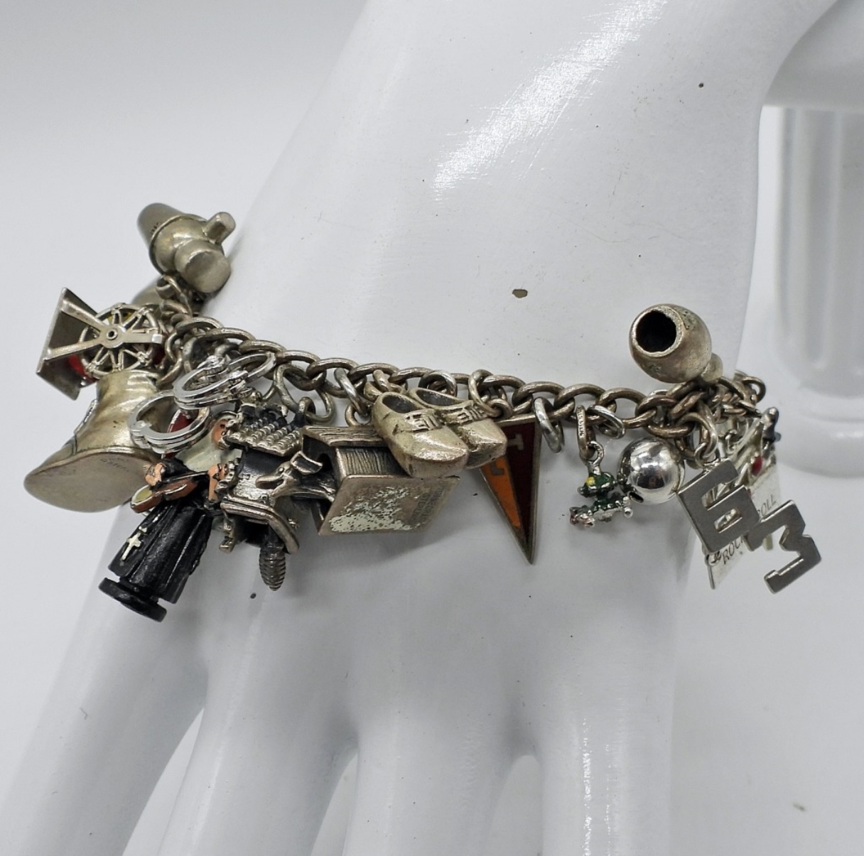 VINTAGE STERLING CHARM BRACELET, 7″ WITH 30 CHARMS, CIRCA 1963. 51 DWT