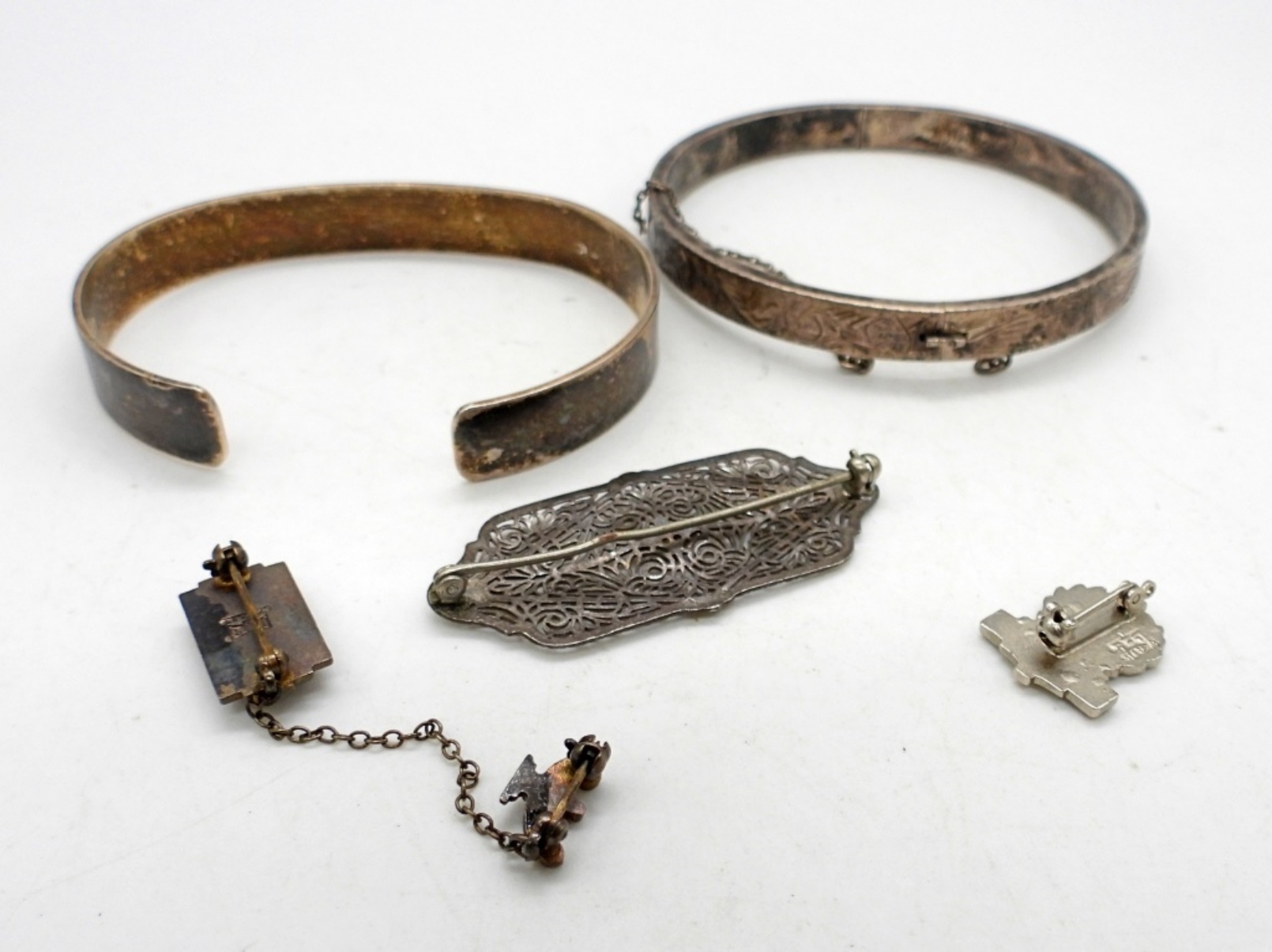 TWO VINTAGE STERLING BRACELETS. 3 VINTAGE STERLING PINS. 22.5 DWT