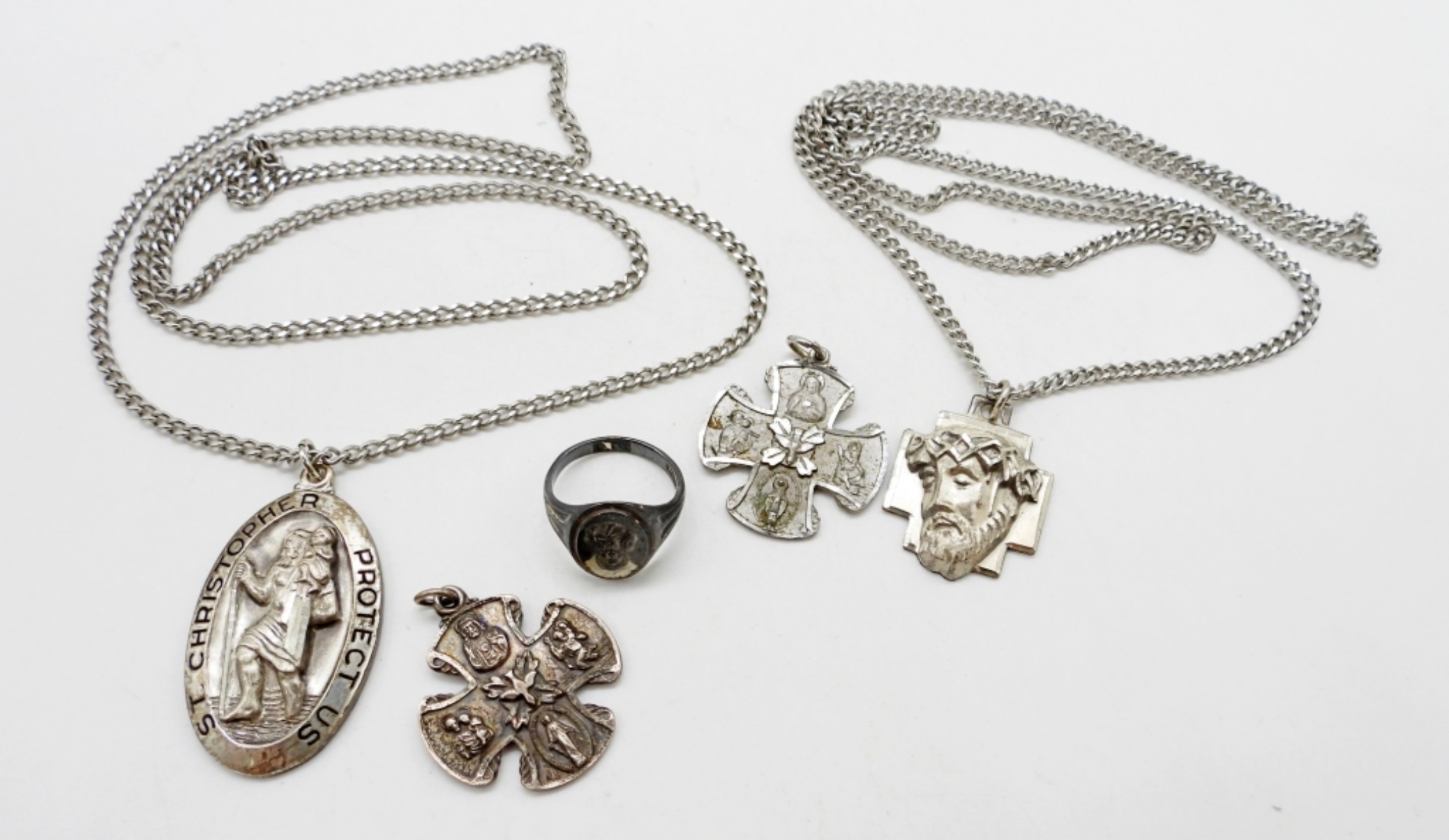 STERLING RING SIZE 6. 4 STERLING PENDANTS AND 2 CHAINS, 24″. 44 DWT