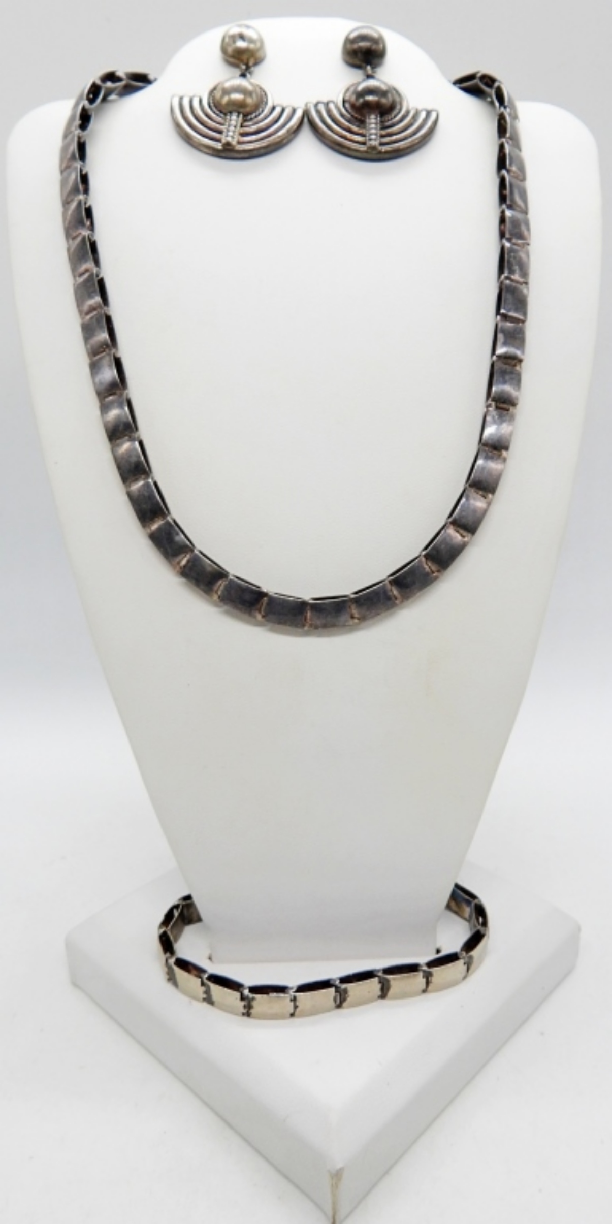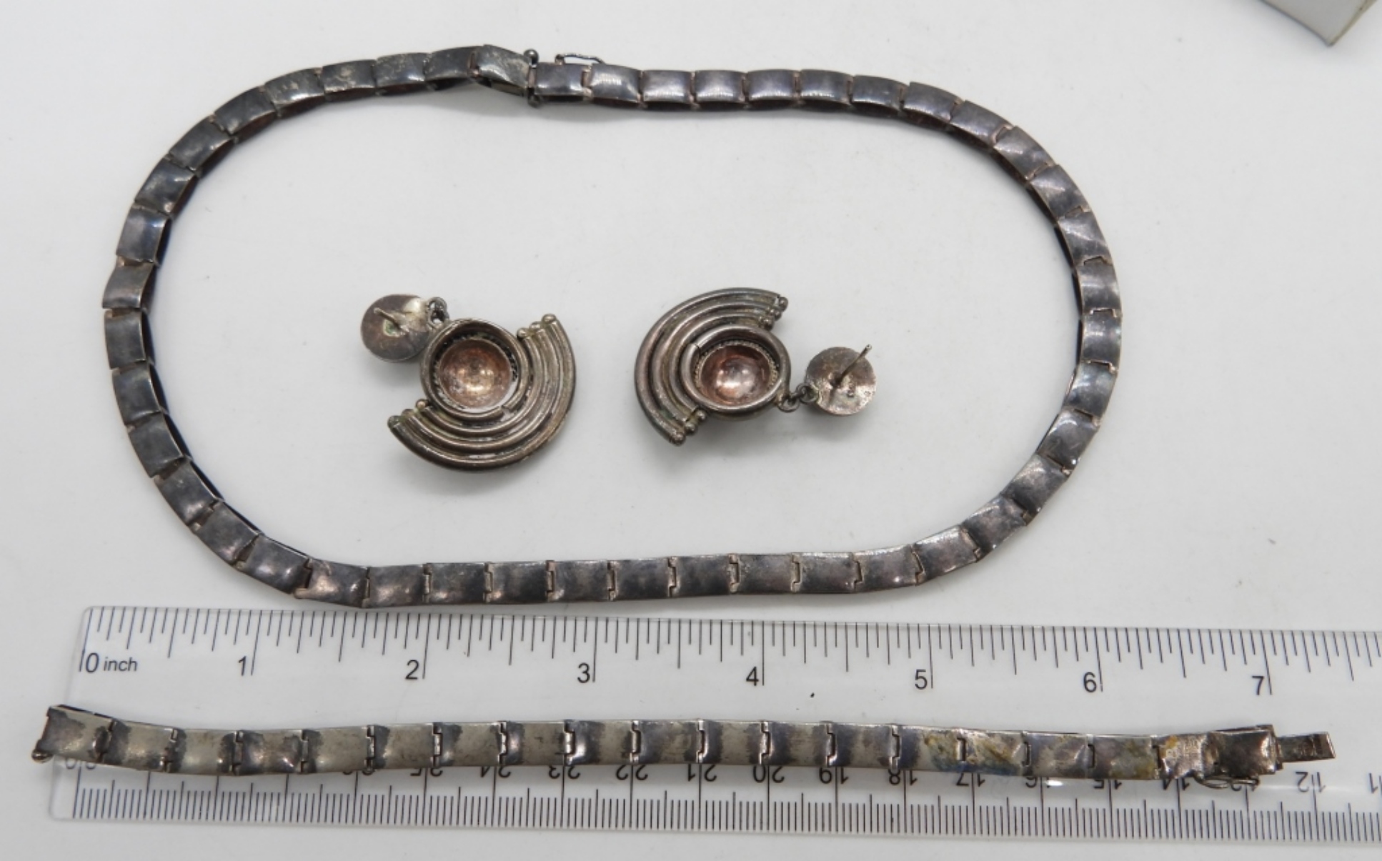 32DWT, NECKLACE 17″ LONG, BRACELET 7 1/2″LONG, STAMPED 925 ON BOX CLASP FOR BOTH, PIERCED EARRINGS STAMPED 925