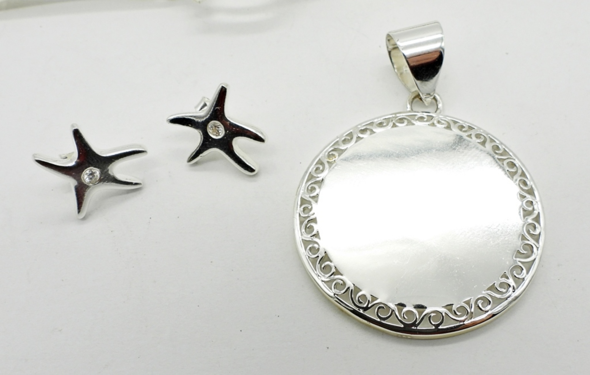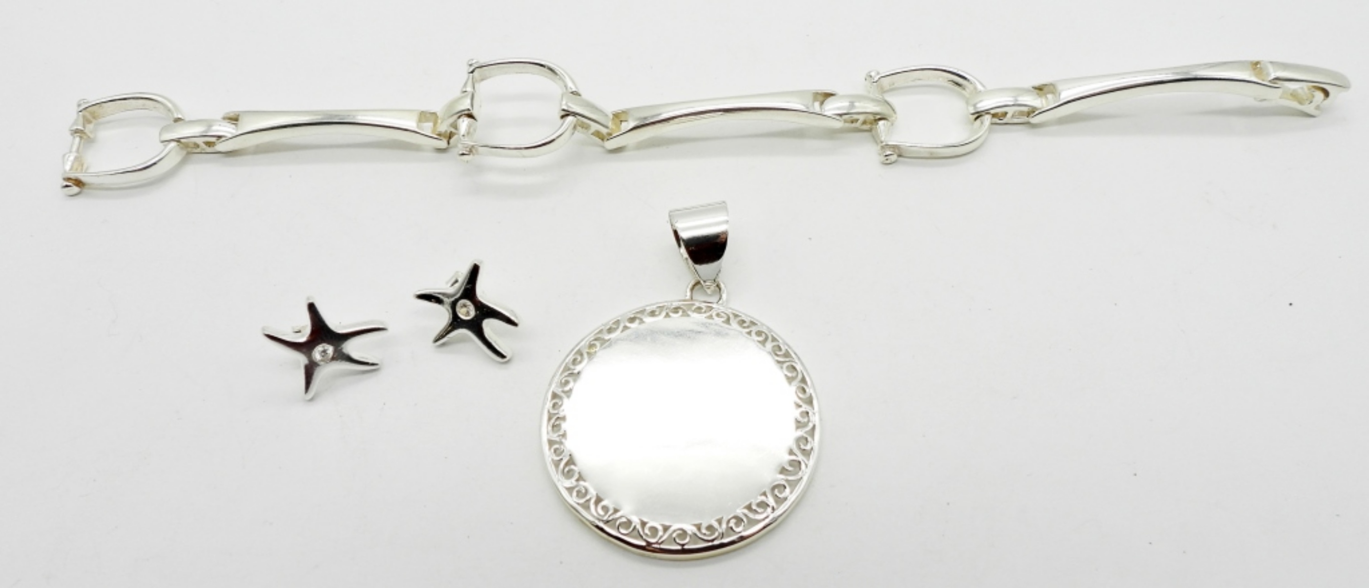 22.9DWT, CIRCLE PENDANT 2IN LONG, STAMPED 925, PAIR OF 925 STARFISH PIERCED EARRINGS, 8IN LONG BRACELET WITH OPEN BOX CLASP STAMPED 925