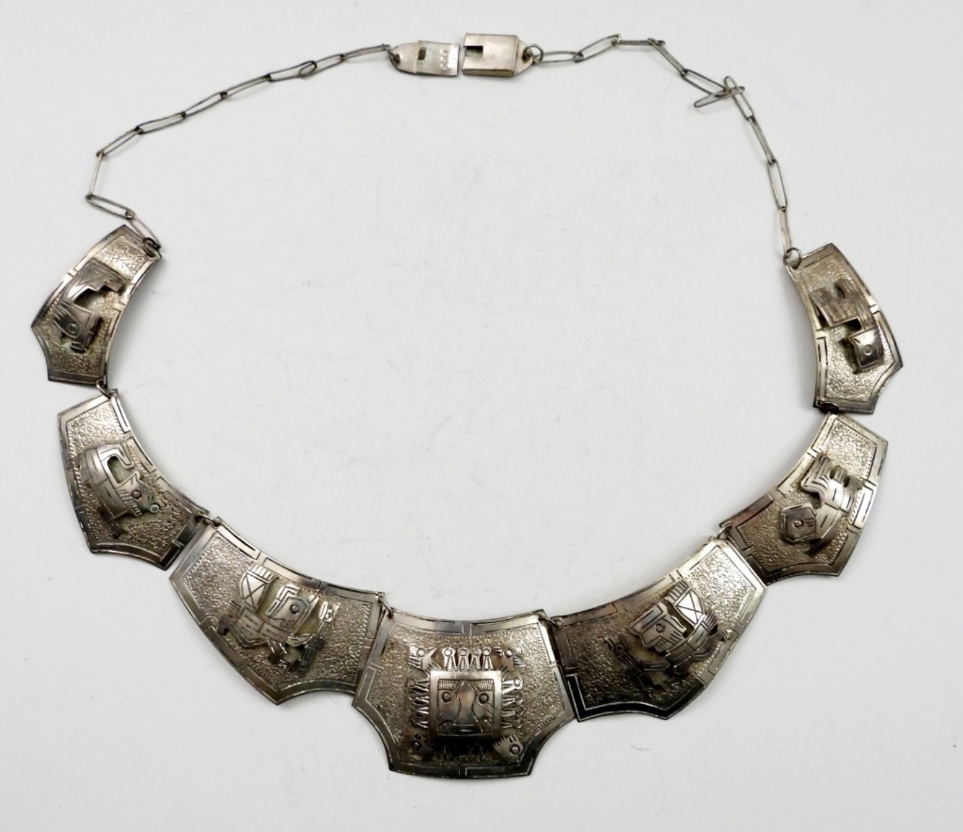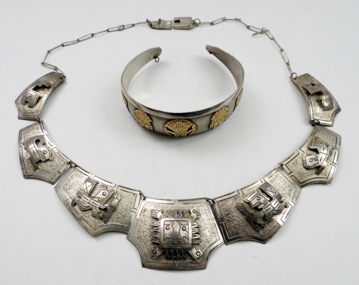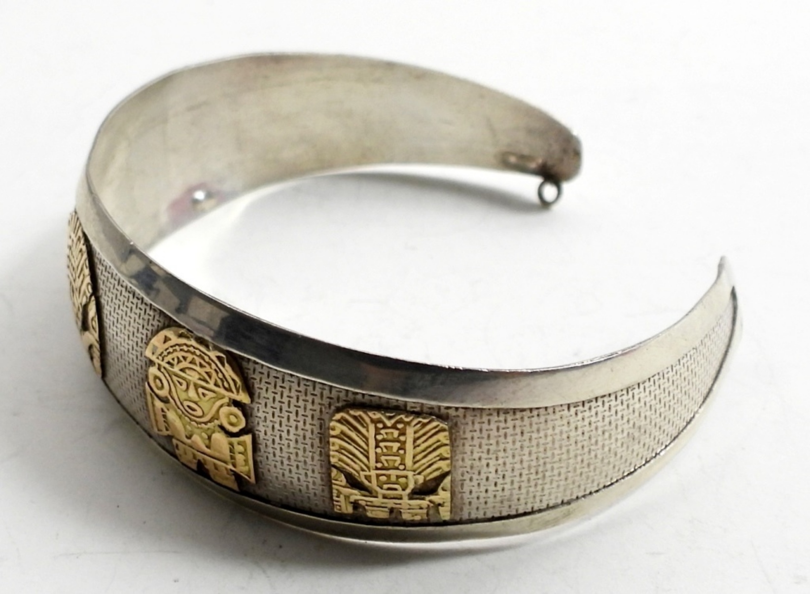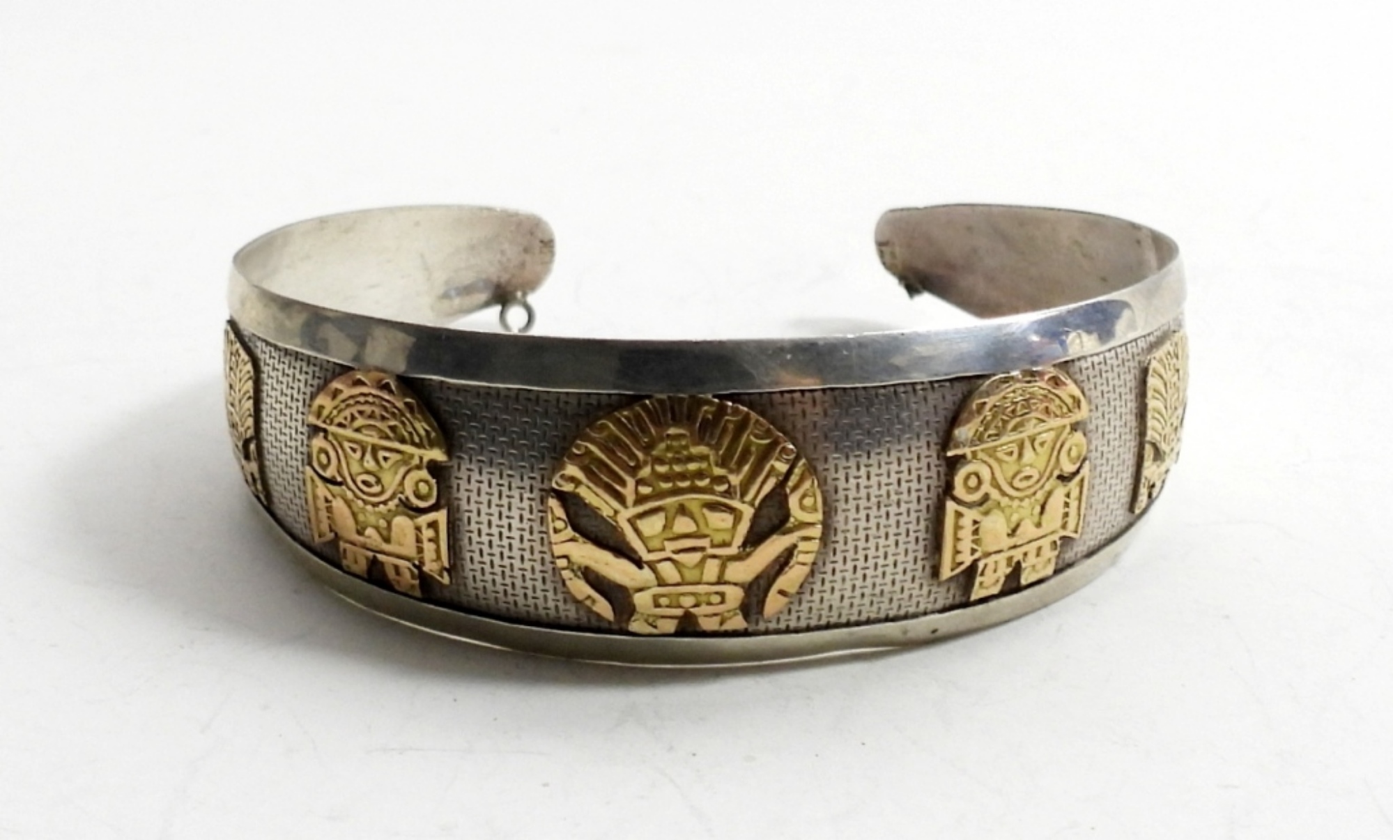 925 PERUVIAN DEITY CUFF WITH YG TONE DIETIES, 6″. PERUVIAN “900” SILVER NECKLACE, 20″. 17.4 DWT