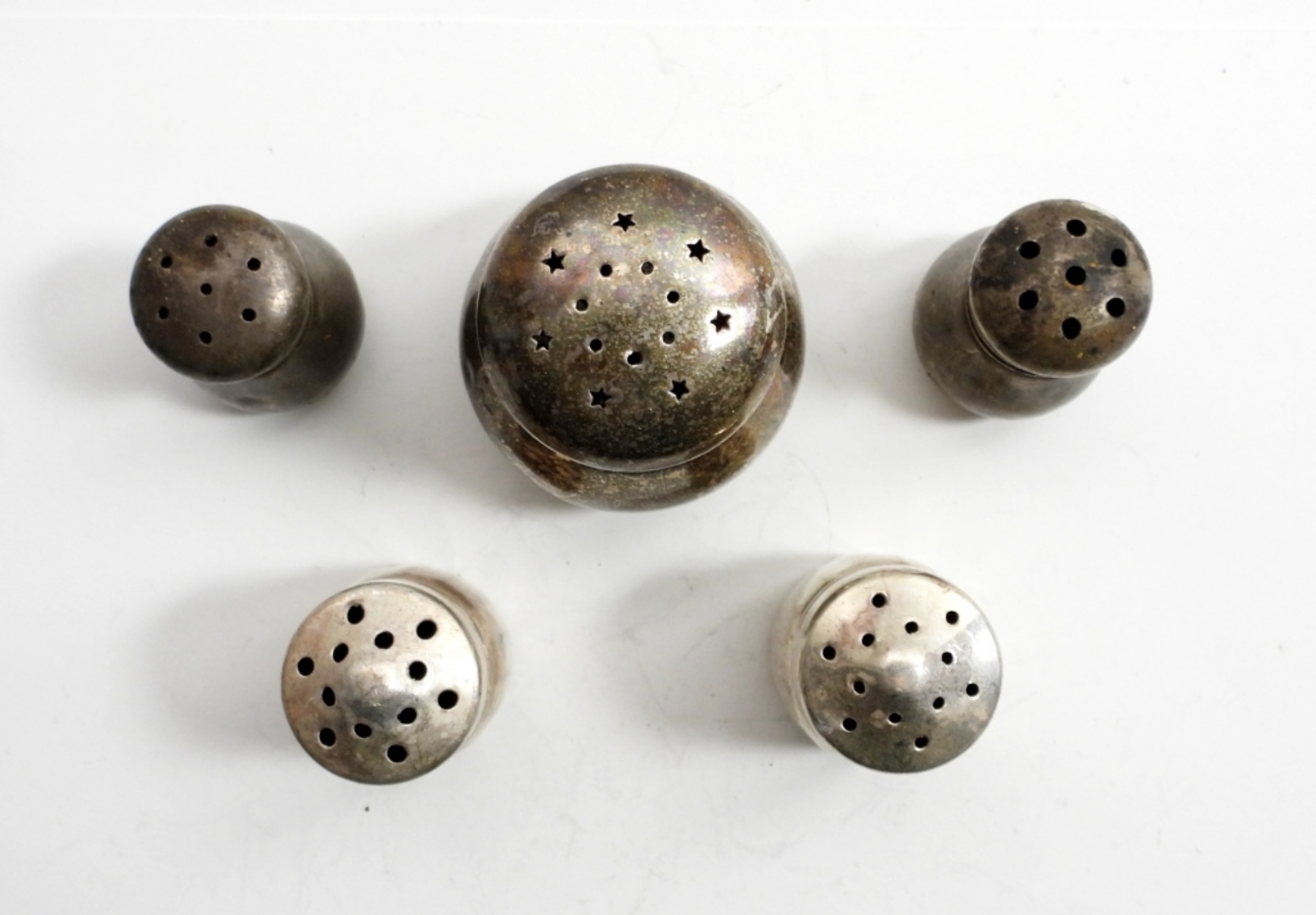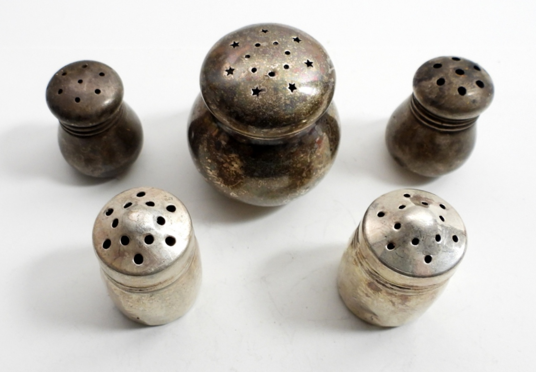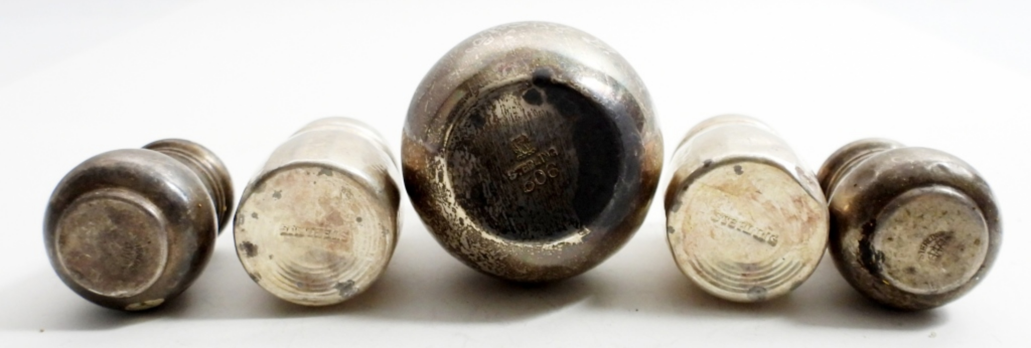 FIVE ADORABLE STERLING SALT / PEPPER SHAKERS. 1-1.5″ TALL. VERY SMALL AND CUTESY.
