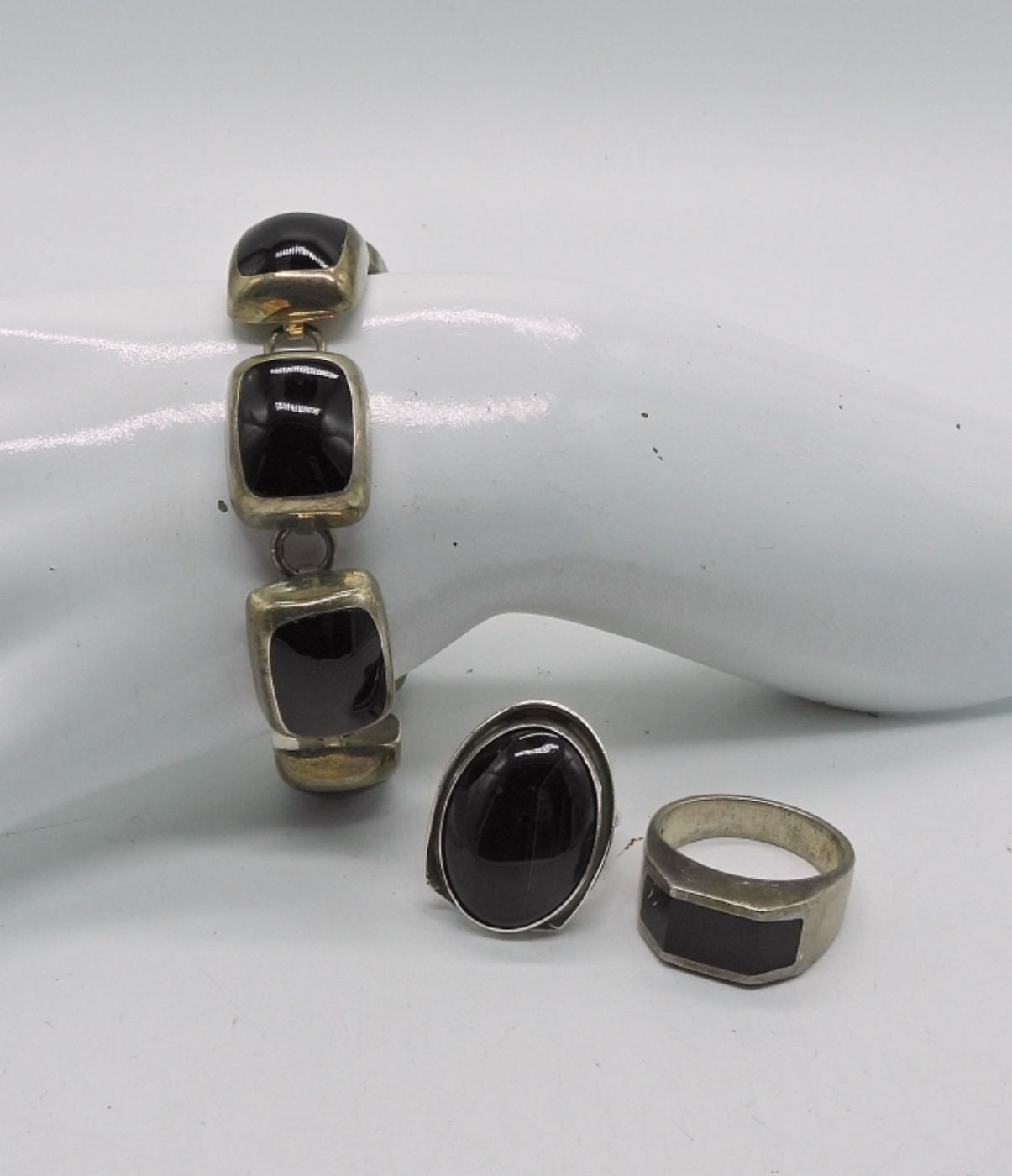 MEXICO 925, BLACK ONYX BRACELET & 2 MATCHING RINGS. BRACELET 7″. RINGS SIZE 9 & 12. 52.4 DWT