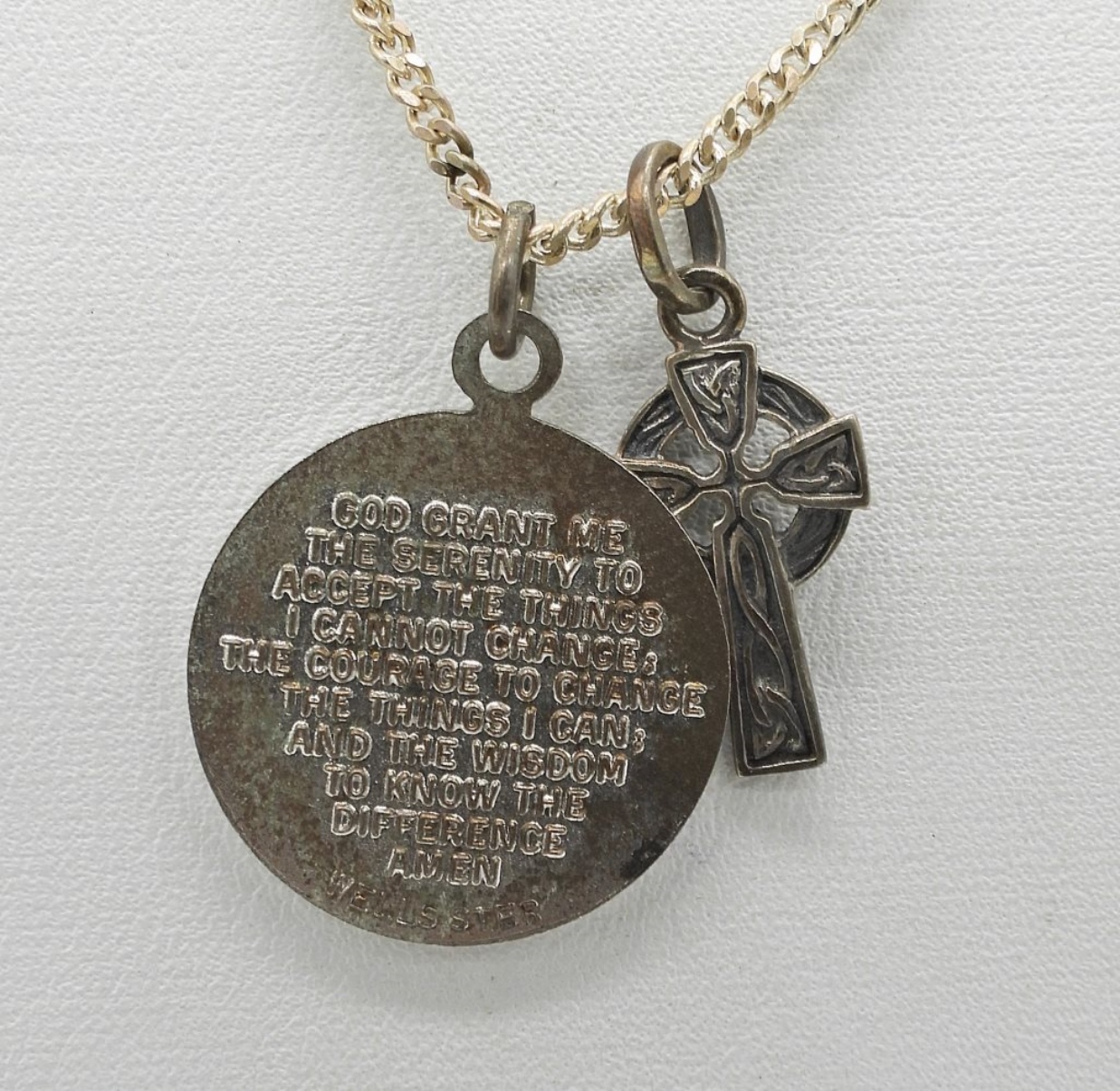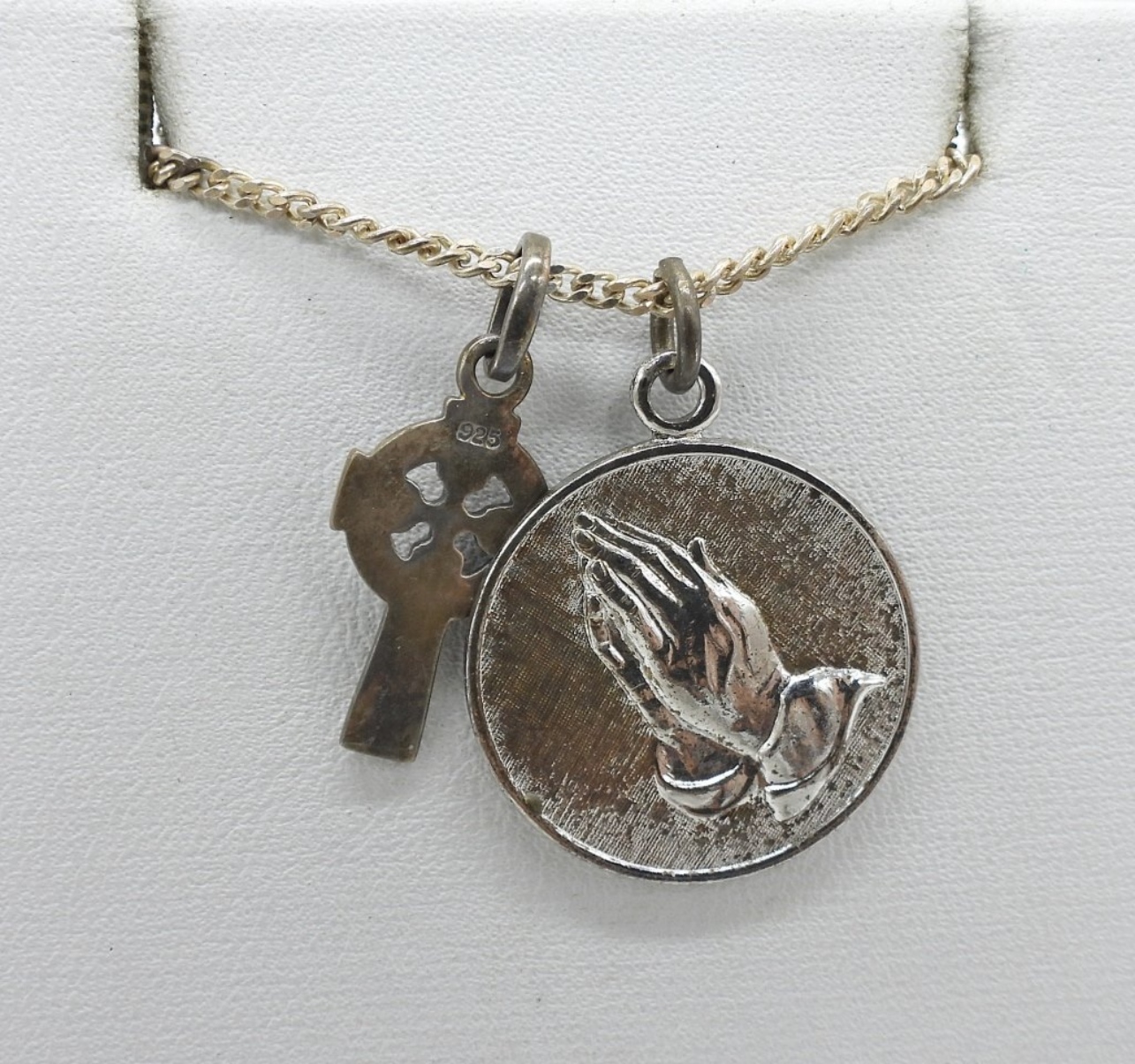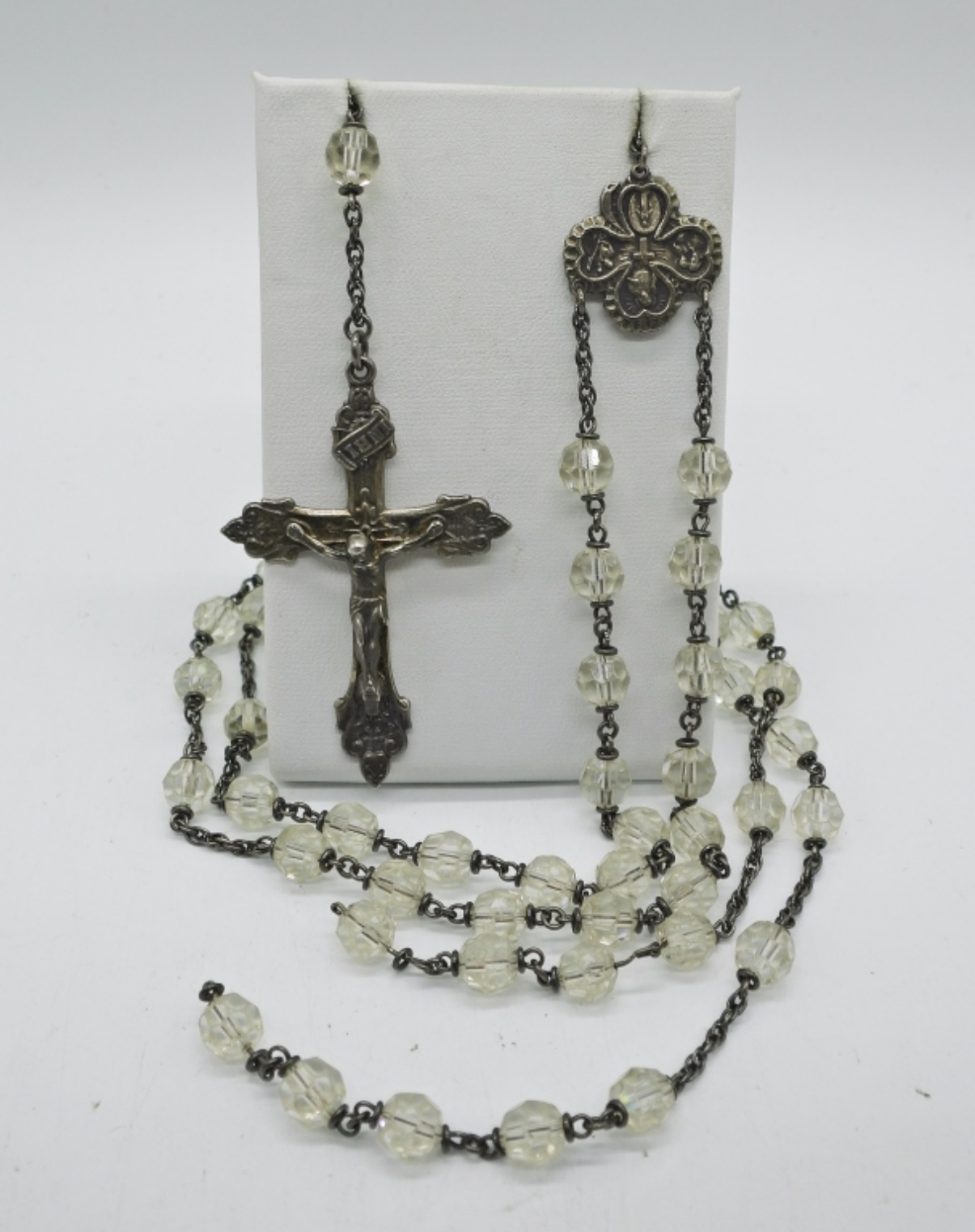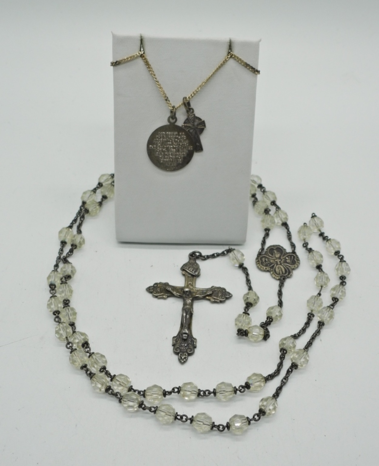STERLING BEADED ROSARY (NO CLASPS) 30″. STERLING 18″ CHAIN WITH TWO RELIGIOUS CHARMS. 37.6 DWT