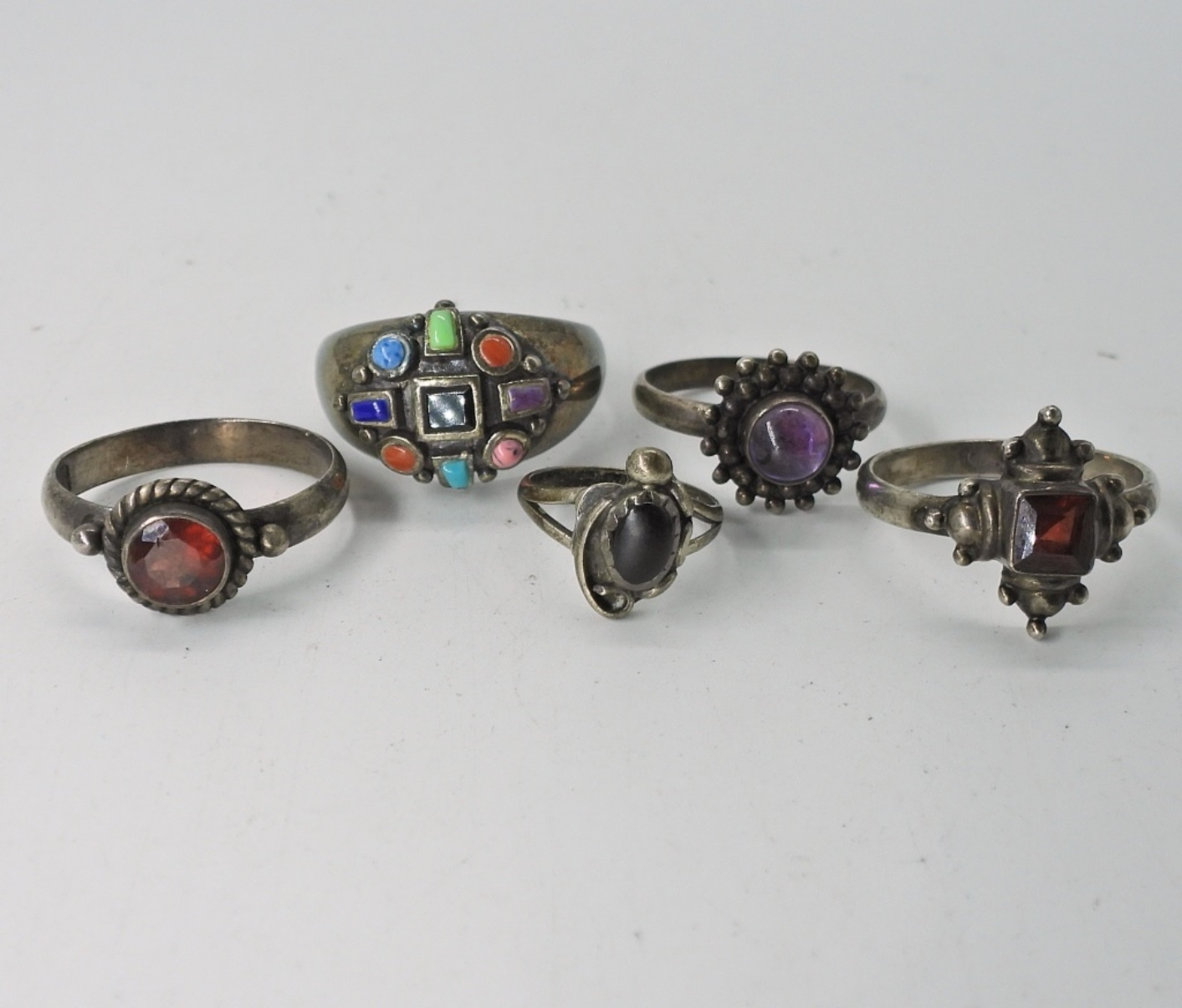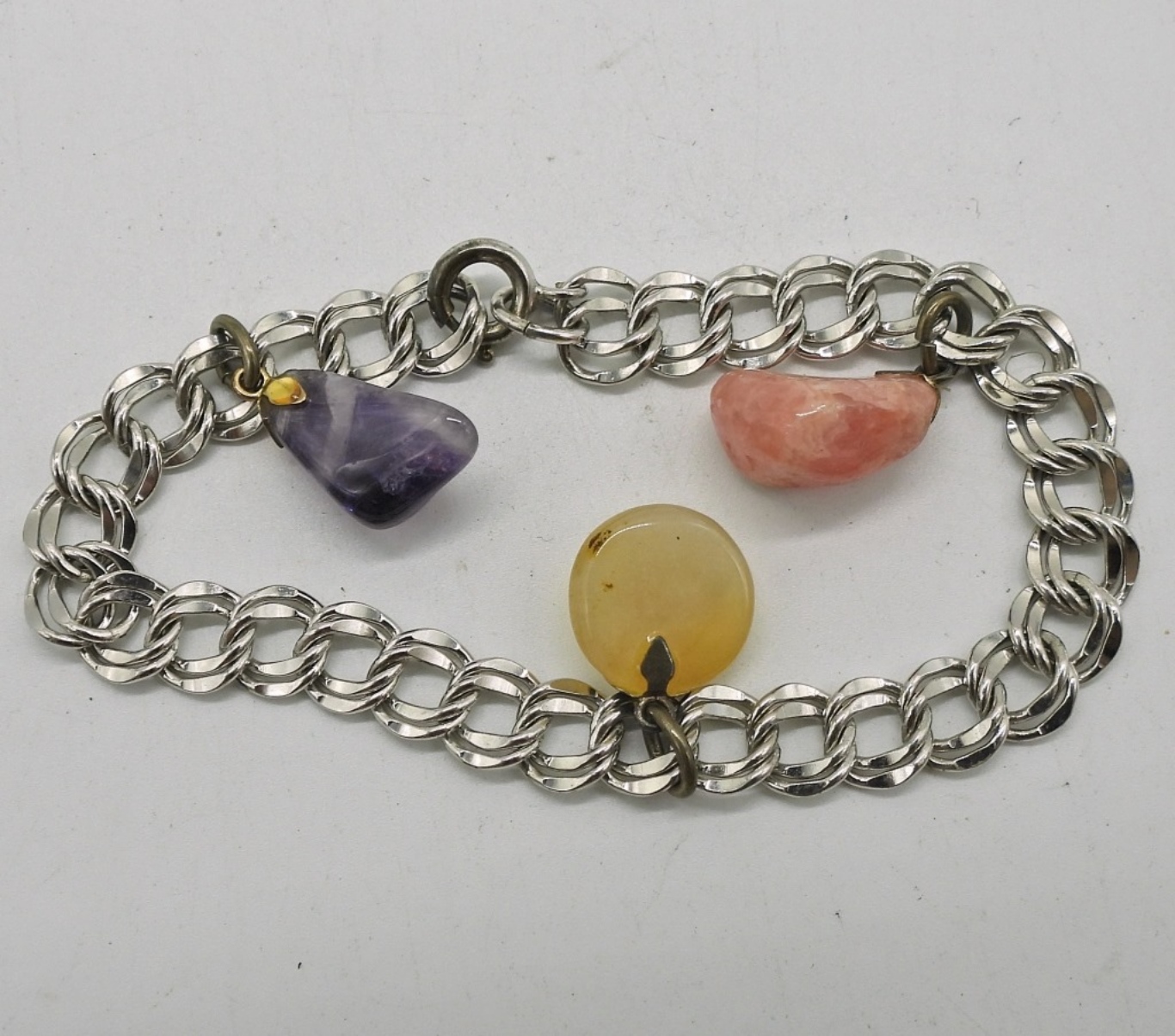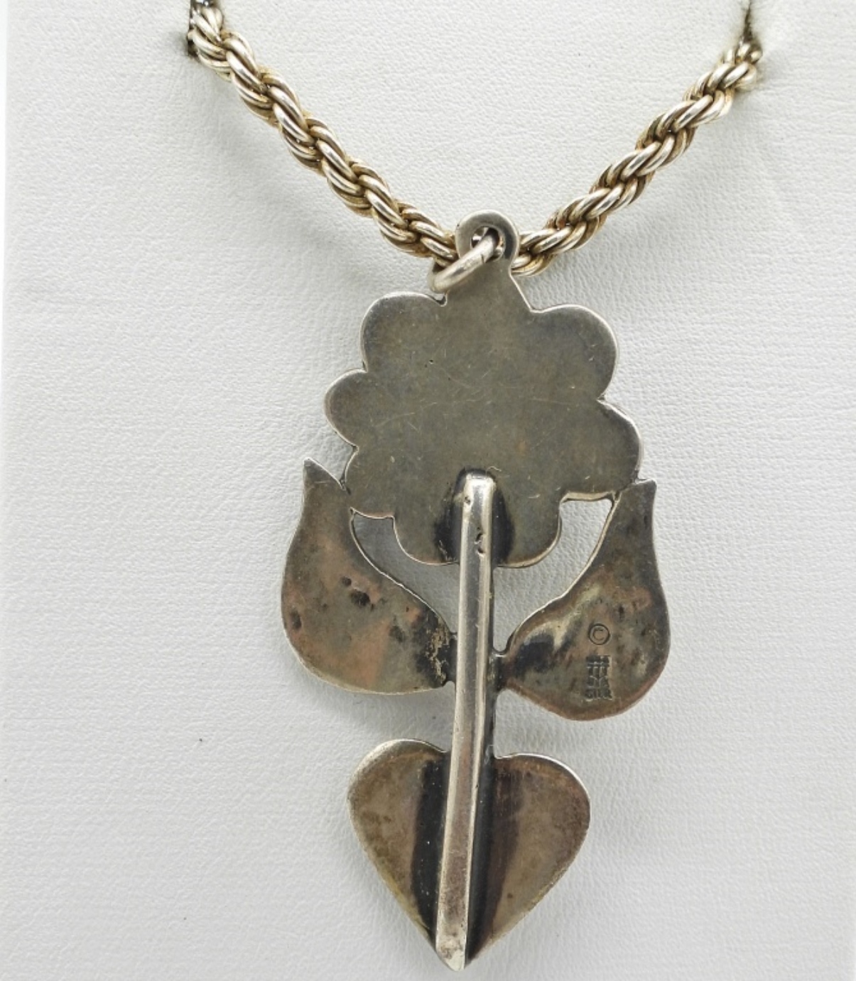 STERLING FLOWER PENDANT ON AN 18″ STERLING CHAIN. STERLING 6″ BRACELET WITH 3 GEMSTONE CHARMS. 5 STERLING RINGS, SIZES 1.5, 6.5, 7, 8. 32.5 DWT