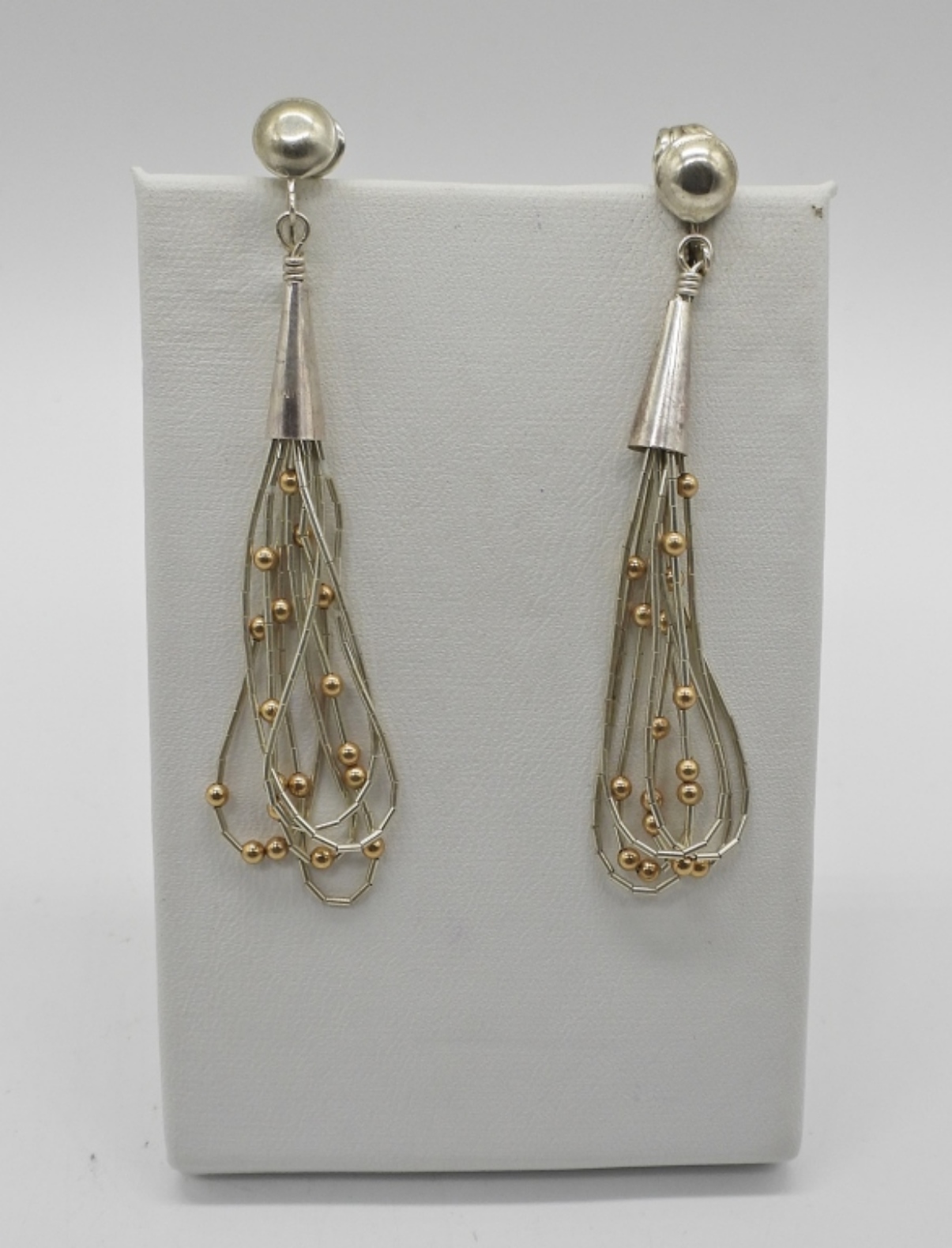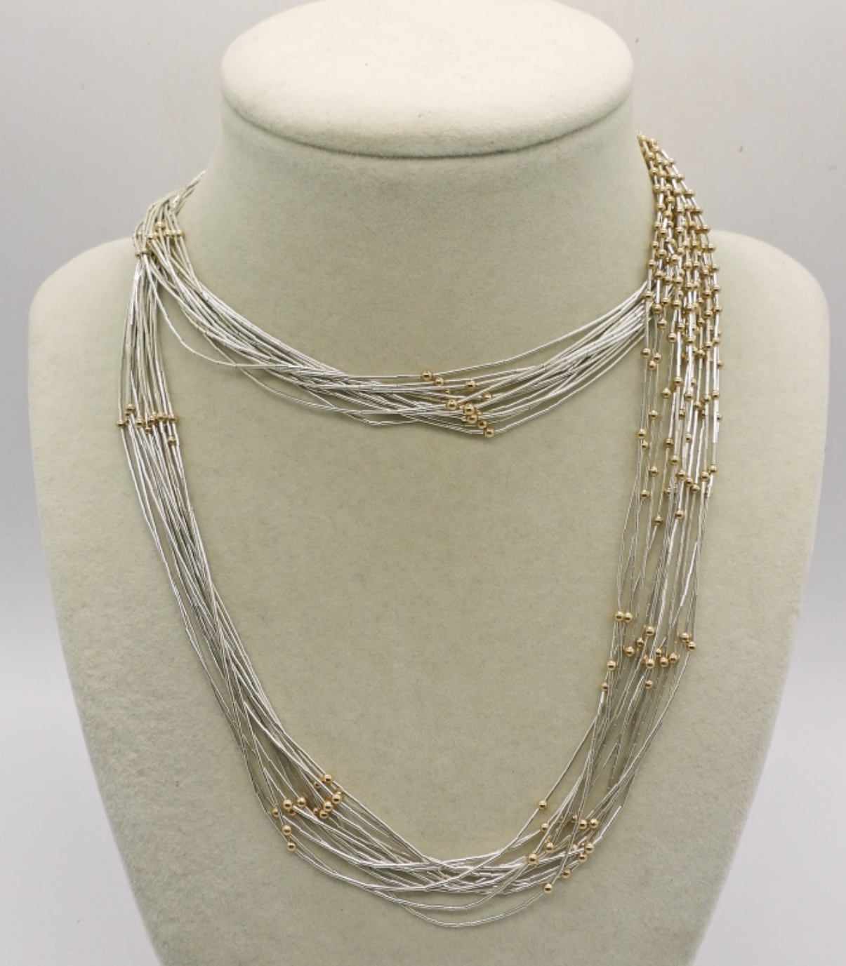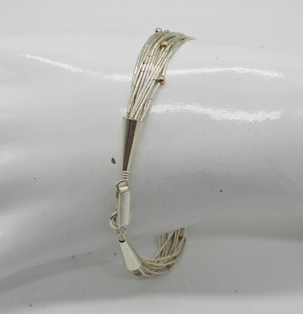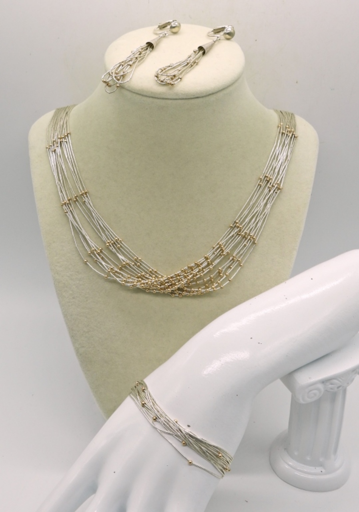 LIQUID STERLING NECKLACE, EARRINGS & BRACELET SET. LIQUID STERLING BEADS ARE ACCENTED WITH TINY GOLD TONE BEADS ON ALL 3 PIECES. NECKLACE 29″, CLIP ON EARRINGS 3″, BRACELET 7″. 24.7 DWT