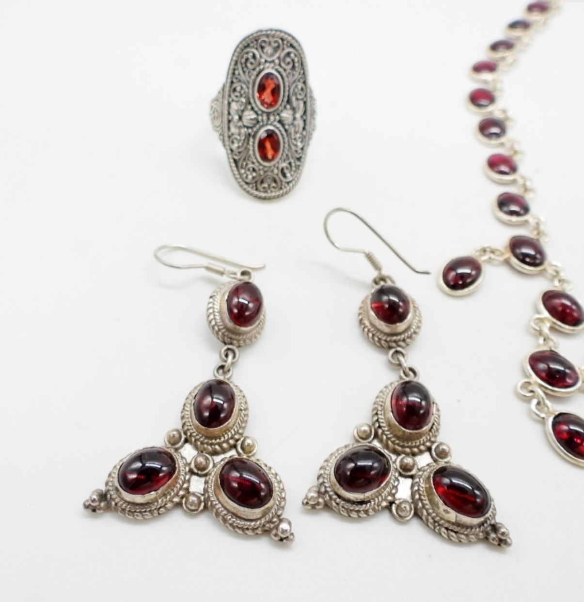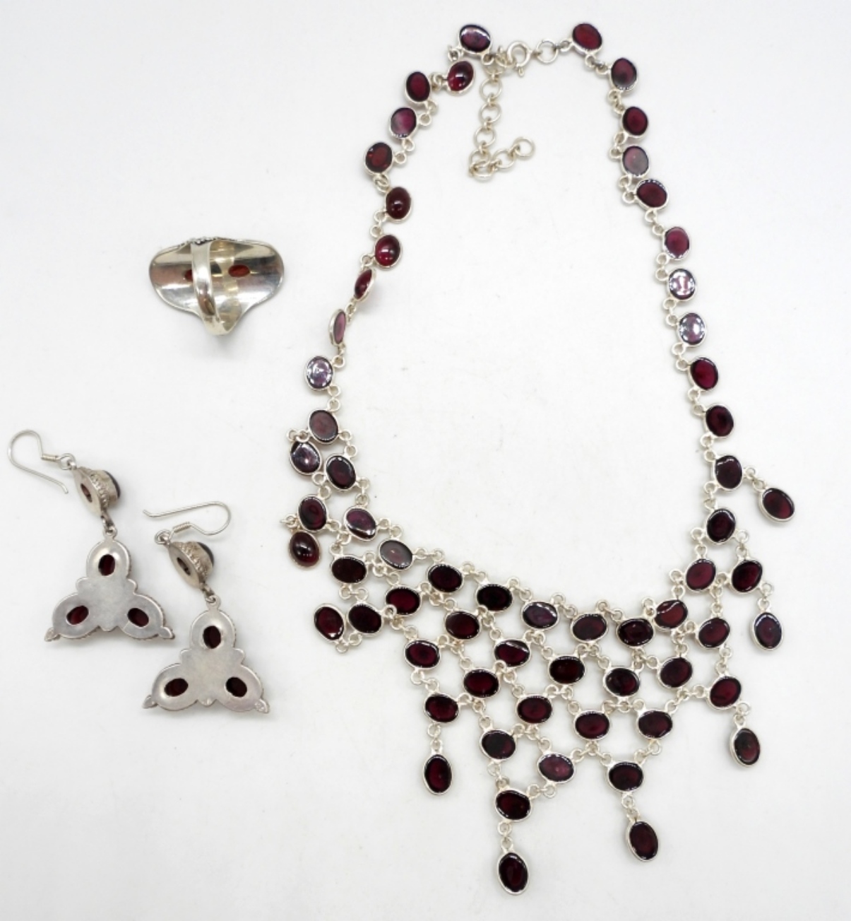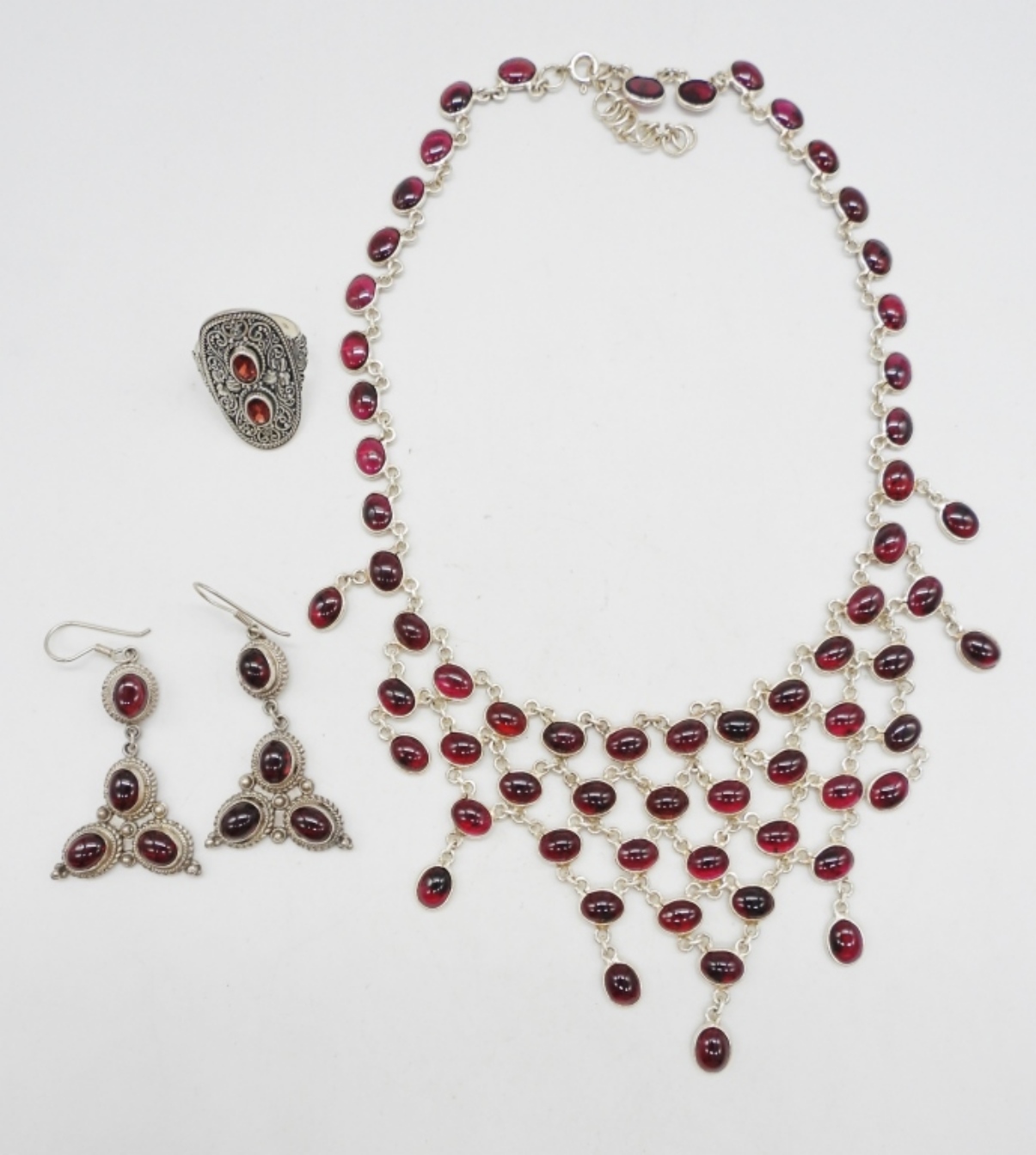 39.4 DWT. 16″ NECKLACE, PIERCED DANGLE EARRINGS, & SIZE 8.25 RING. ALL STAMPED 925.