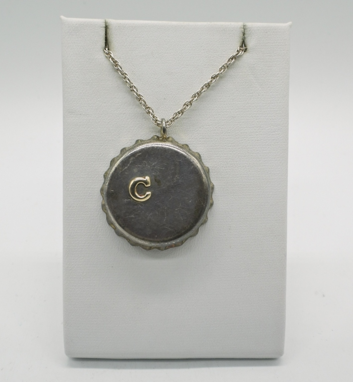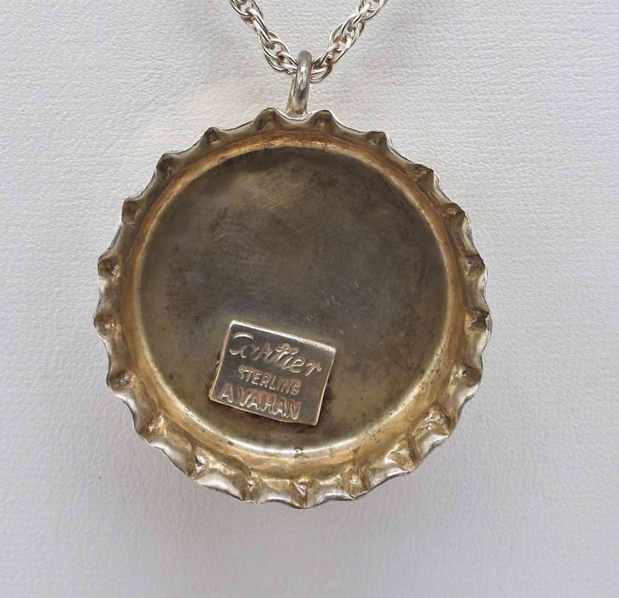 VINTAGE STERLING & 18K CARTIER BOTTLE CAP PENDANT ON AN 17″ STERLING CHAIN. DESIGNED BY A. VAHAN. STAMPED “CARTIER STERLING A VAHAN”. THE LETTER “C” IS 18K GOLD. 3.2 DWT