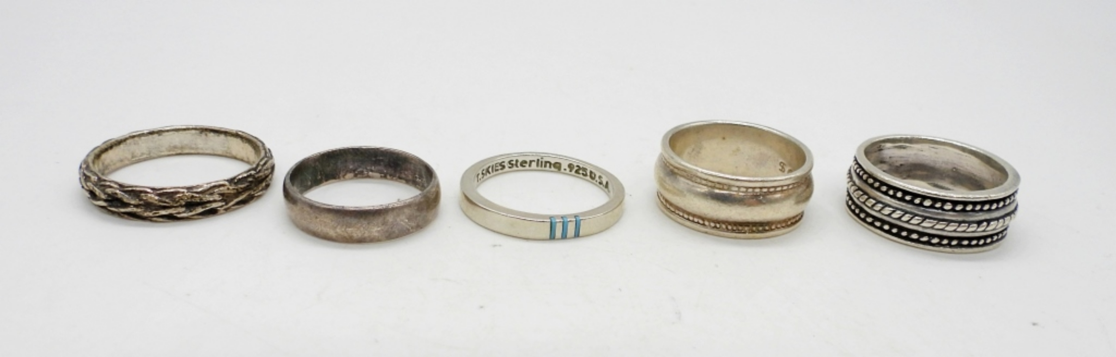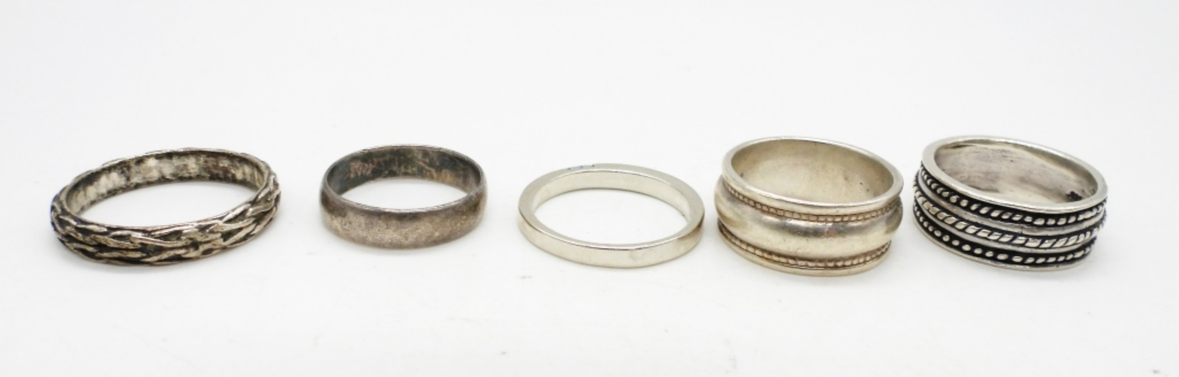 5 STERLING BANDS, SIZES 10 (x3), 11.5 & 12. 20 DWT