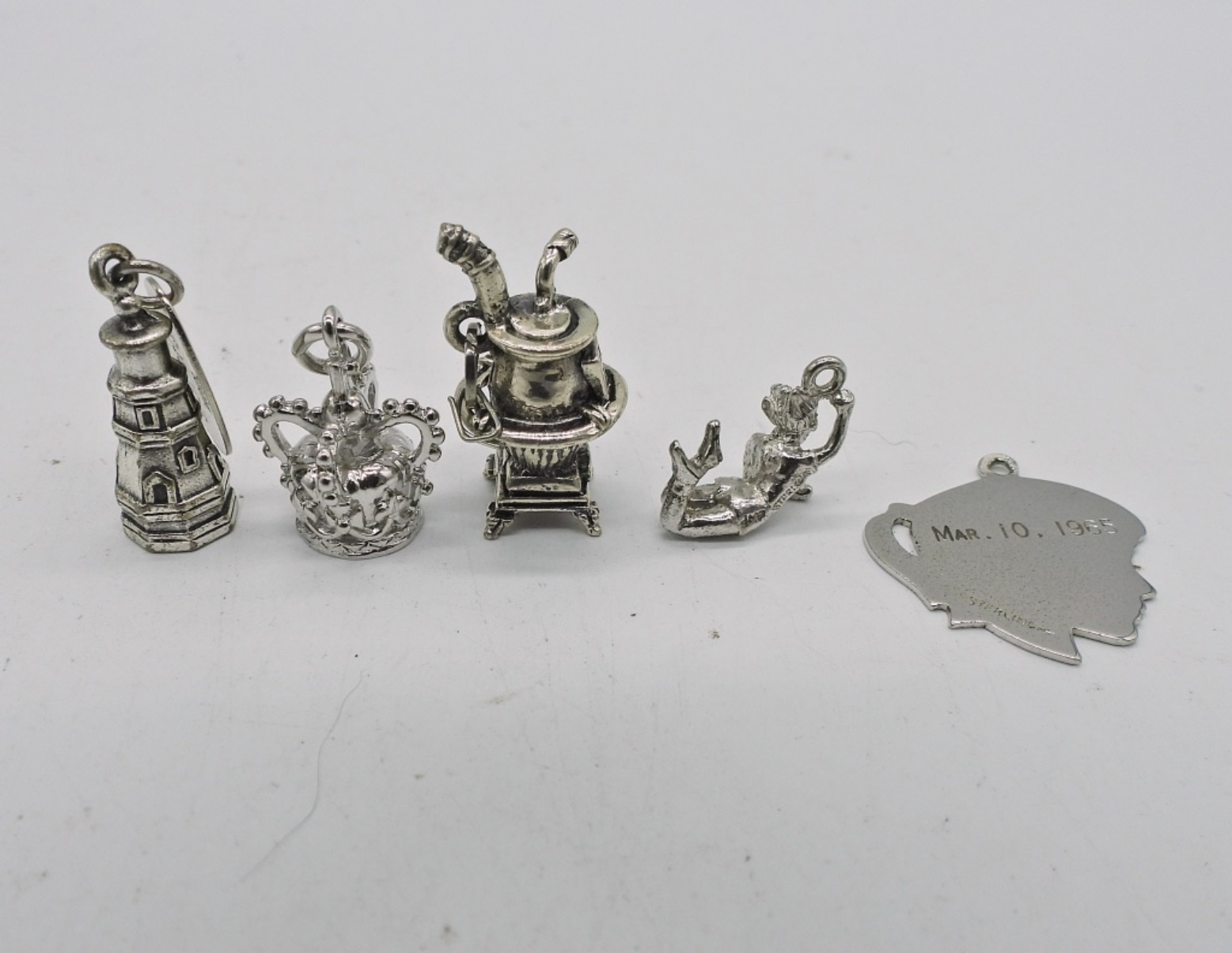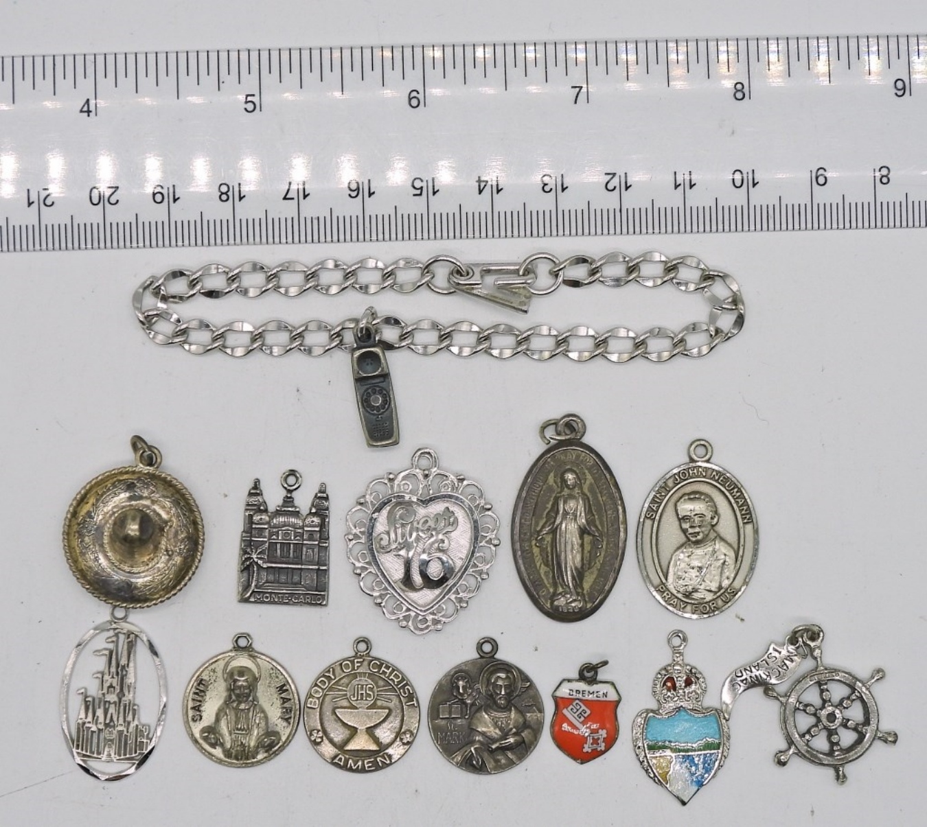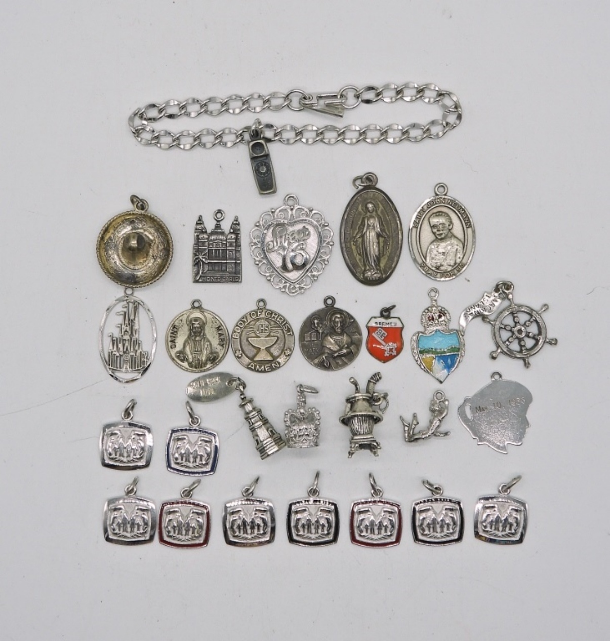 STERLING CHARM BRACELET WITH 27 VINTAGE STERLING CHARMS. BRACELET IS 7″. 65.7 DWT