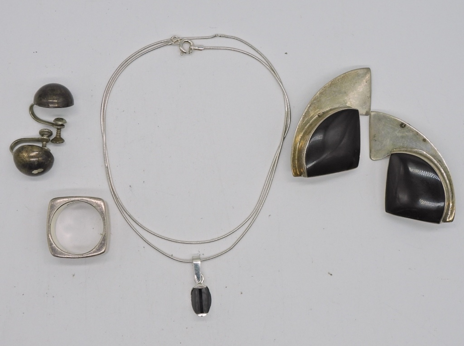 LARGE STERLING & BLACK ONYX CLIP ON EARRINGS, 2″x1″. ROUND MEXICO 925 SCREW BACK EARRINGS, STERLING MEXICO 925 RING SIZE 7.5. MODERN NECKLACE WITH BLACK GEMSTONE, 18″. 34.1 DWT