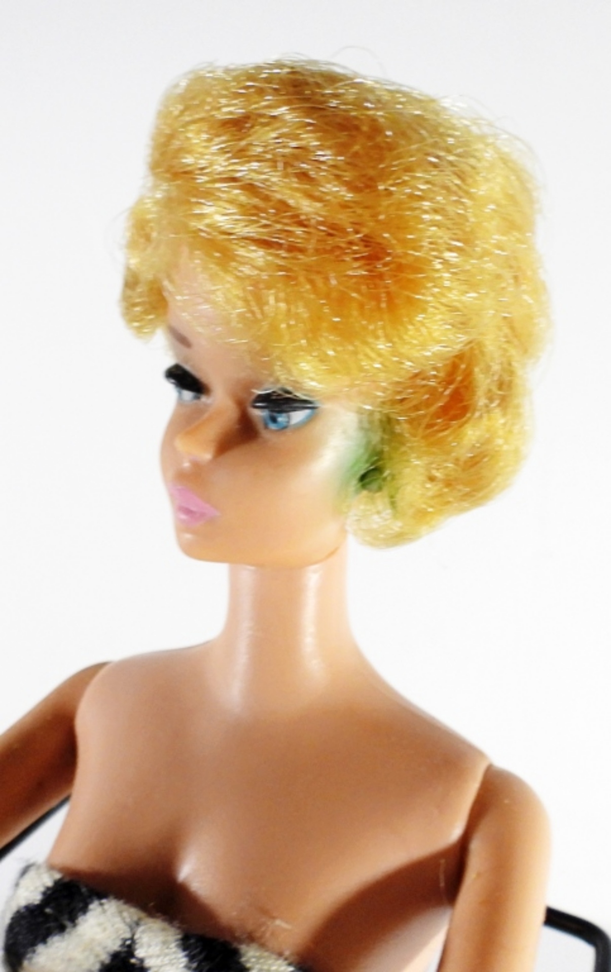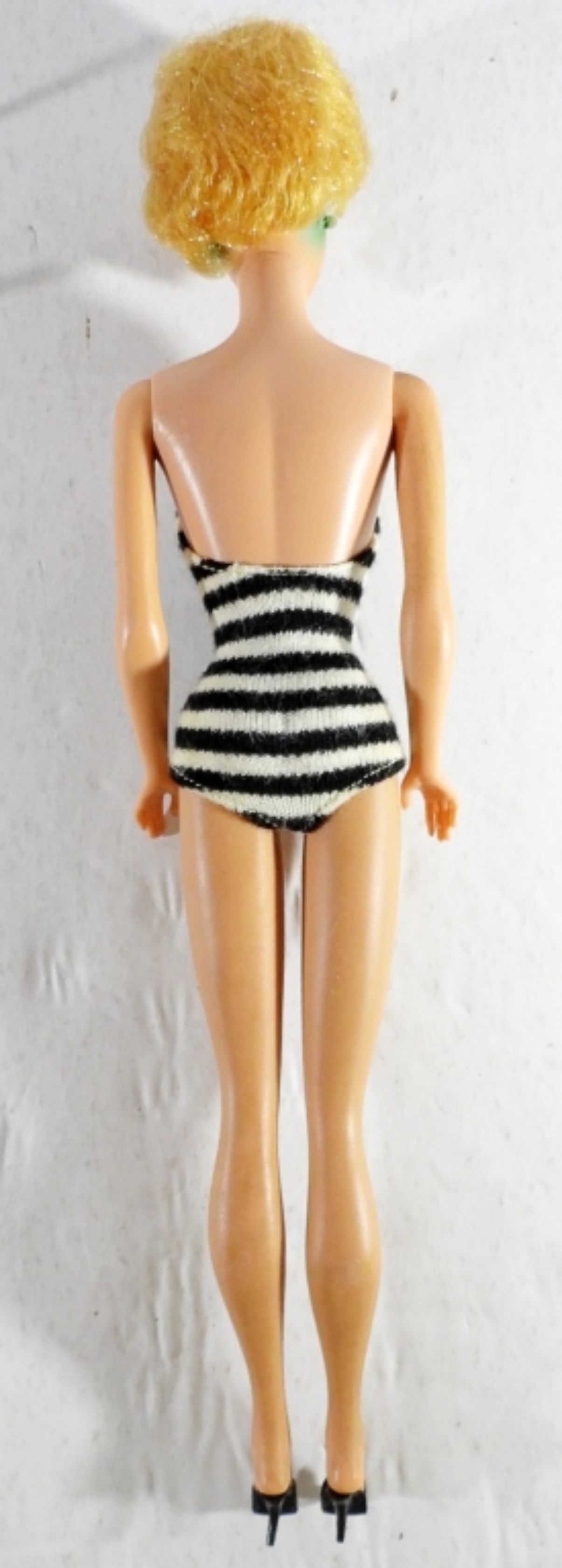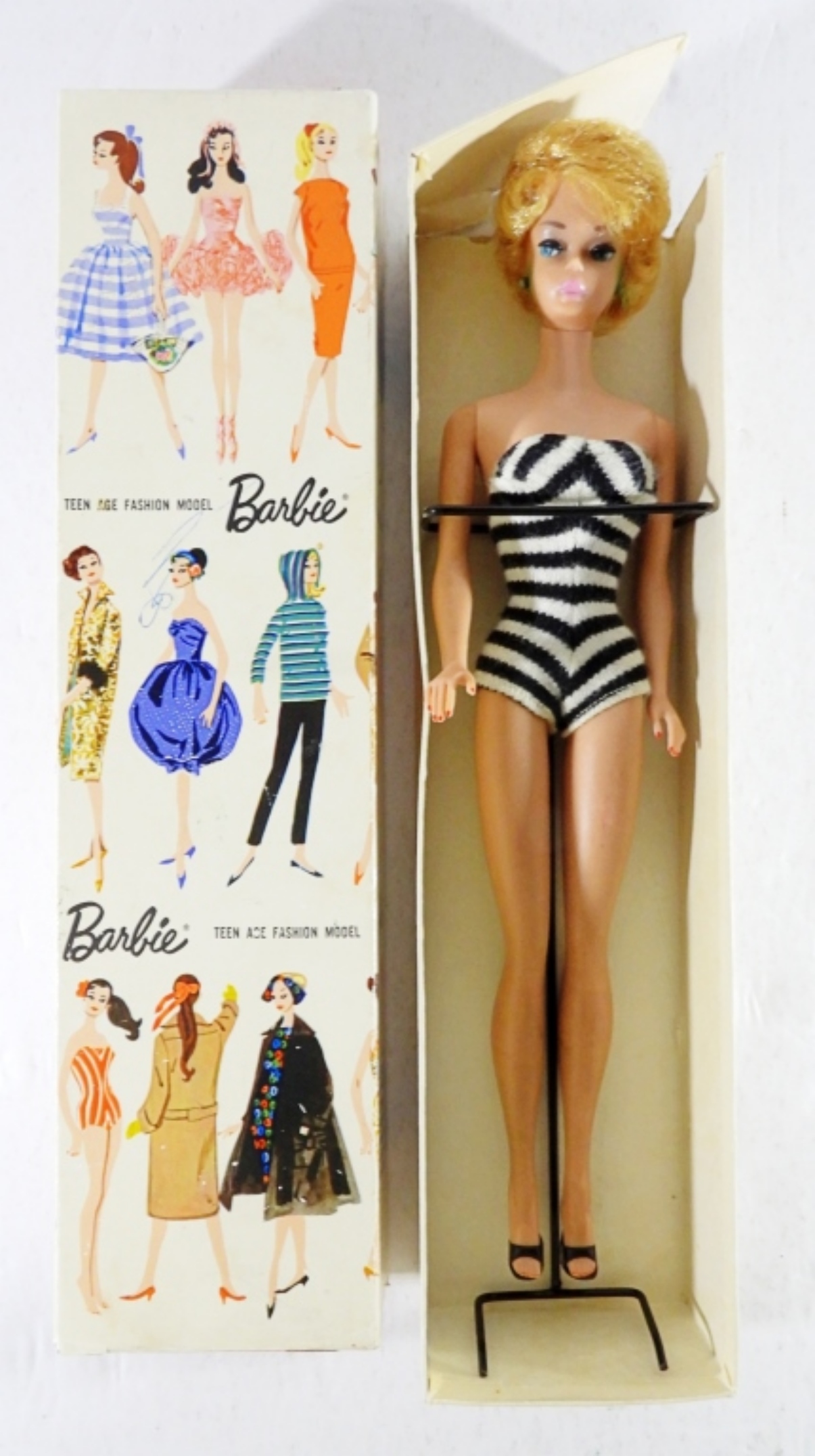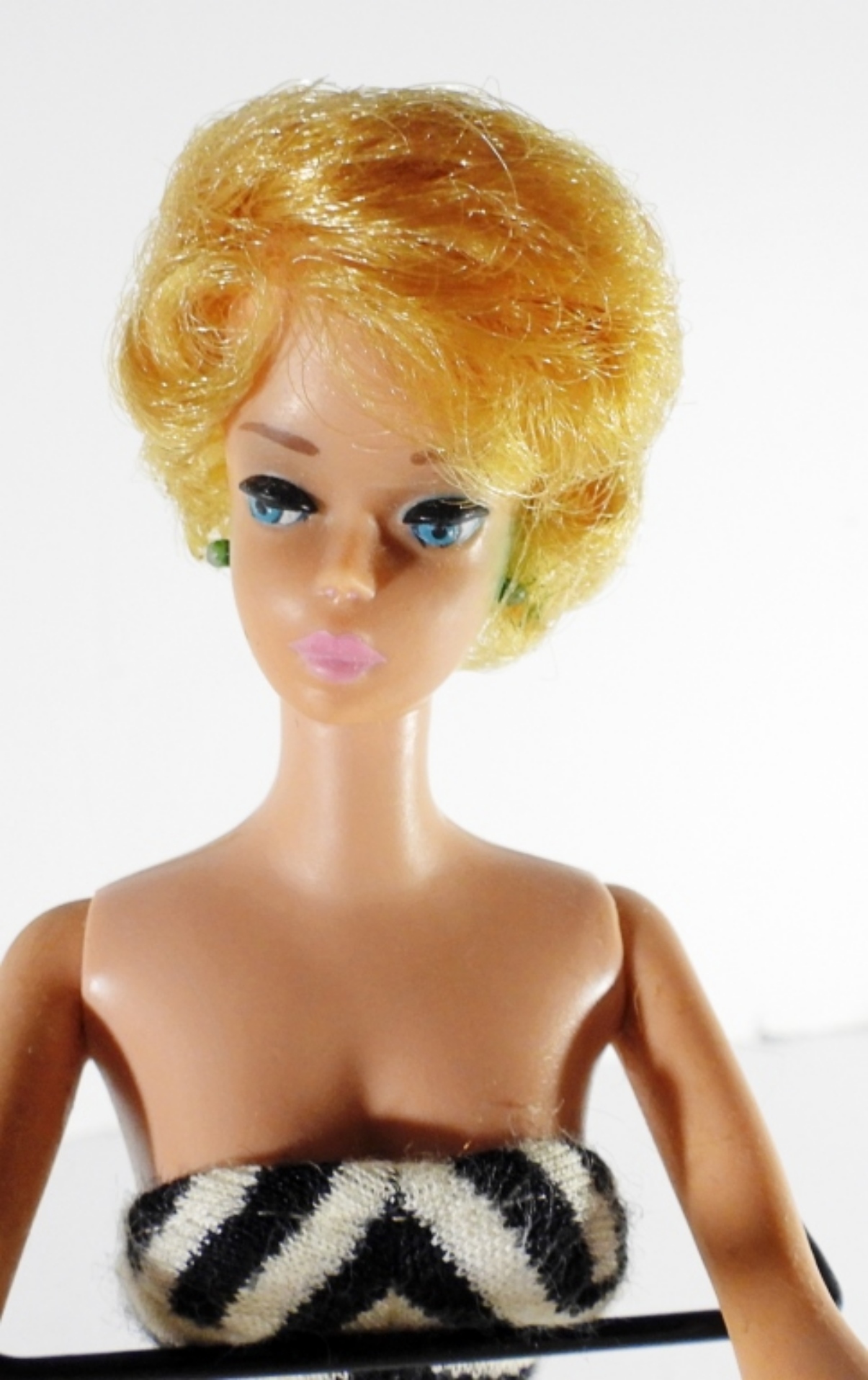 BY MATTEL, WITH PEDESTAL, GOOD CONDITION, WHITE GINGER BUBBLE CUT, STOCK NO. 850, IN ITS ORIGINAL BOX, HAS WORN OVER THE YEARS, THE DOLL IS WEARING A BLACK AND WHITE SWIMSUIT, AND EARRINGS WERE ADDED TO THE