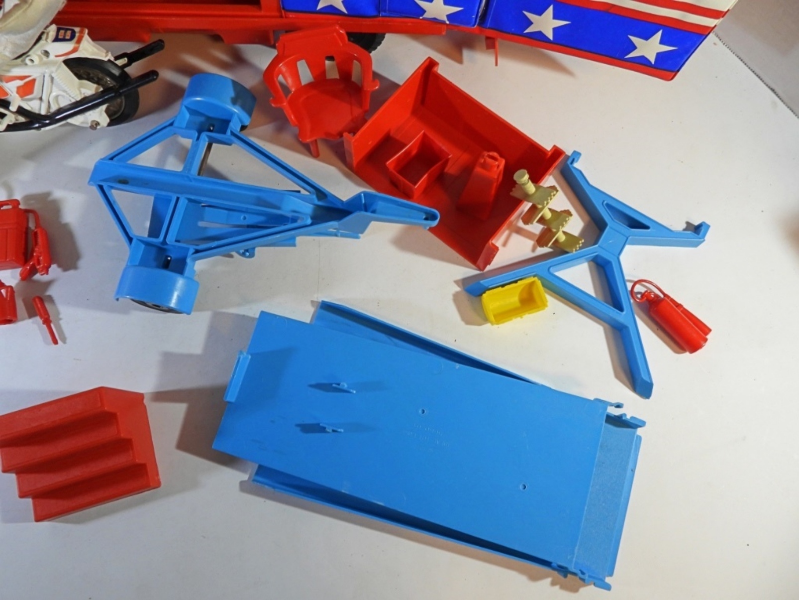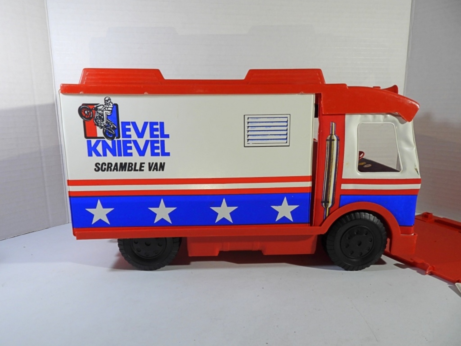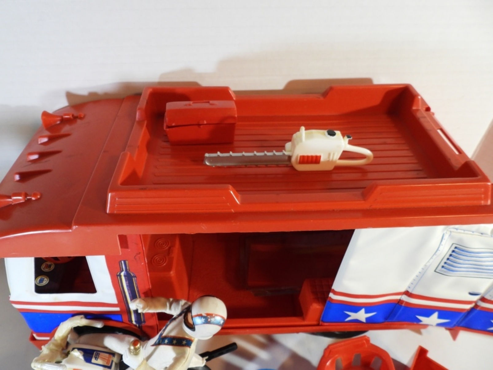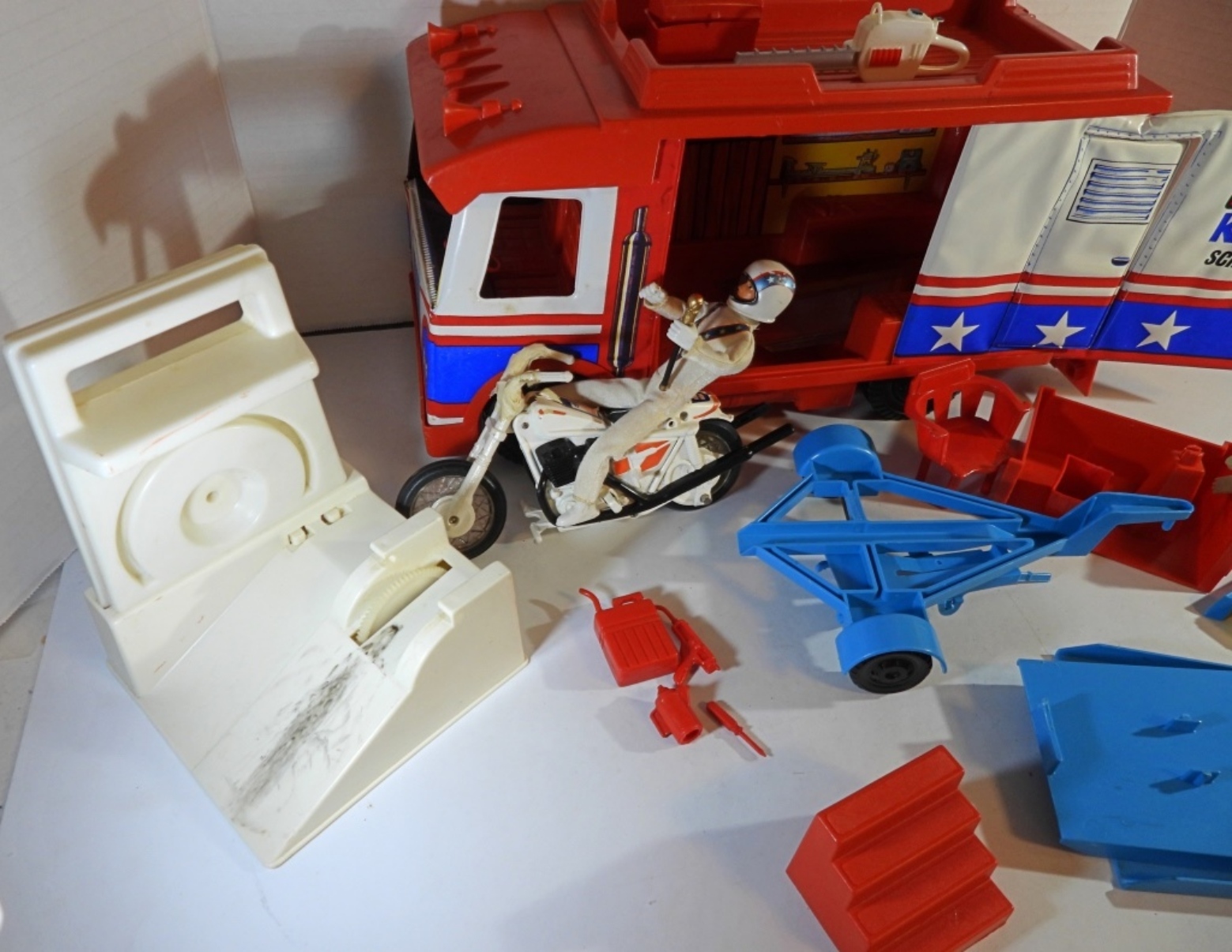 HAS EVEL KNIEVEL DOLL & BIKE & ACCESSORIES -UNSURE IF COMPLETE BUT LOOKS CLOSE – SHOWS WEAR – BIKE HANDLES BROKE – WINDSHIELD LOOSE on VAN – BACK GATE has SMALL PIECE MISSING