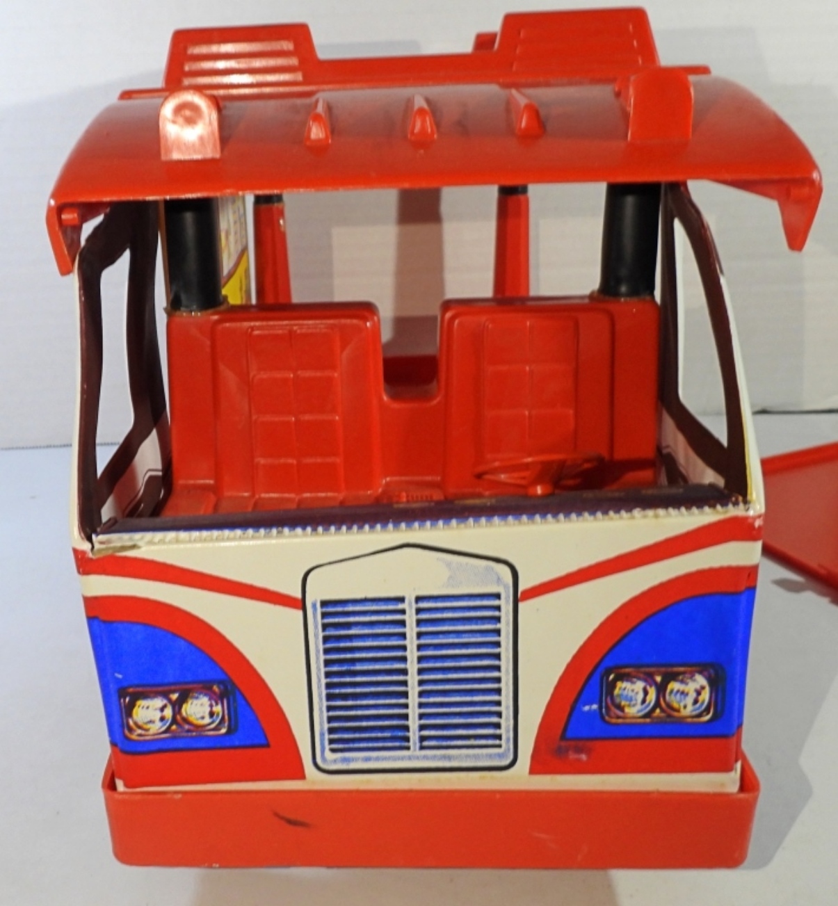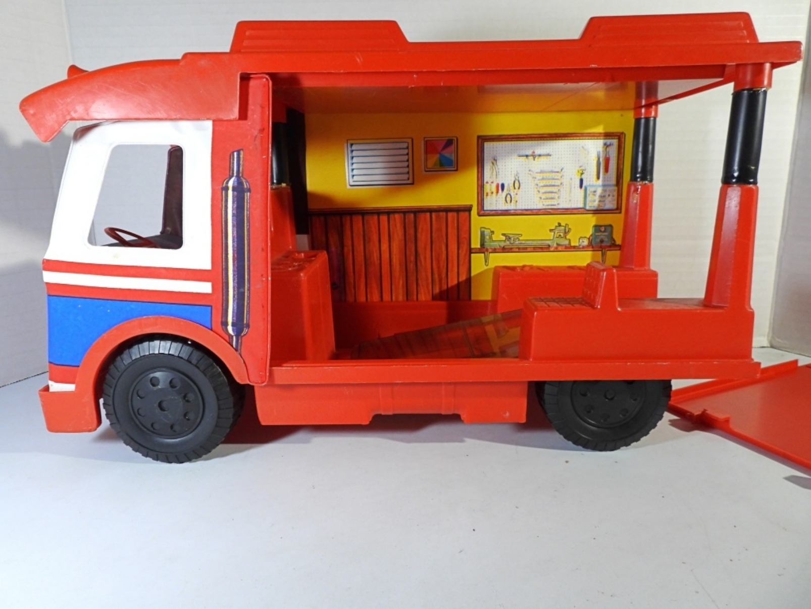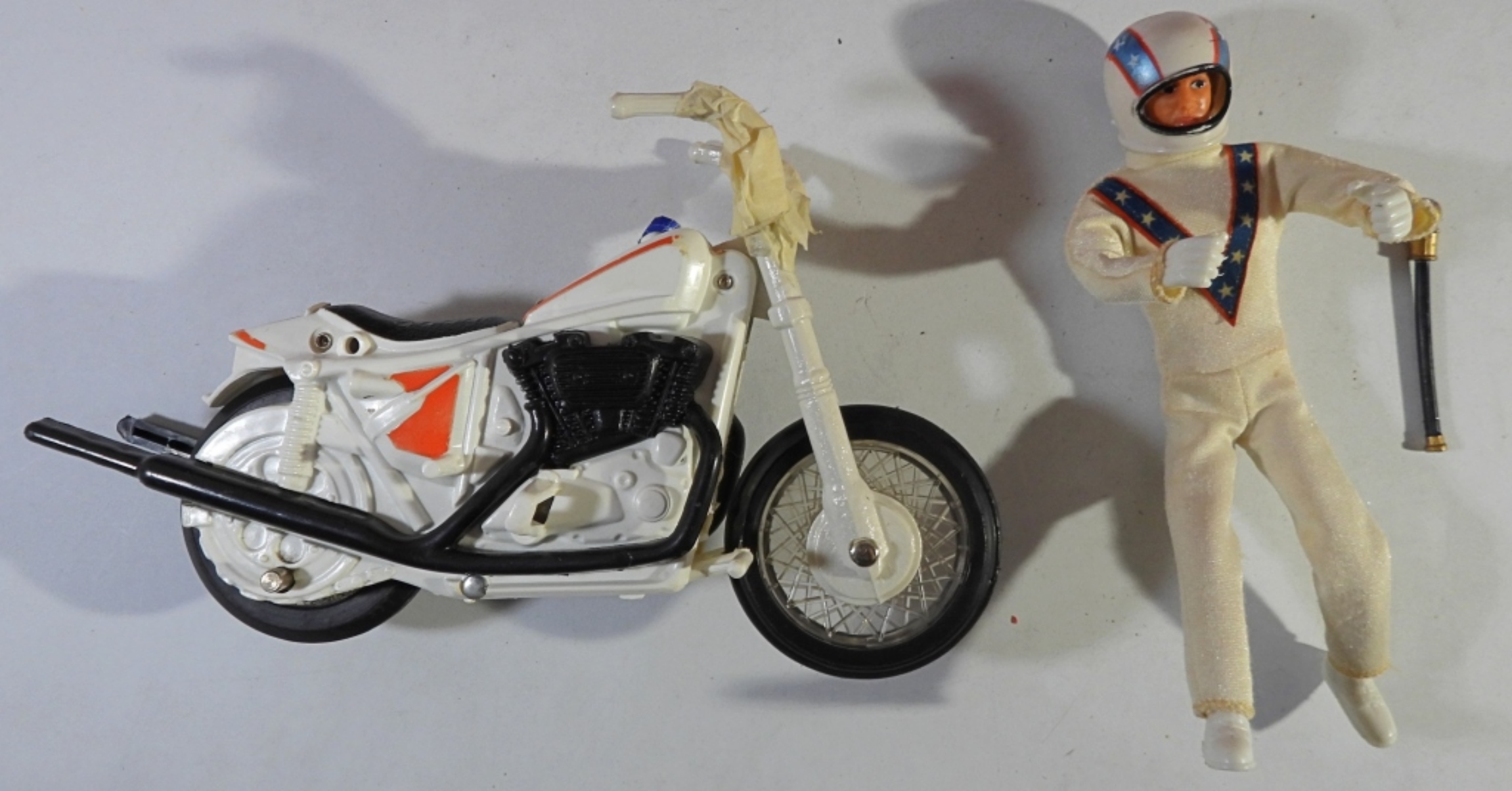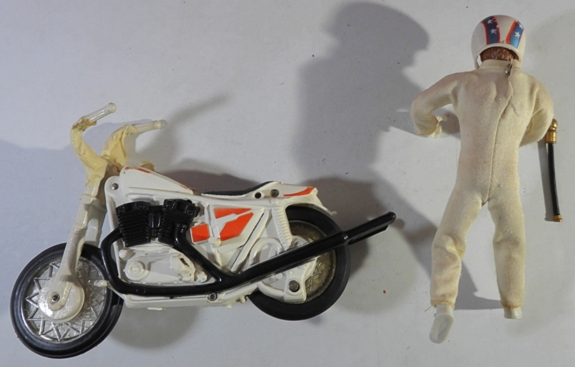 HAS EVEL KNIEVEL DOLL & BIKE & ACCESSORIES -UNSURE IF COMPLETE BUT LOOKS CLOSE – SHOWS WEAR – BIKE HANDLES BROKE – WINDSHIELD LOOSE on VAN – BACK GATE has SMALL PIECE MISSING