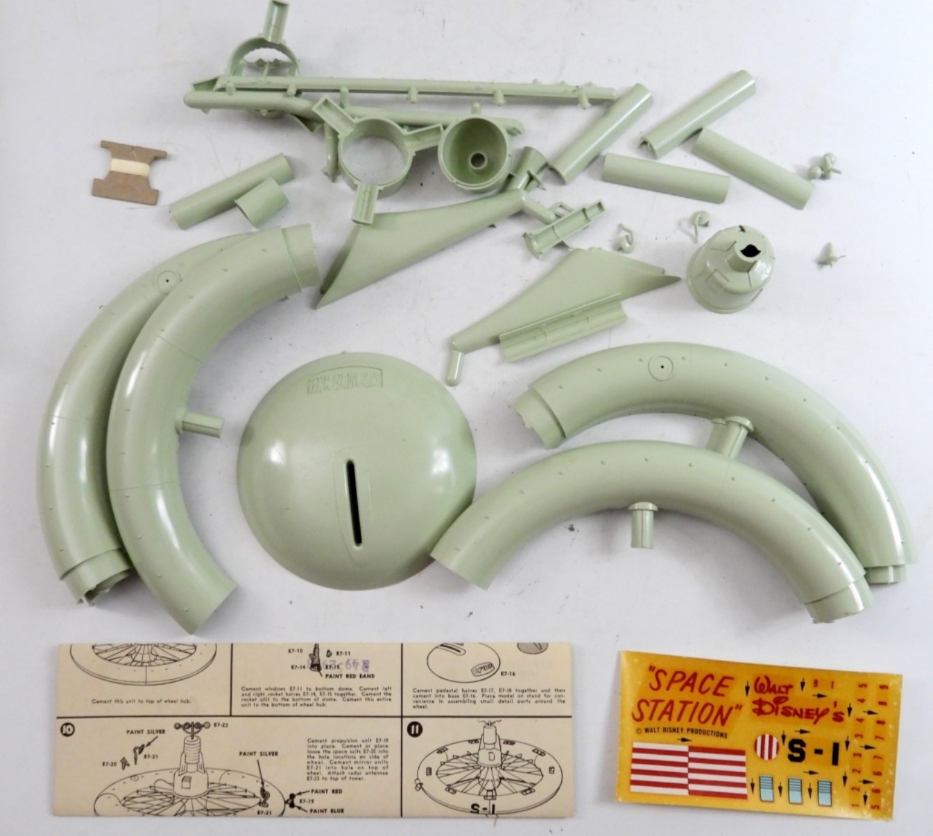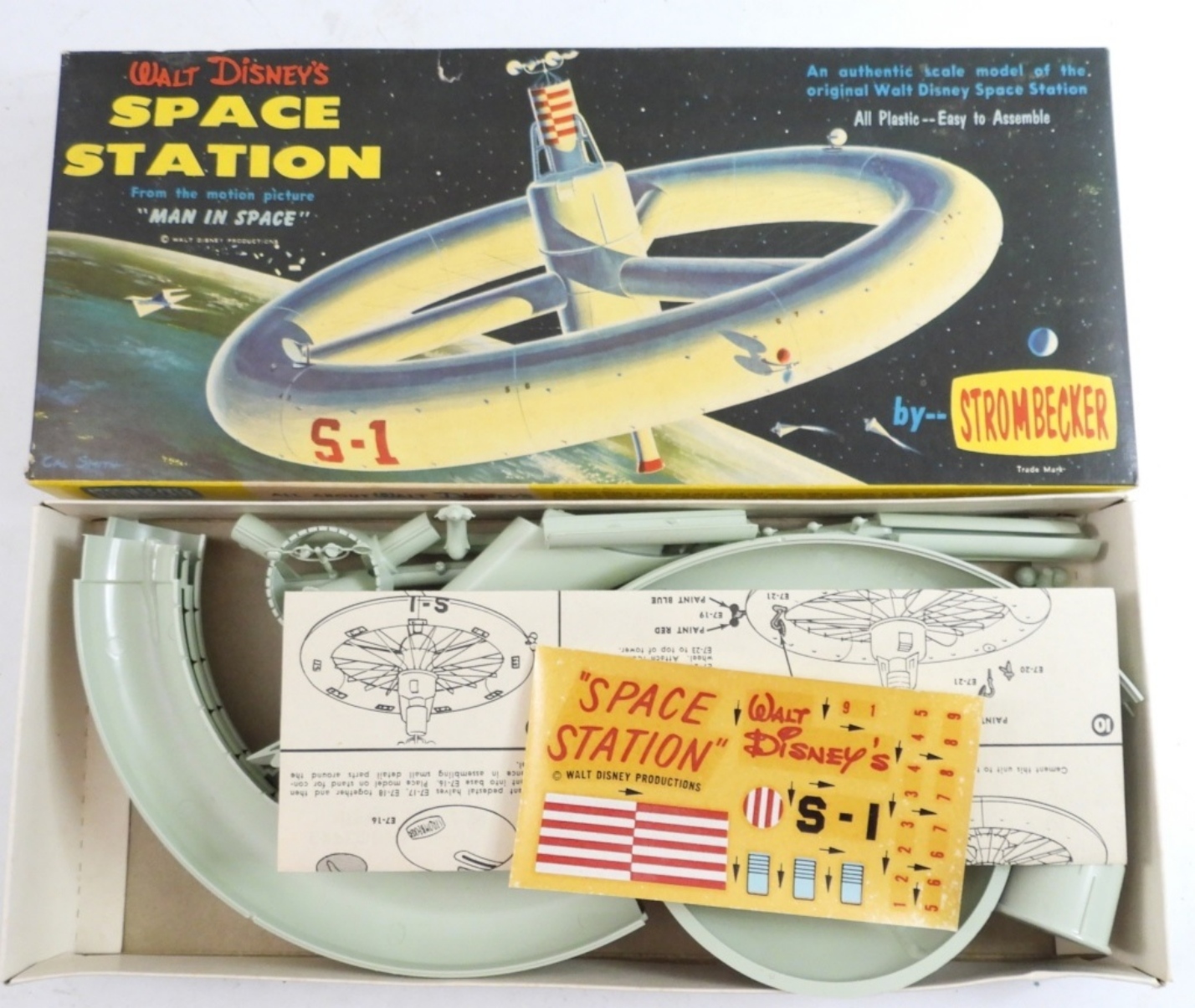 VINTAGE 1958 WALT DISNEY’S SPACE STATION STROMBECKER MODEL KIT. SEEMS TO HAVE ALL PIECES & STICKERS. SEE PHOTOS.