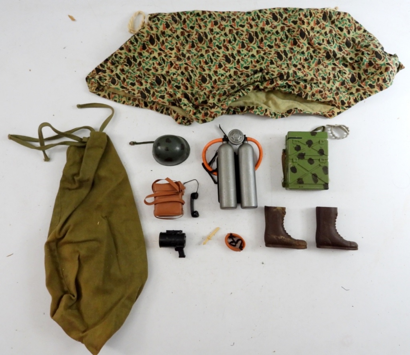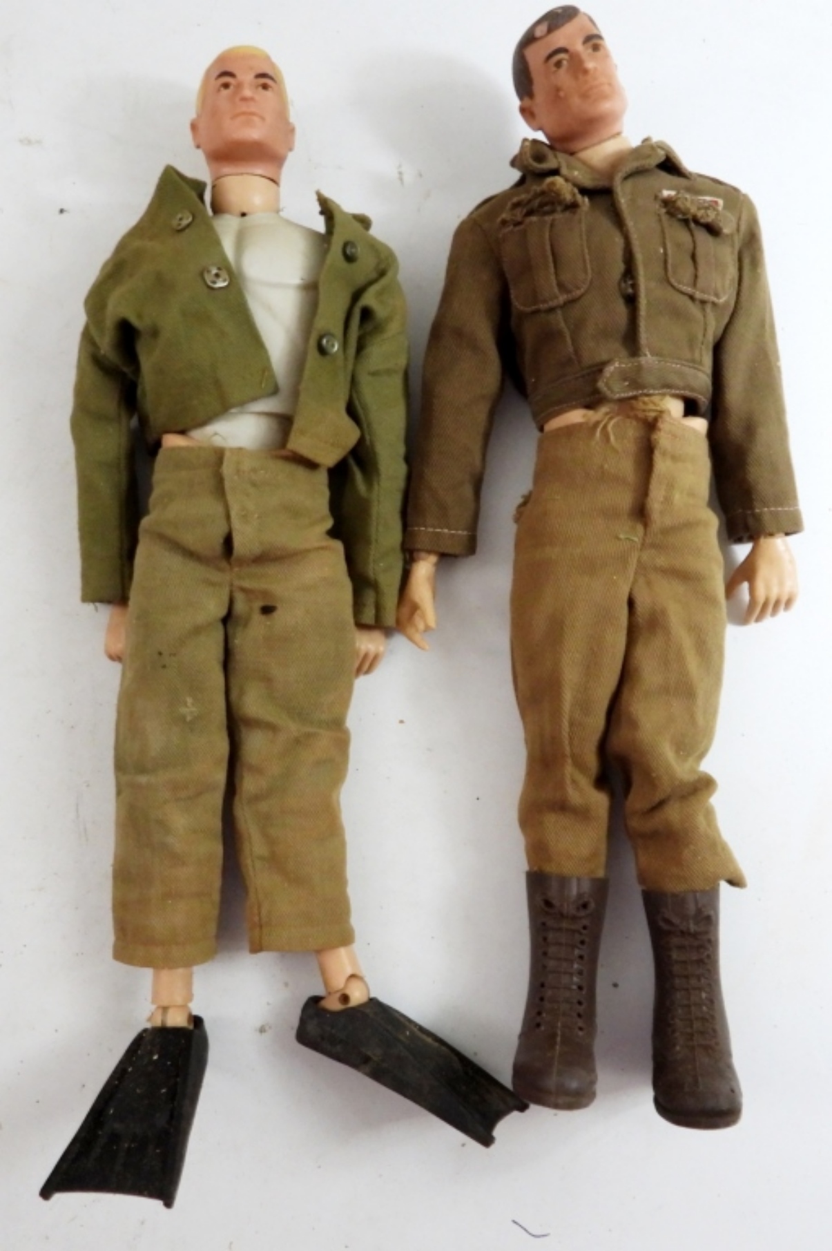 TWO VINTAGE 1964 G.I. JOE ACTION FIGURES WITH WAR ACCESSORIES. BLONDE HAS A SCAR ON HIS FACE. BRUNETTE HAS SOME SMALL CHUNKS TAKEN FORM HIS FACE. SEE PHOTOS
