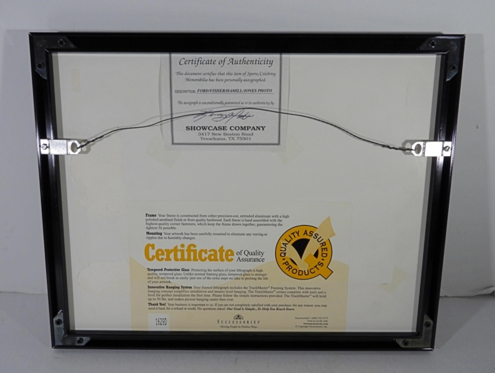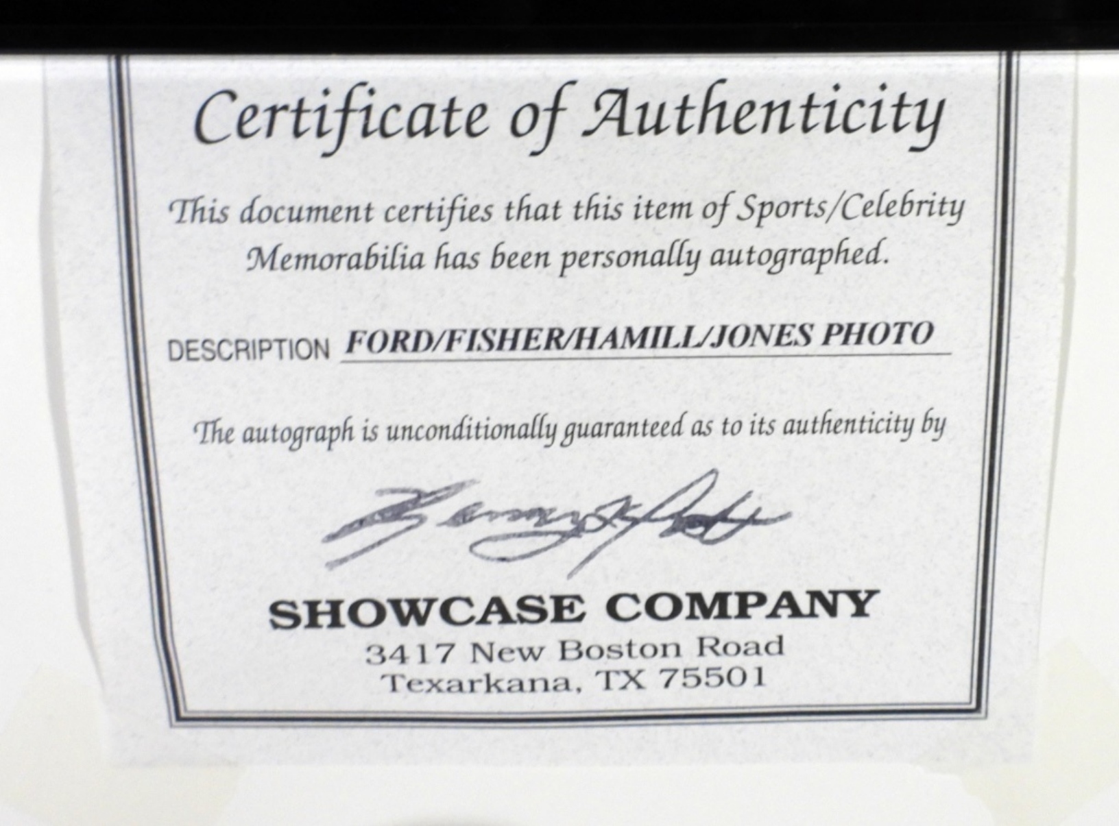 AUTOGRAPH BY FORD, FISHER, HAMILL AND JONES, COA FROM SHOWCASE COMPANY IN TEXARKANA TX, PHOTO IS FRAMED
