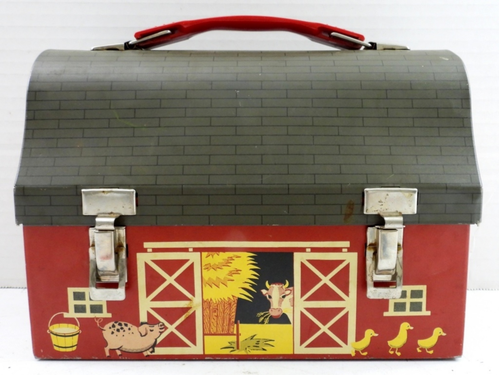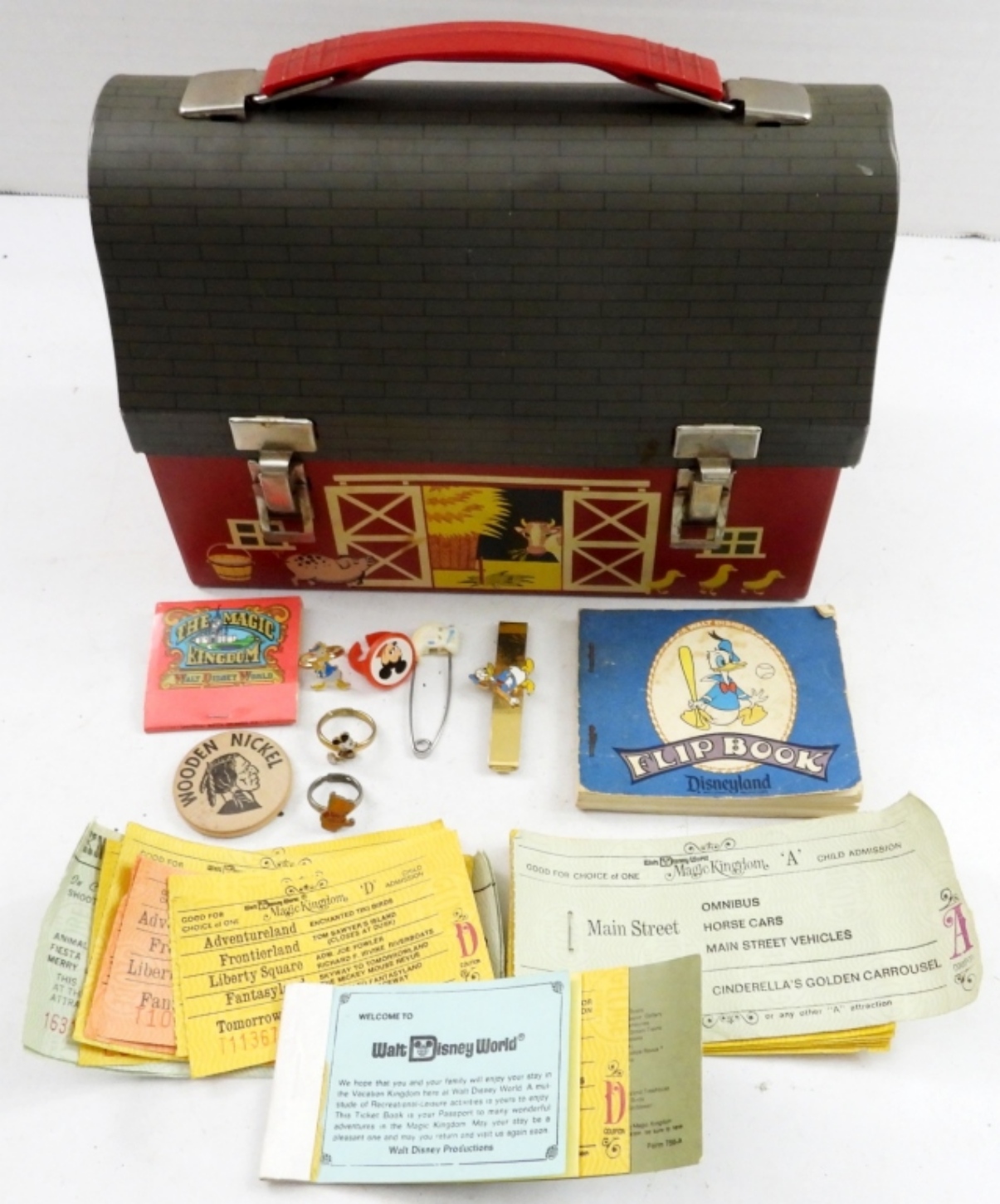VINTAGE RED BARN LUNCHBOX IN GOOD CONDITION WITH VARIOIUS DISNEY MEMORABILIA INSIDE. PLEASE SEE PHOTOS.