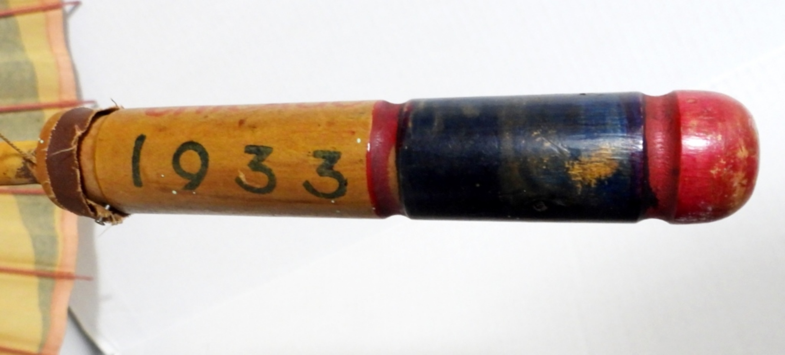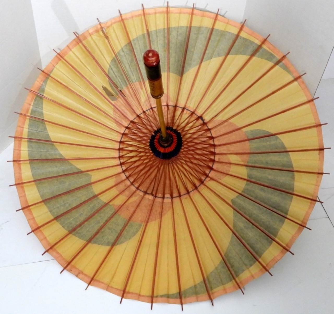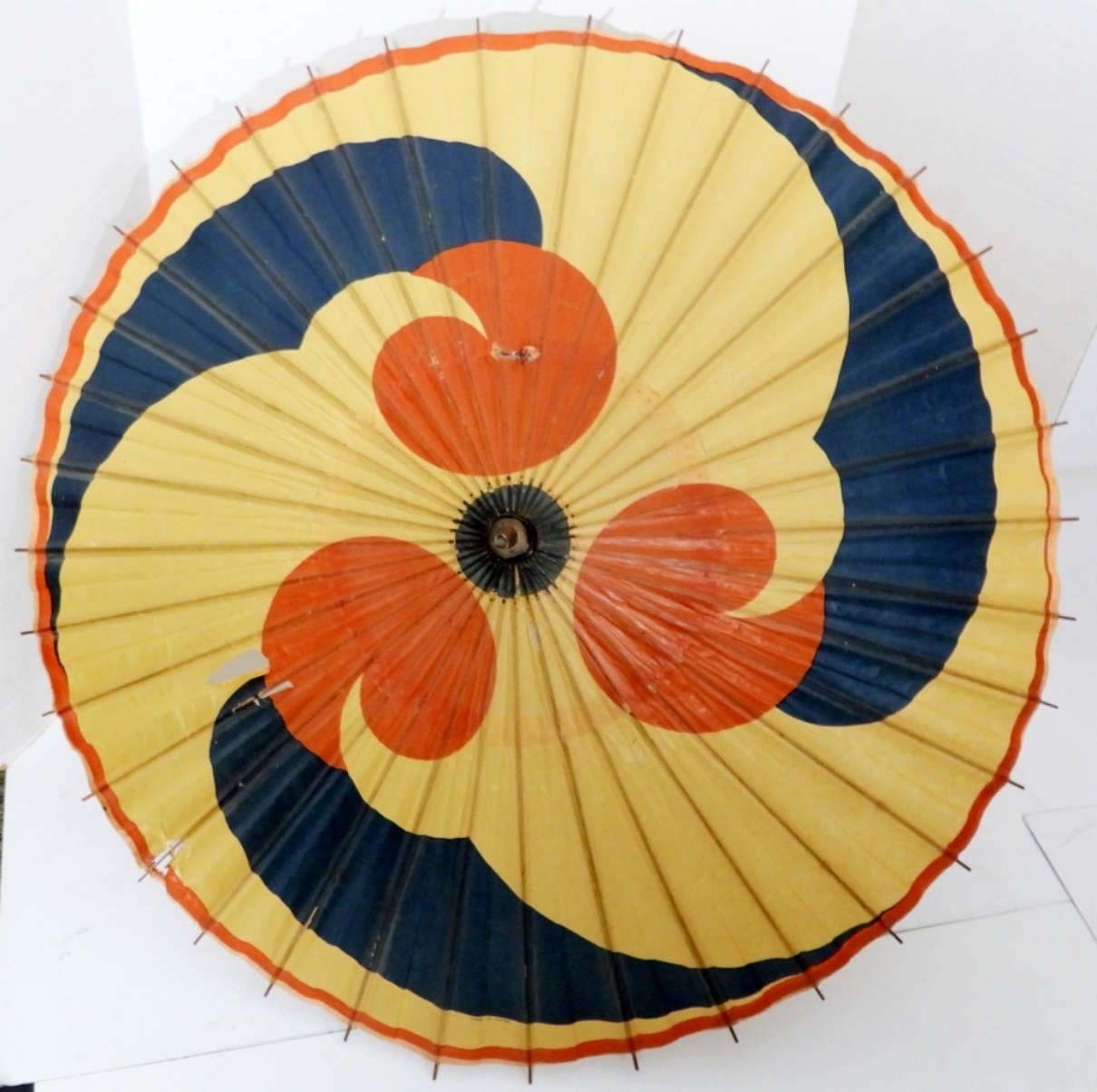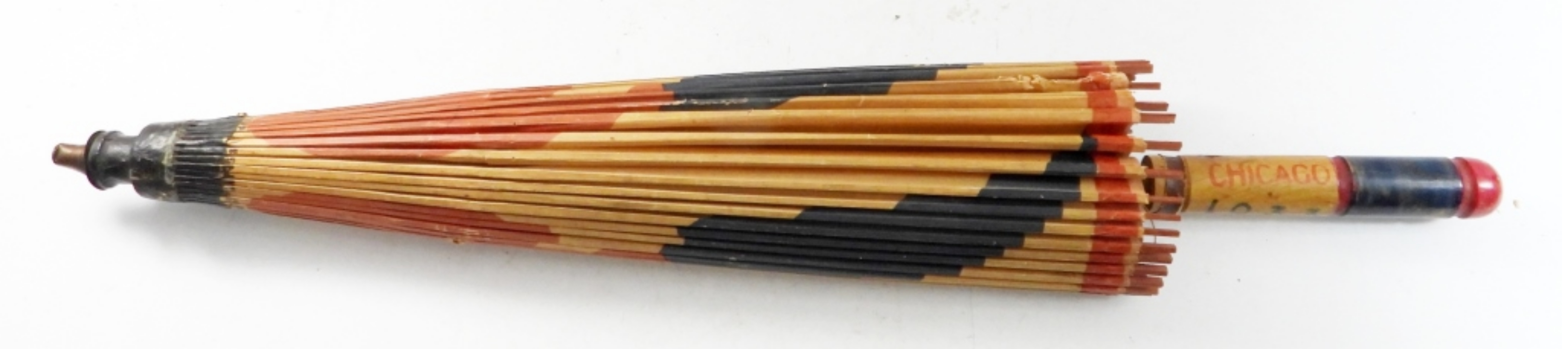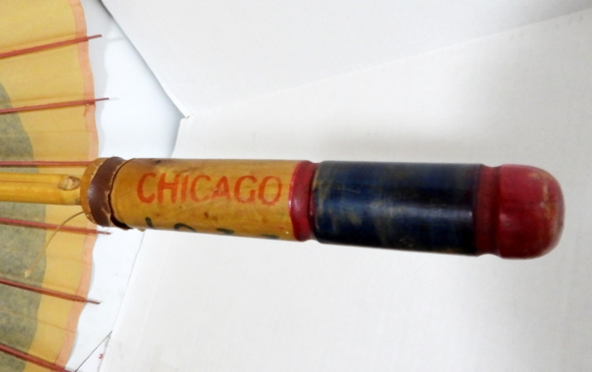 1933 CHICAGO WORLDS FAIR RICE PAPER 32″ PARASOL. DOES HAVE A FEW TEARS, BUT IN OVERALL GOOD CONDITION AND OPENS!