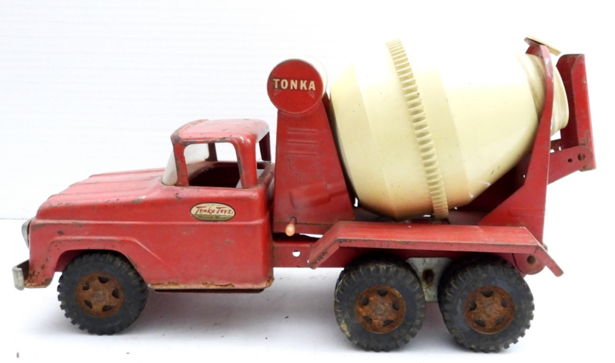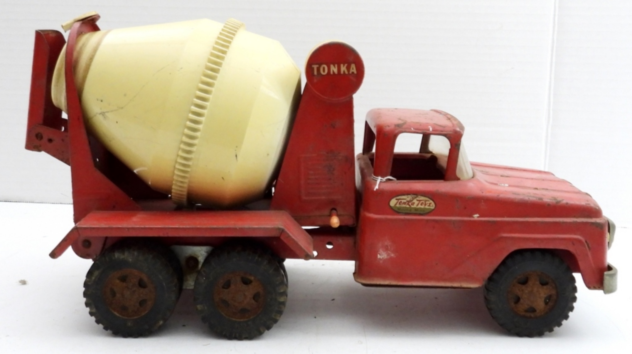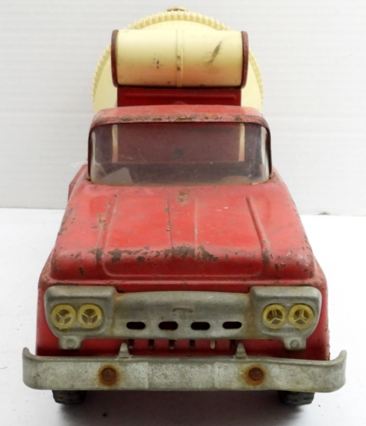 VINTAGE 1960’s TONKA CEMENT MIXER TRUCK. MISSING ONE PIECE. HAS SOME RUST BUT IN OVERALL GOOD SHAPE. 14″ x 6″.